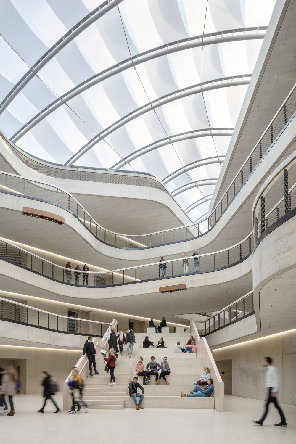 Offene Lernzonen, Selbstlernzentrum/Bibliothek, Flure, Schulhof, Cafeteria, die angrenzende Kirche St. Johannes XXIII und insbesondere in dem pulsierenden Herz der Begegnungen - das Atrium.