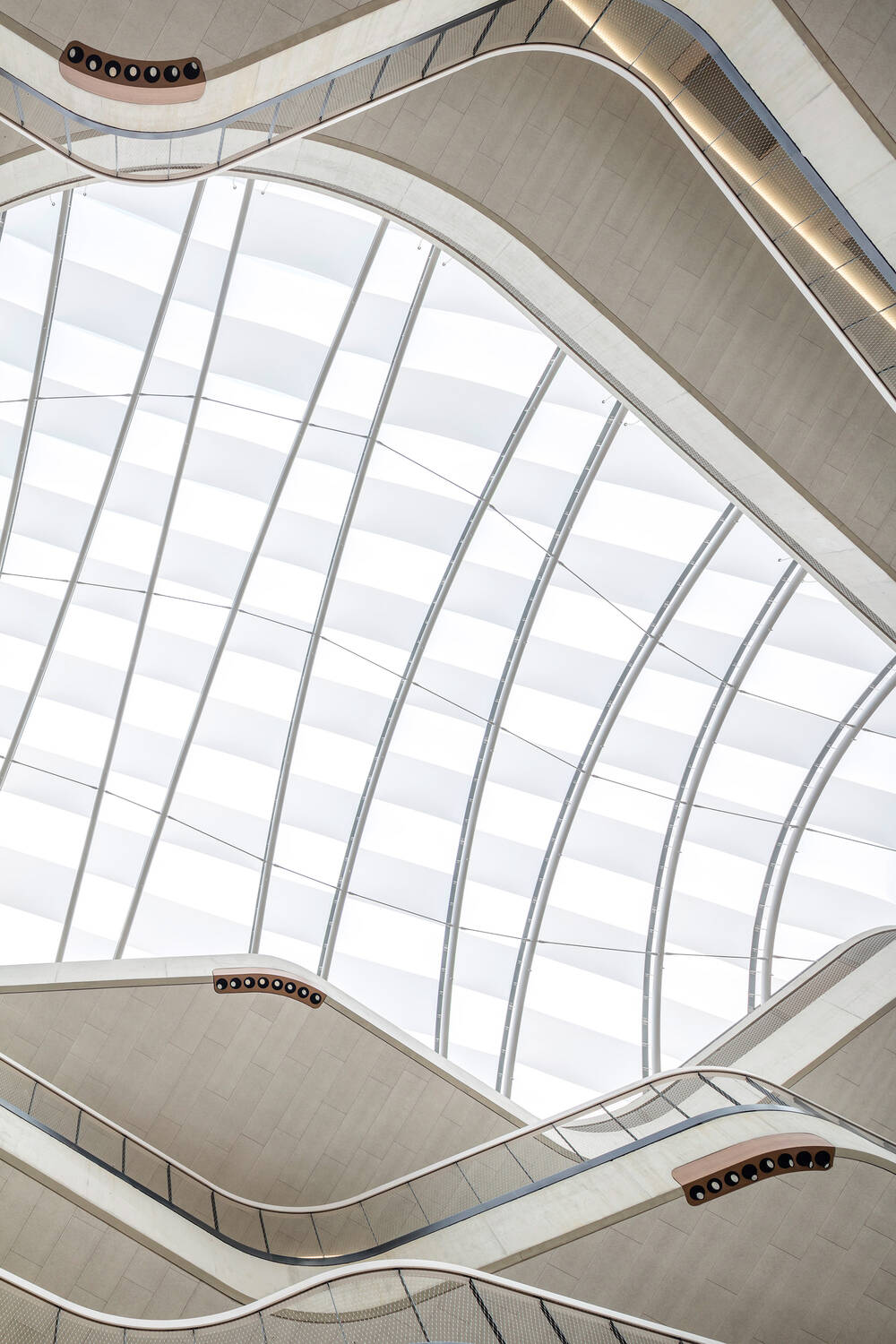Das Dachgewölbe scheint überspannt von gewebten Wellen, Wolkenbilder lassen sich durch die linsenförmigen Öffnungen beobachten. Bewegung ist das vorherrschende Motiv des Innenraums, In-Bewegung-Sein und Sich-bewegen-Lassen ist das Motiv derer, die sich die Welt erschließen und diese mit anderen teilen und gestalten.