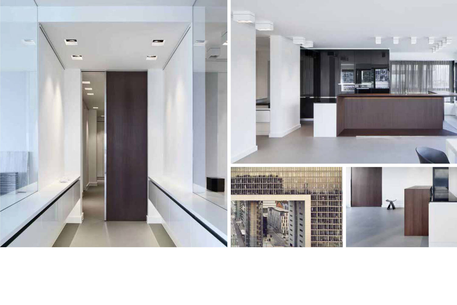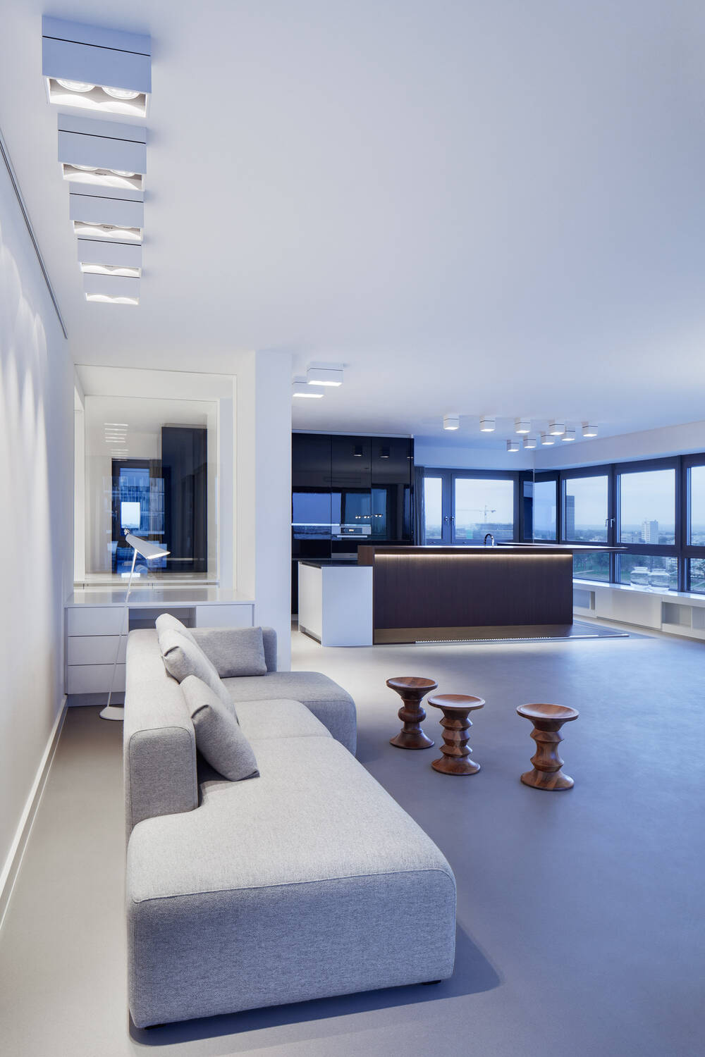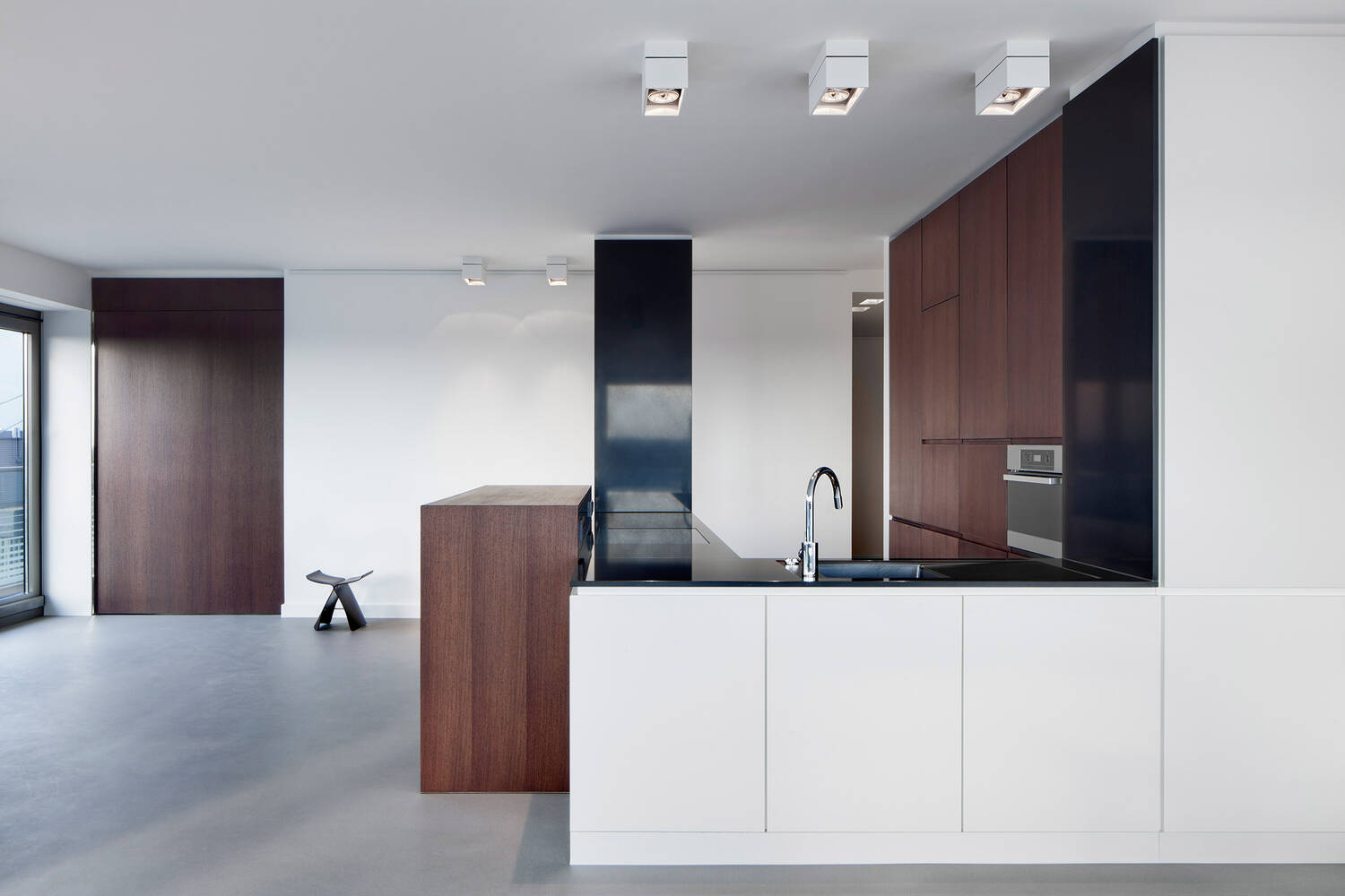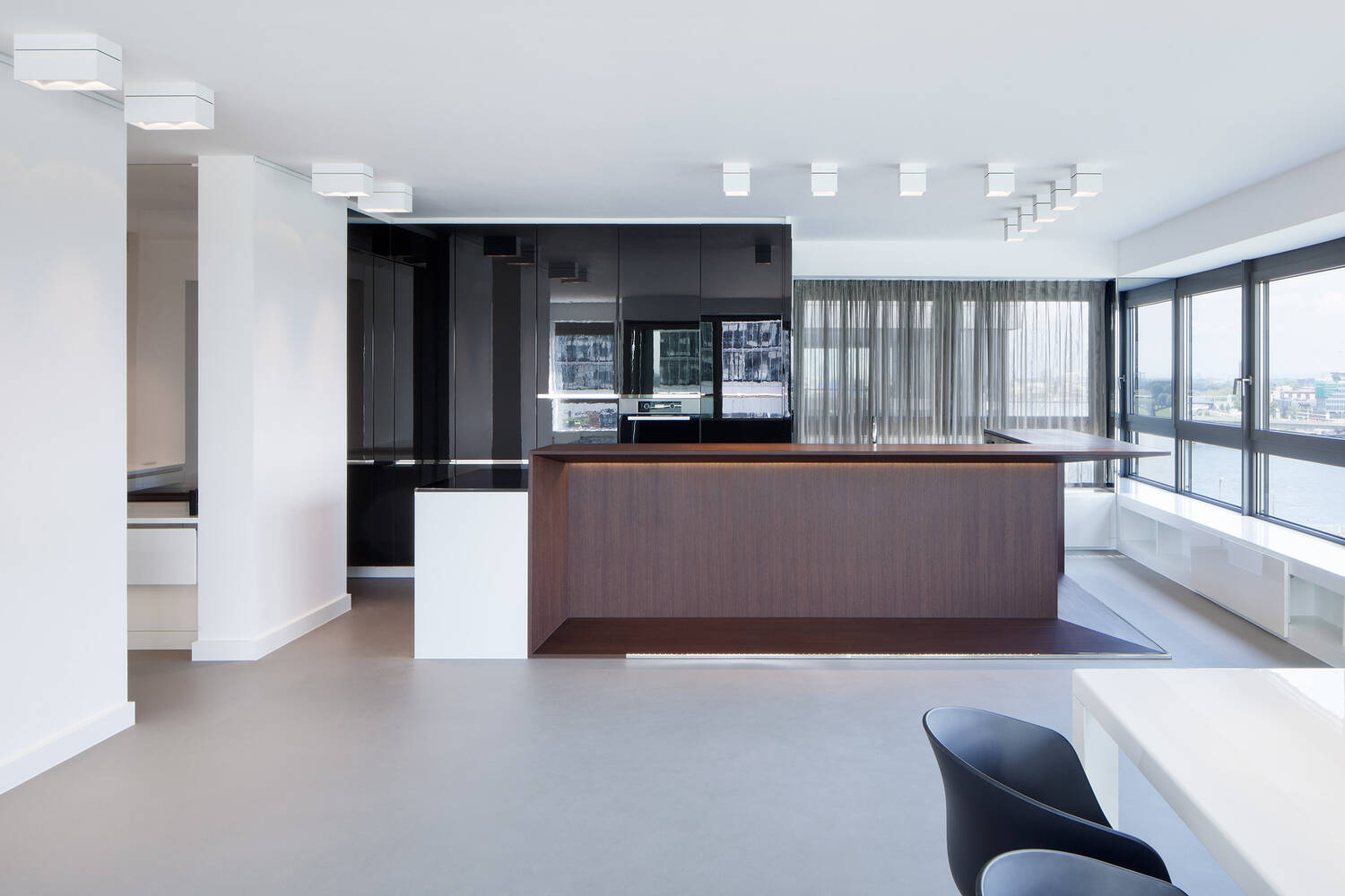 Die ursprünglichen Raumgrenzen werden gelöst und schaffen so eine neue Struktur, die sich intuitiv zeigt und leitet. Die offene Küchensituation wird zum Herzstück des Wohnens. Dort herum gruppieren sich die übrigen Raumformationen. Immer erscheinen die Räume in einem begreiflichen Miteinander, einem geordneten, einheitlichen Ganzen. Blickbeziehungen und Lichtsituation bleiben im Inneren jederzeit erlebbar. Die Raumgrenzen fließen und bieten durch diese Offenheit Beweglichkeit, Veränderung und Selbstbestimmtheit.