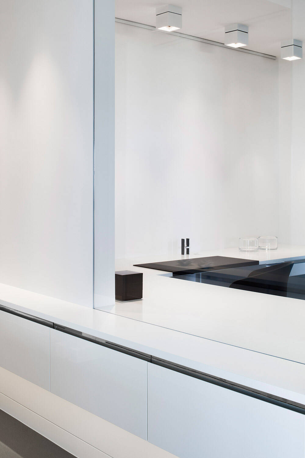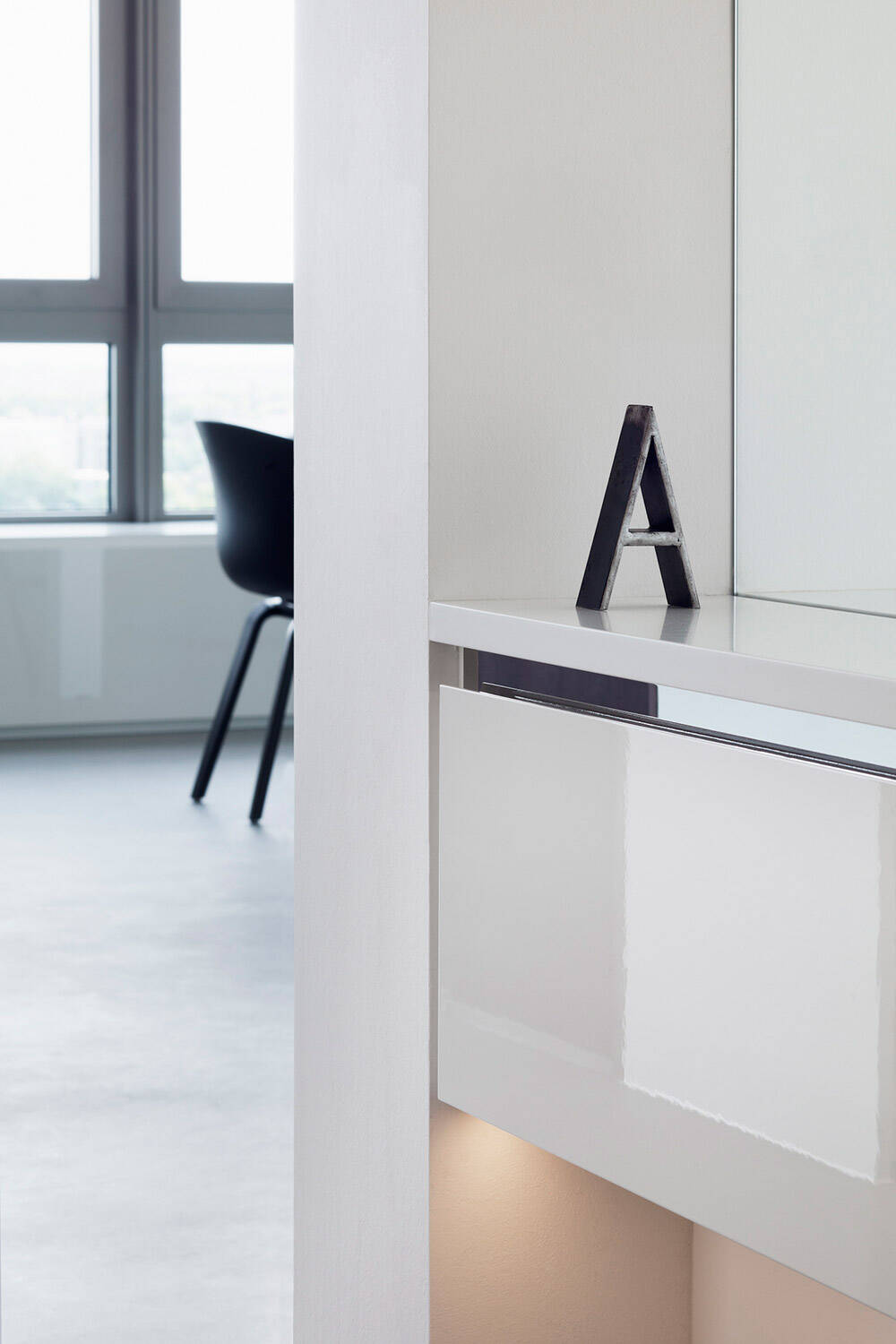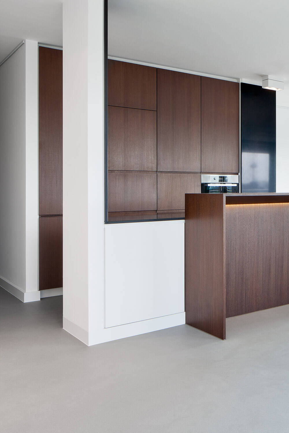 Die ursprünglichen Raumgrenzen werden gelöst und schaffen so eine neue Struktur, die sich intuitiv zeigt und leitet. Die offene Küchensituation wird zum Herzstück des Wohnens. Dort herum gruppieren sich die übrigen Raumformationen. Immer erscheinen die Räume in einem begreiflichen Miteinander, einem geordneten, einheitlichen Ganzen. Blickbeziehungen und Lichtsituation bleiben im Inneren jederzeit erlebbar. Die Raumgrenzen fließen und bieten durch diese Offenheit Beweglichkeit, Veränderung und Selbstbestimmtheit.