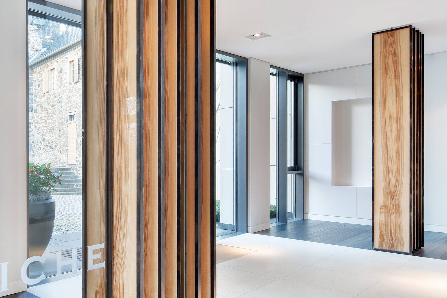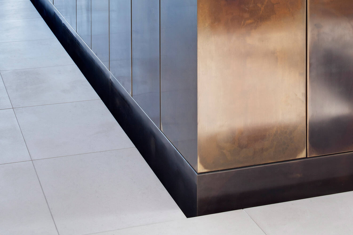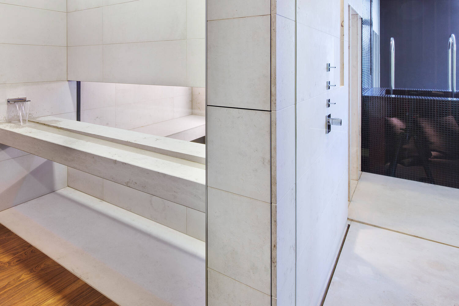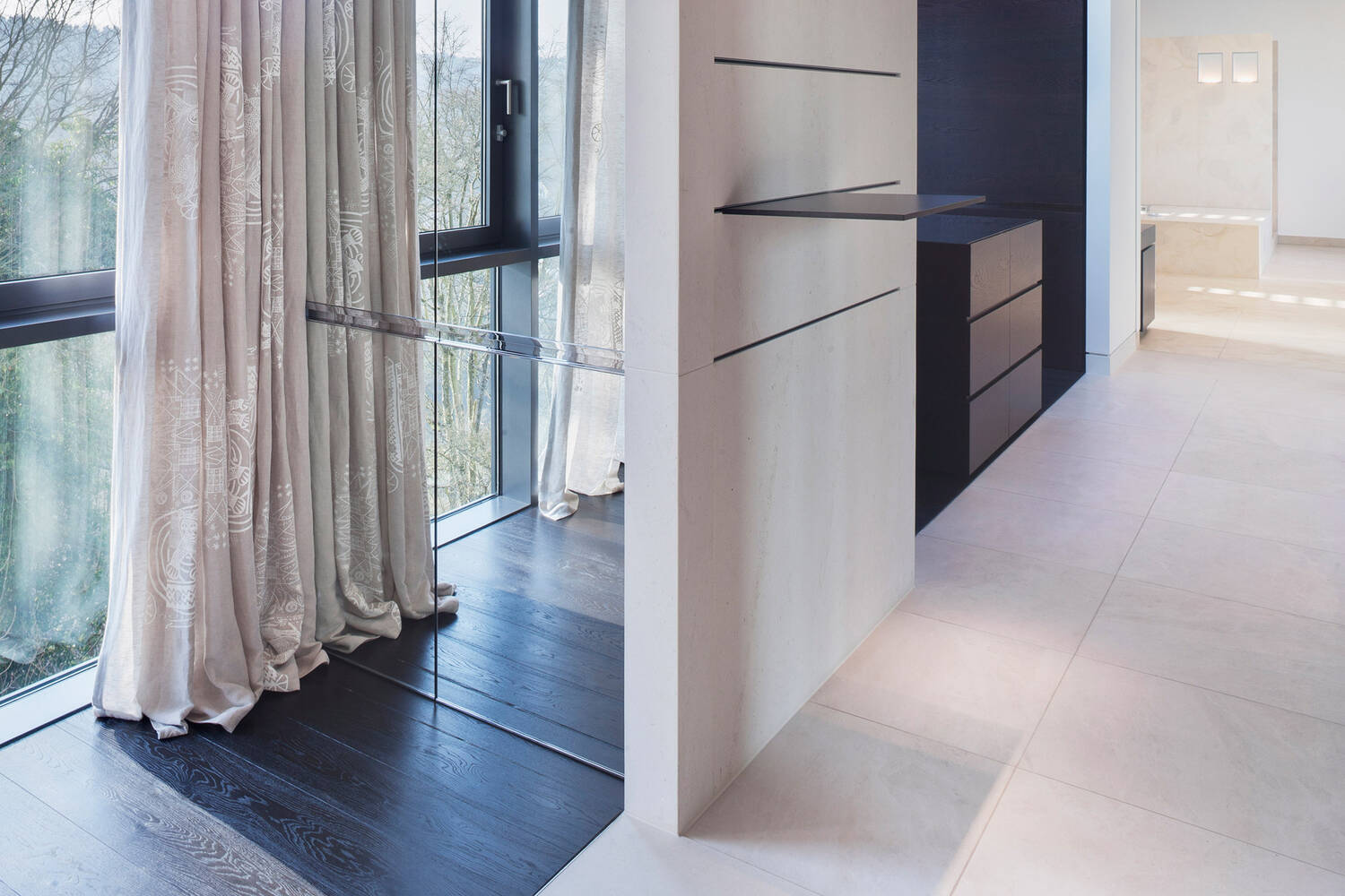 Das Obergeschoss beinhaltet die Bereiche der Privatheit und der Regeneration. Das Erdgeschoss, bespielt mit den Flächen, die der Kommunikation dienen und den Service aufnehmen, präsentiert sich markant und räumlich großzügig. Einer Bühne gleich, erweitert es sich über großflächige Fensterflächen in den Außenraum. Im Souterrain des Neubaus befindet sich der Wellnessbereich, dessen Absicht zur Regeneration offensichtlich inszeniert wird.