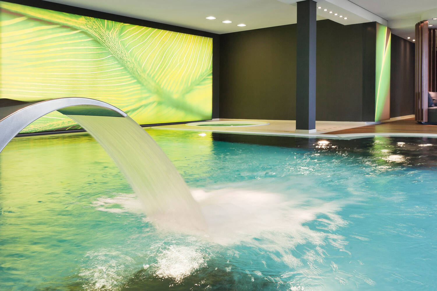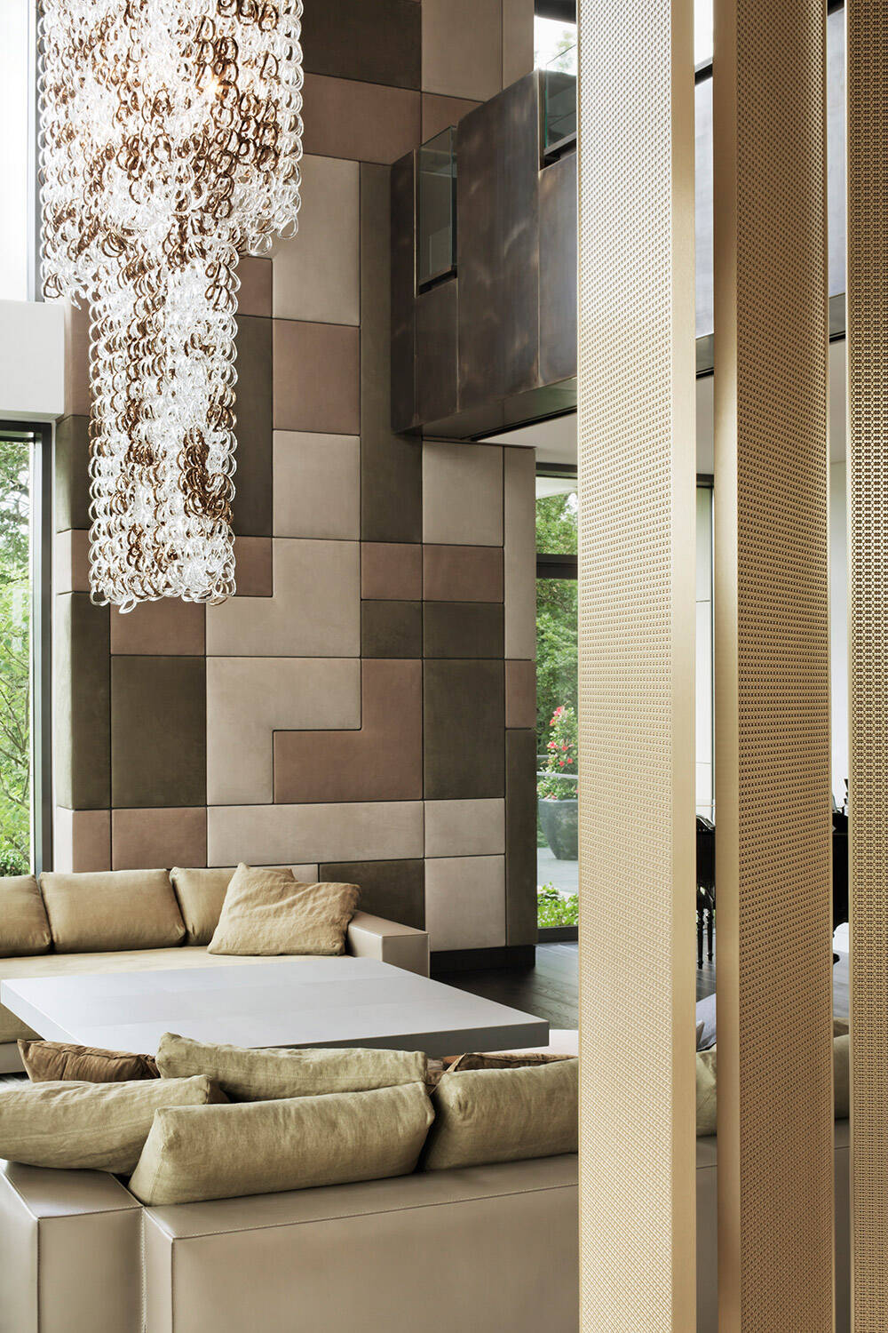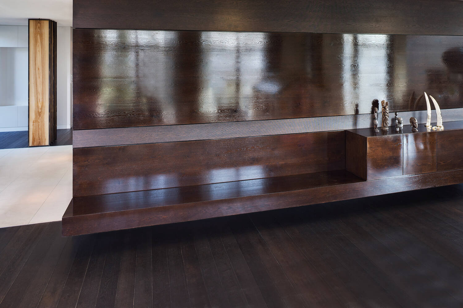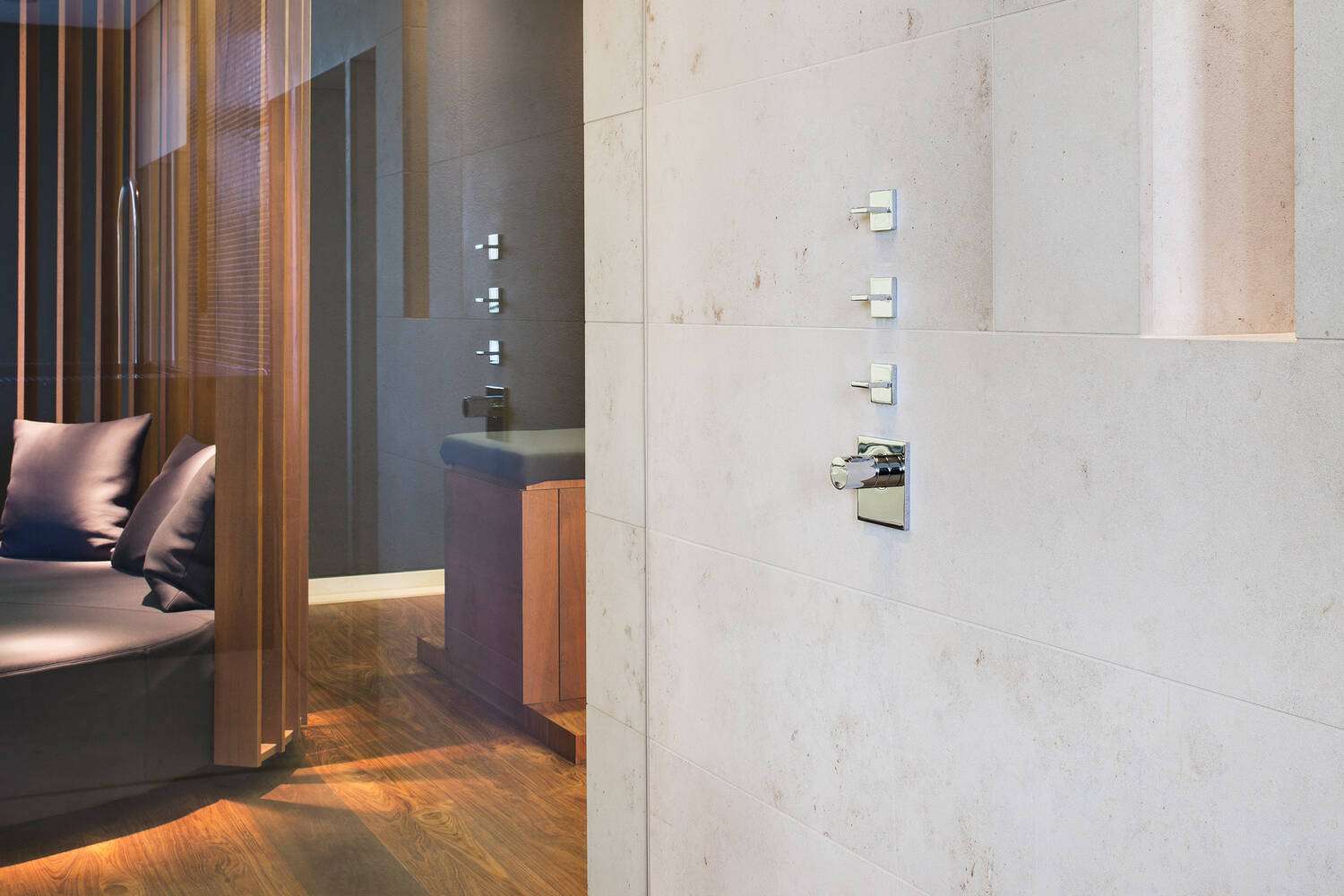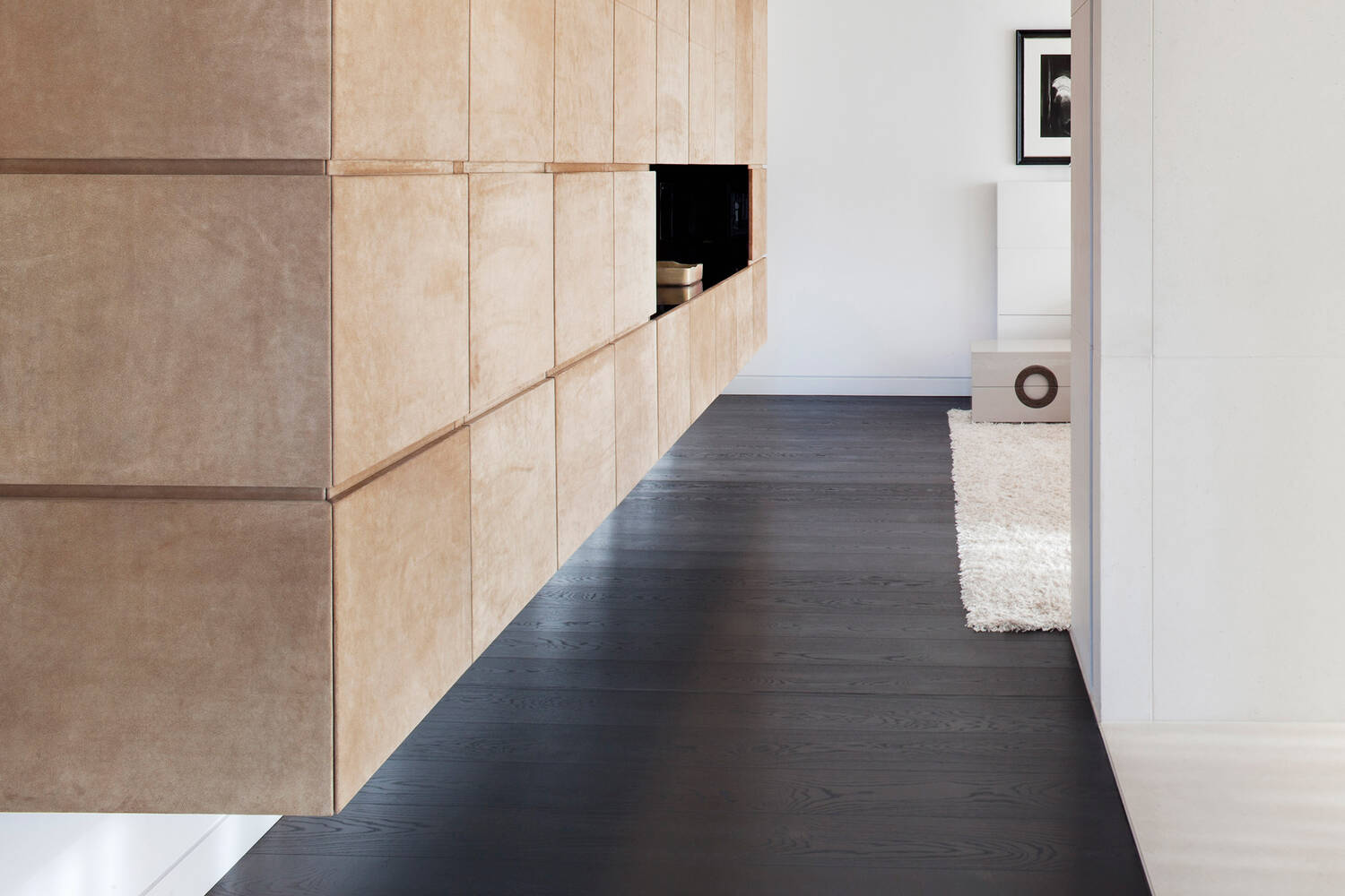 Das Obergeschoss beinhaltet die Bereiche der Privatheit und der Regeneration. Das Erdgeschoss, bespielt mit den Flächen, die der Kommunikation dienen und den Service aufnehmen, präsentiert sich markant und räumlich großzügig. Einer Bühne gleich, erweitert es sich über großflächige Fensterflächen in den Außenraum. Im Souterrain des Neubaus befindet sich der Wellnessbereich, dessen Absicht zur Regeneration offensichtlich inszeniert wird.
