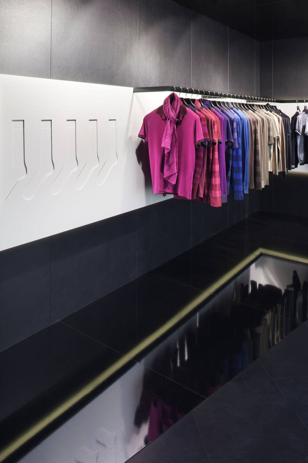Die konzeptionelle Basis des Segmentes BLACK zielt auf Konsumenten, deren persönliche Affinität gleichzusetzen ist mit edel, pur, schlicht, urban und sexy. Die Materialität der Umgebung definiert sich über Metall, die Systematik der Zuordnung weist eine präzise Ordnung auf, die Struktur ist als additive Reihung erkennbar und die Darstellung ist als Klammer großflächig zu verstehen. Der atmosphärische Eindruck ist ruhig und gelassen, die Ausarbeitung der Details ist präzise, perfektioniert und linear. Zusammenfassend zeigt sich, dass Modernität, Zeitlosigkeit und Klarheit die wichtigsten Parameter sind — ein eigener, selbstsicherer Stil.