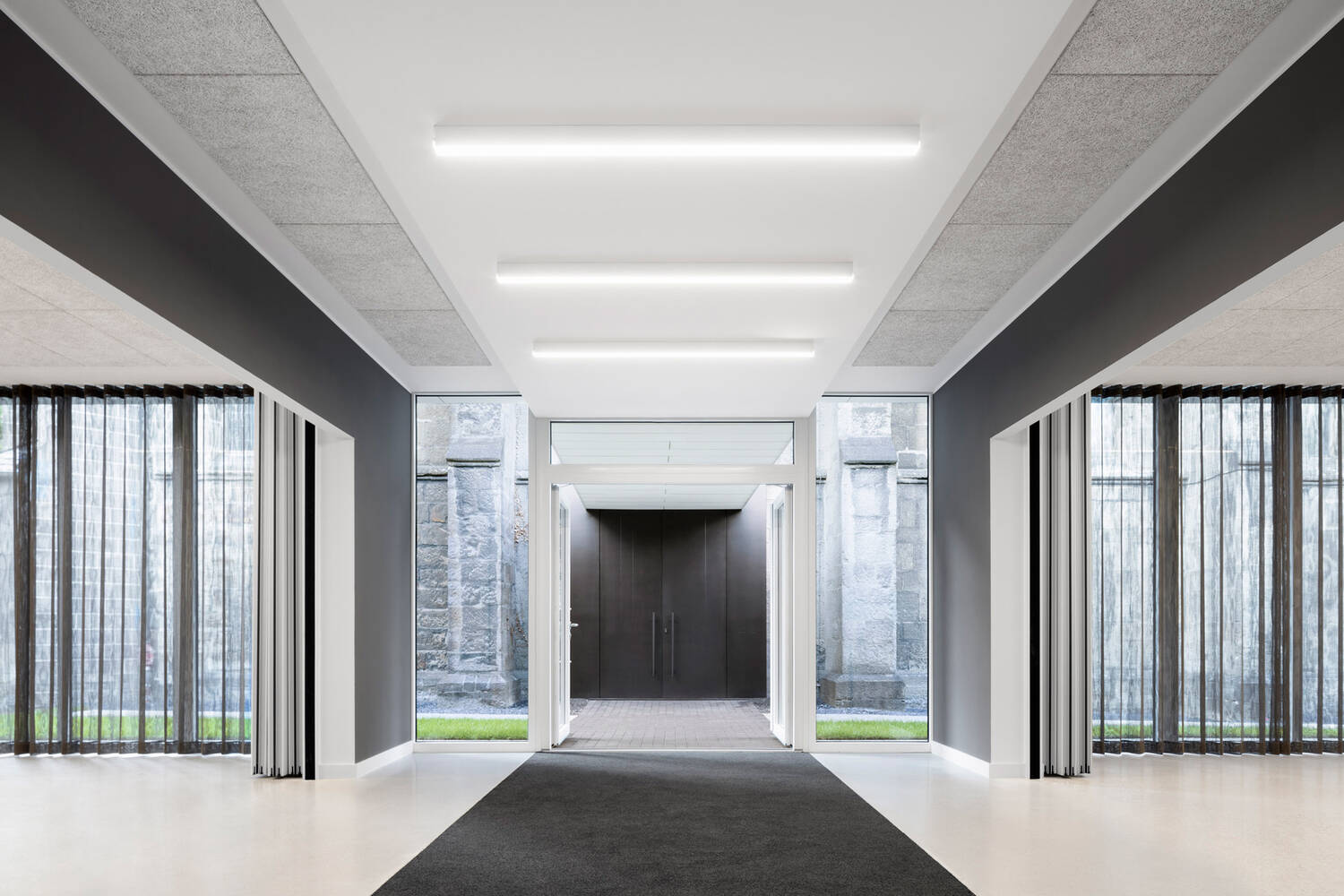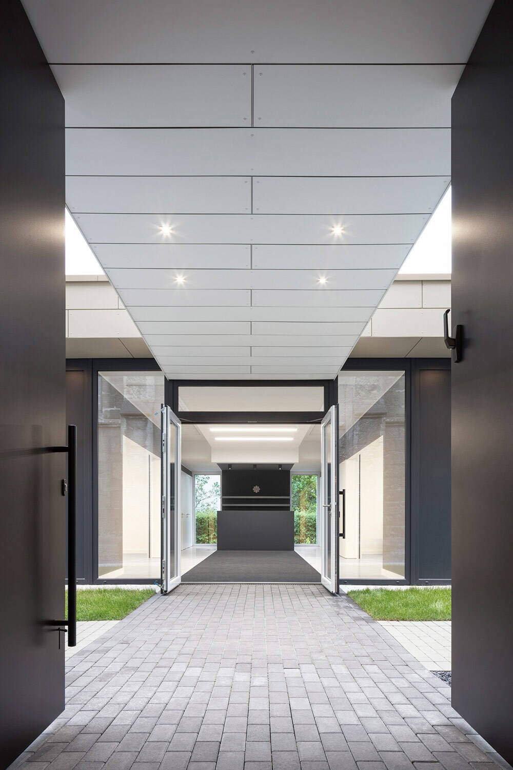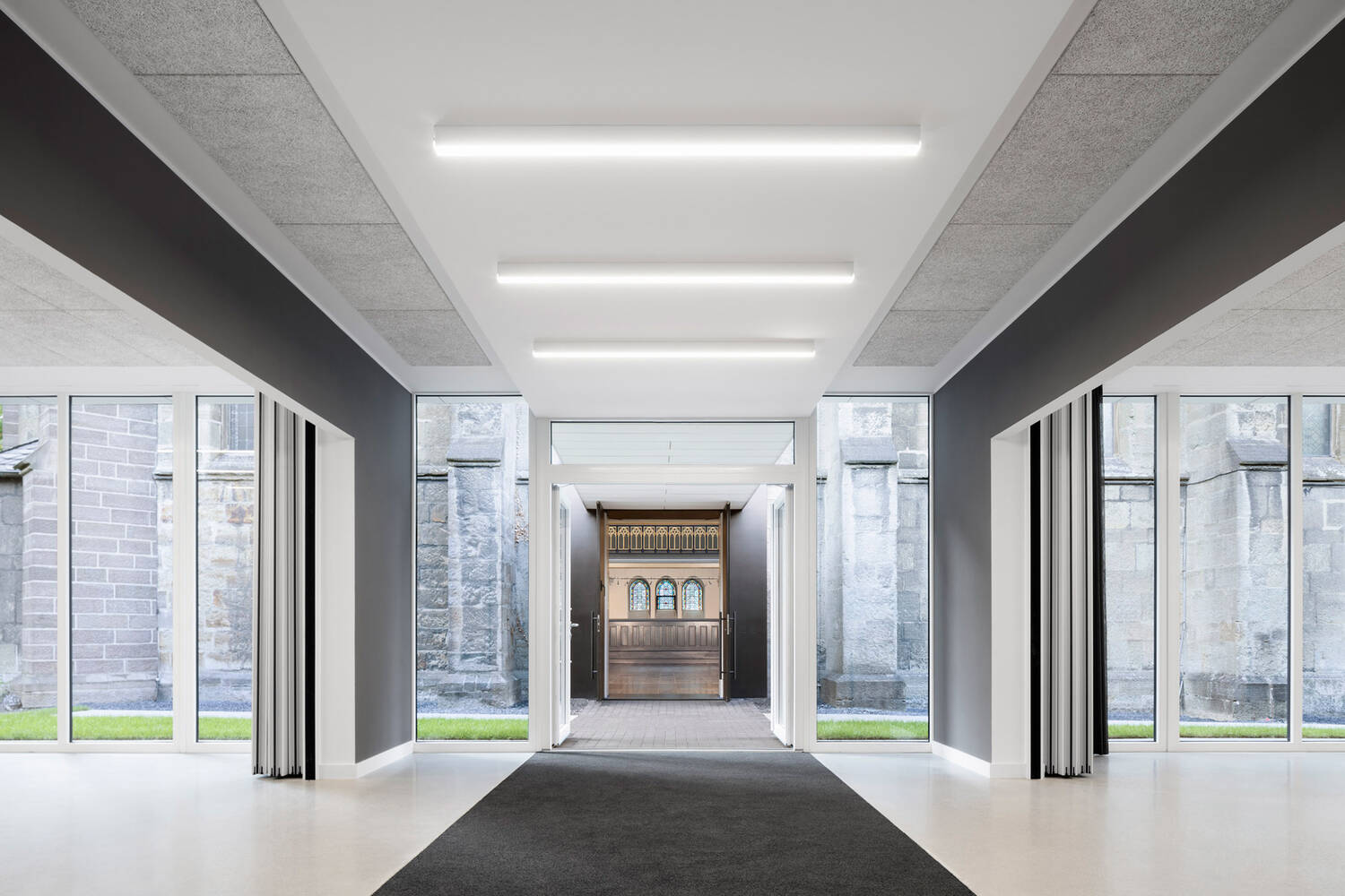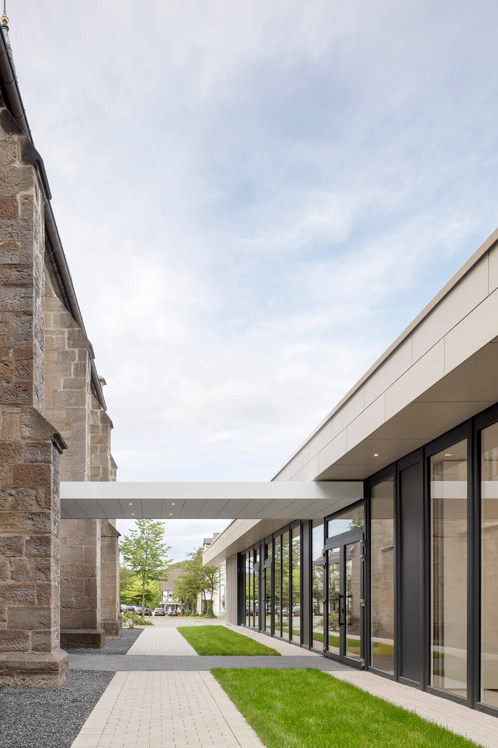 Das in drei Teilbereiche (Servicebereich / Verbindungsweg / Gemeinderäume) gegliederte Volumen, ist in Längsrichtung geordnet und folgt hiermit der strukturellen Aufteilung des Kirchenraums. Als zentrales Element, barrierefreier Zugang und "neue Mitte" des Ensembles fungiert das Foyer, das in Querrichtung zum Kirchenschiff angelegt und sich in direkter Anbindung zum Altarraum befindet. Boden und Decke korrespondieren gestalterisch miteinander und schaffen fließende Übergänge.