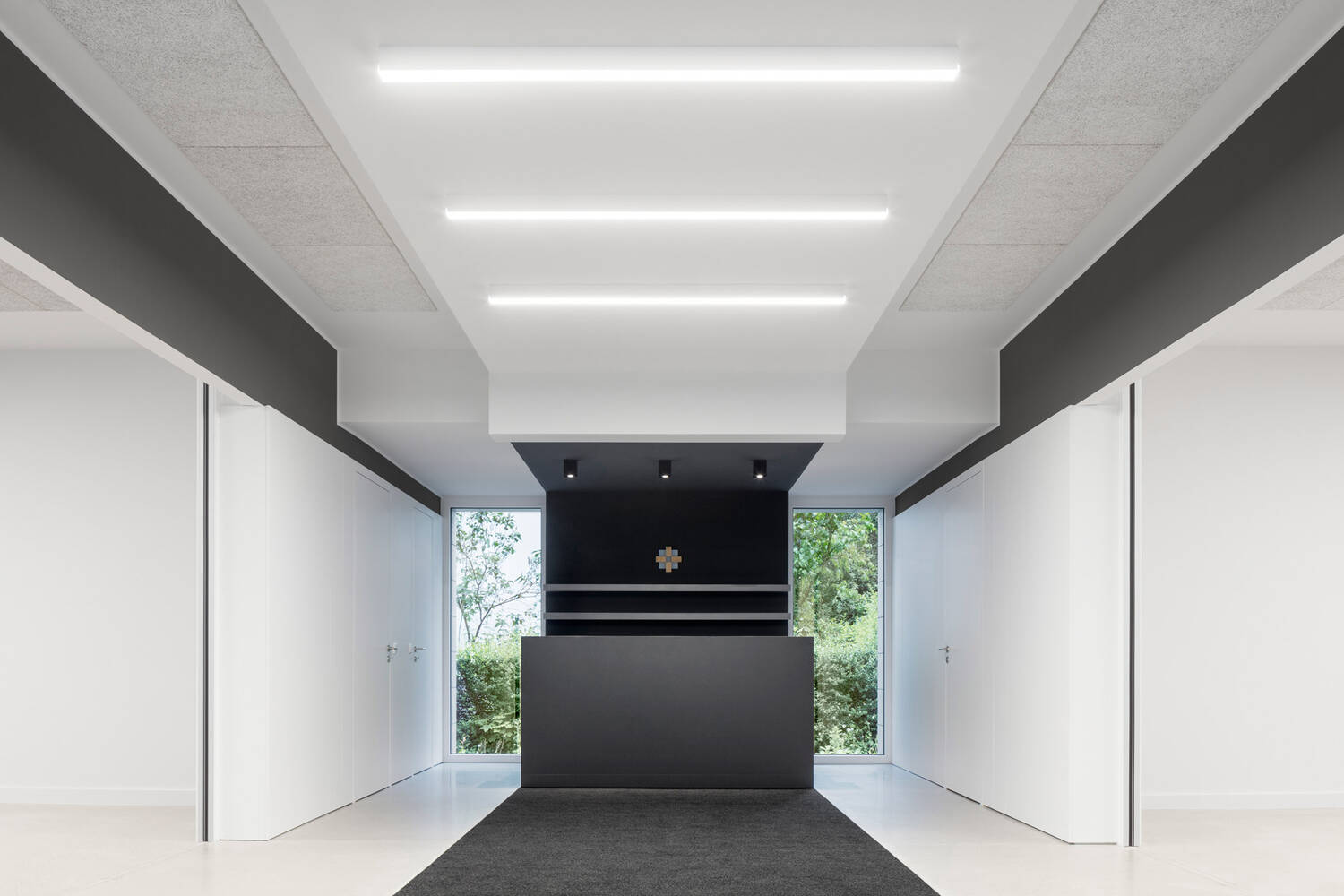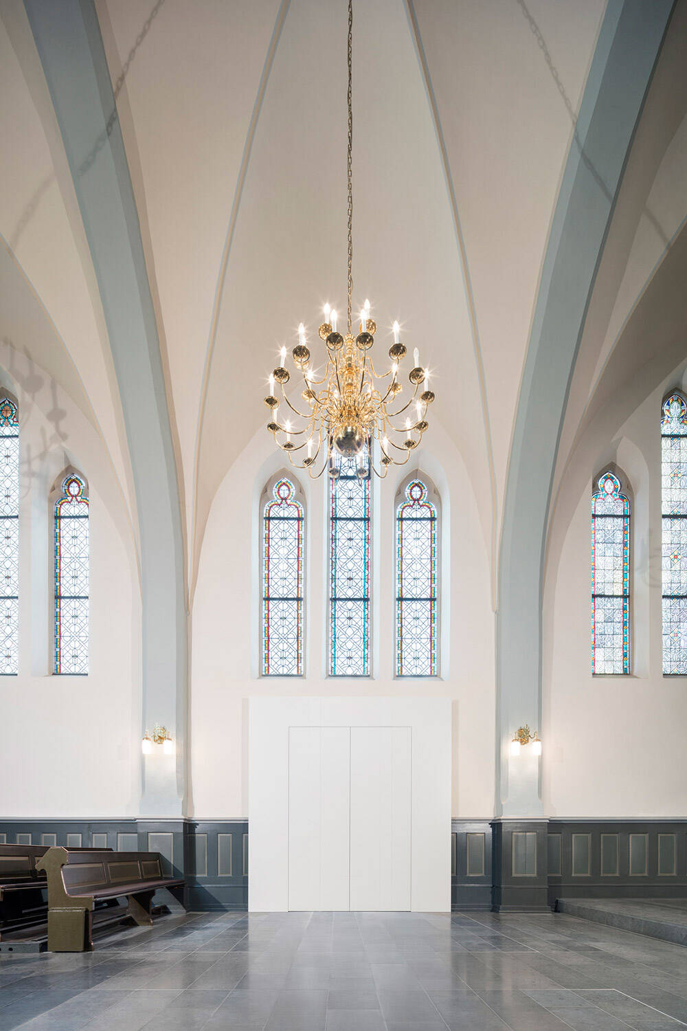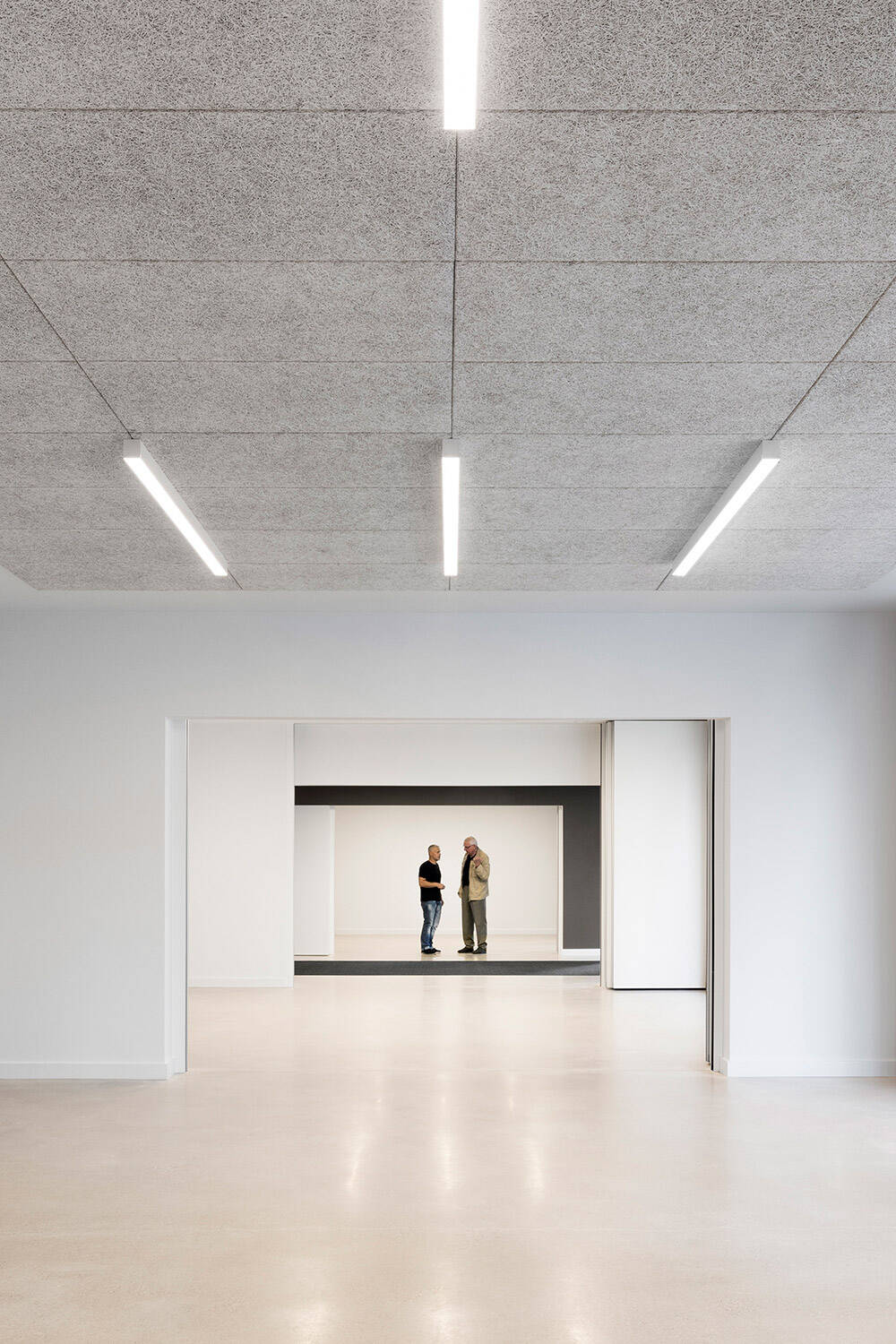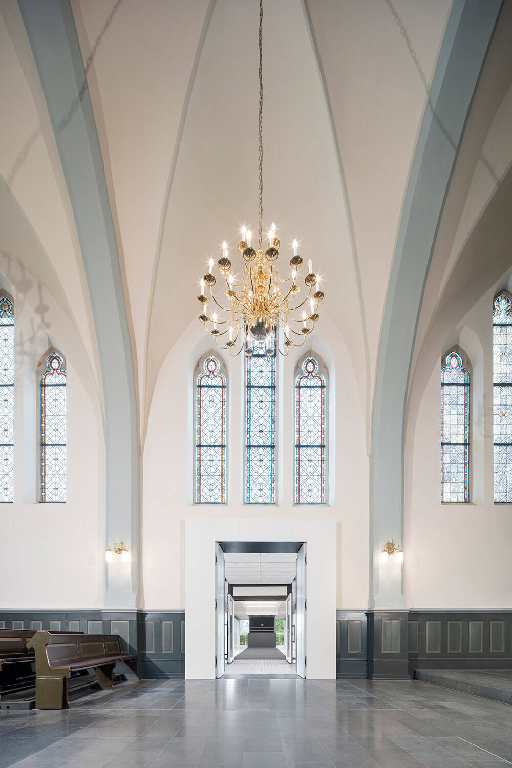 Das in drei Teilbereiche (Servicebereich / Verbindungsweg / Gemeinderäume) gegliederte Volumen, ist in Längsrichtung geordnet und folgt hiermit der strukturellen Aufteilung des Kirchenraums. Als zentrales Element, barrierefreier Zugang und "neue Mitte" des Ensembles fungiert das Foyer, das in Querrichtung zum Kirchenschiff angelegt und sich in direkter Anbindung zum Altarraum befindet. Boden und Decke korrespondieren gestalterisch miteinander und schaffen fließende Übergänge.