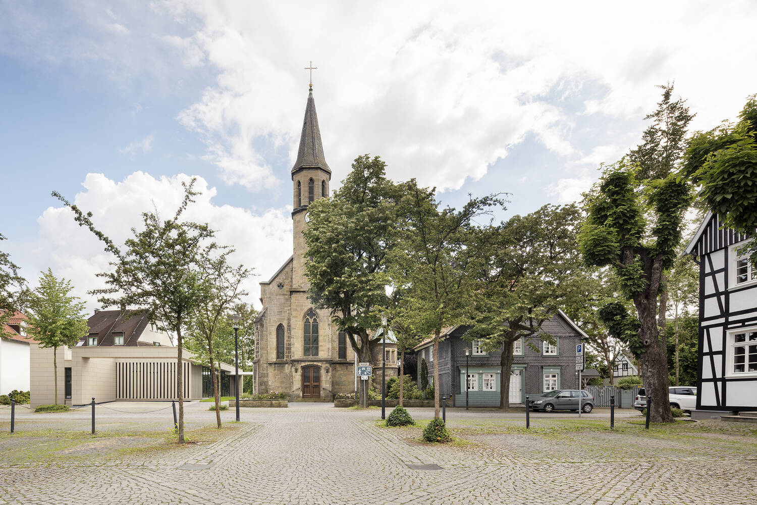 Eine differenzierte Höhenstaffelung integriert die neue Kubatur des Gemeindehauses in das vorhandene städtische Umfeld. Sie vermittelt zwischen dem hochaufragenden, zurückgesetzten Kirchenbaukörper und der vorgezogenen Flucht der umstehenden Gebäude. Der Kirchhof mit dem überspannten Vordach fungiert als Verteiler und Treffpunkt im Außenraum.