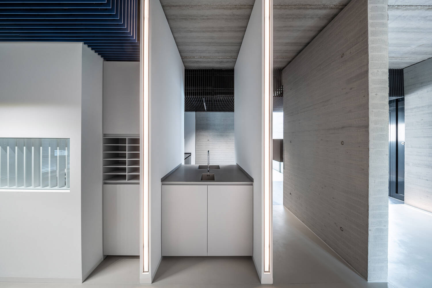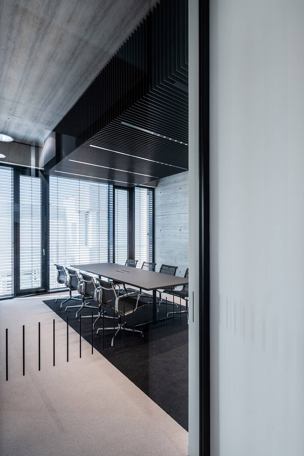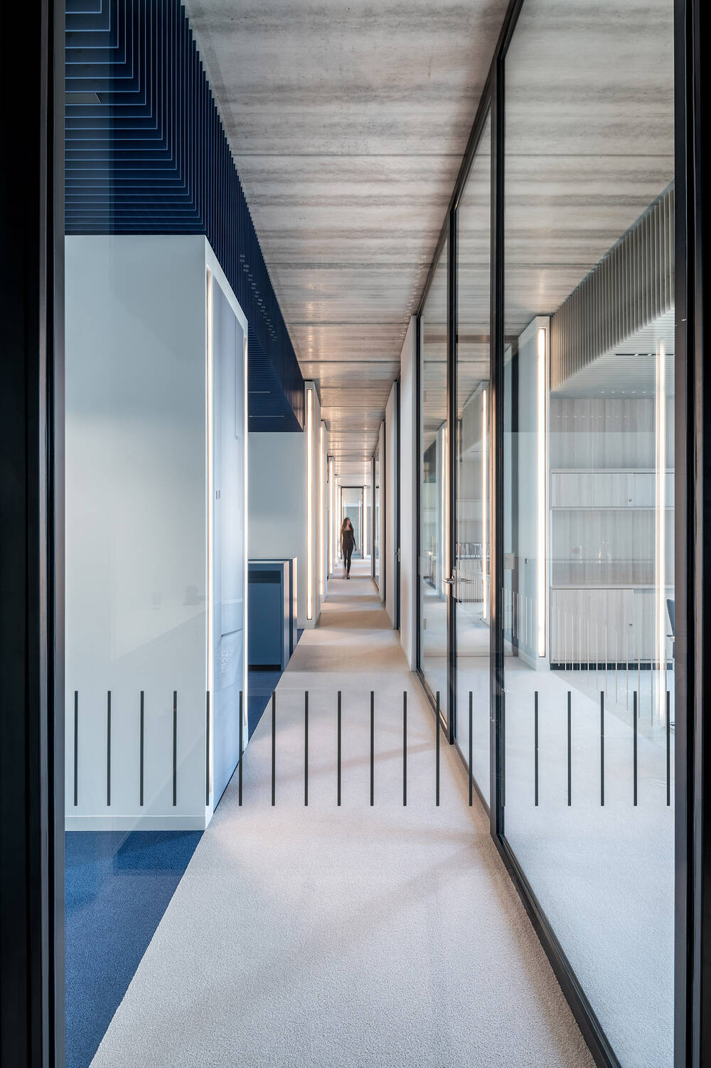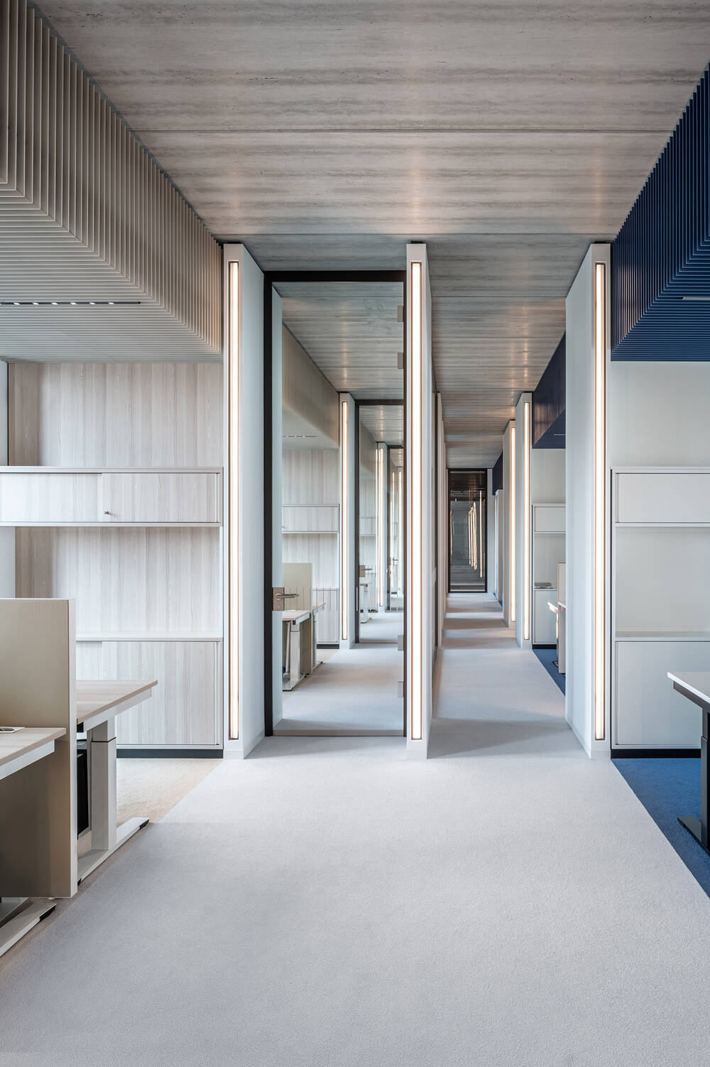 Ein konzentrierter Material- und Farbkanon, der die definierten Tonalitäten des Unternehmens aufgreift, zoniert den Grundriss und bewirkt ersichtliche „Schwellenmomente“, die Geradlinigkeit wahren und das bewusste Eintreten ermöglichen.
