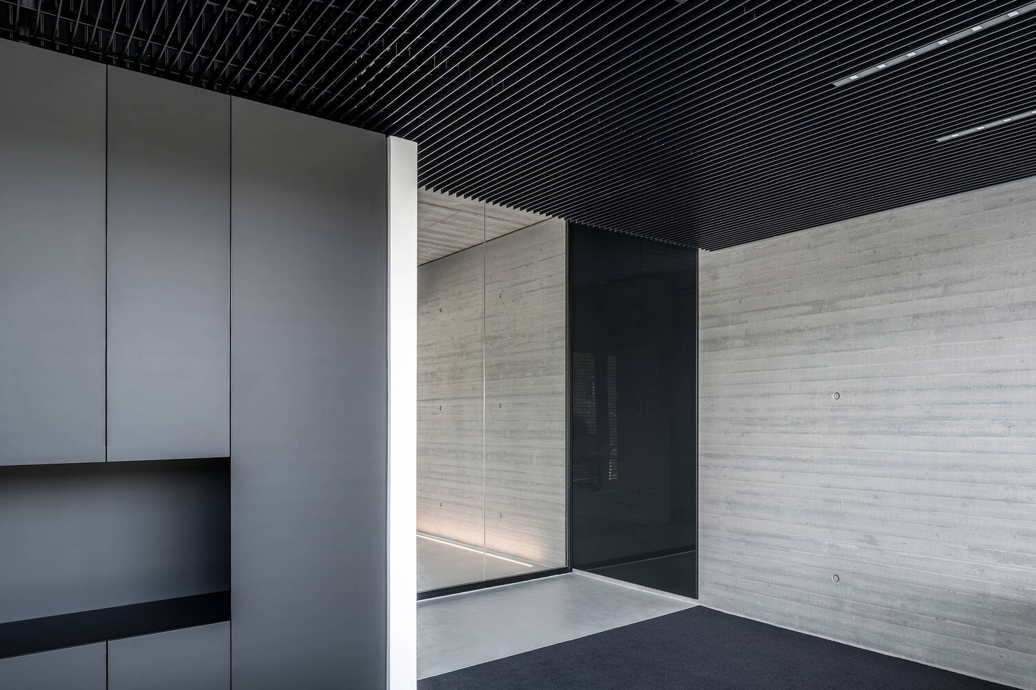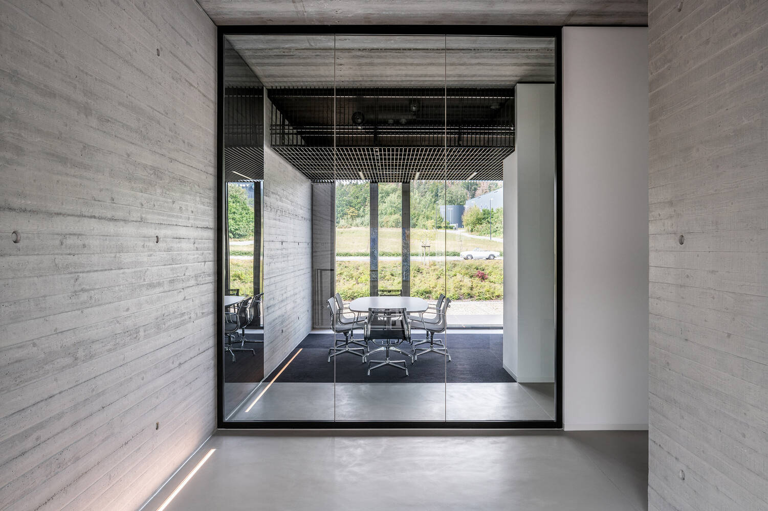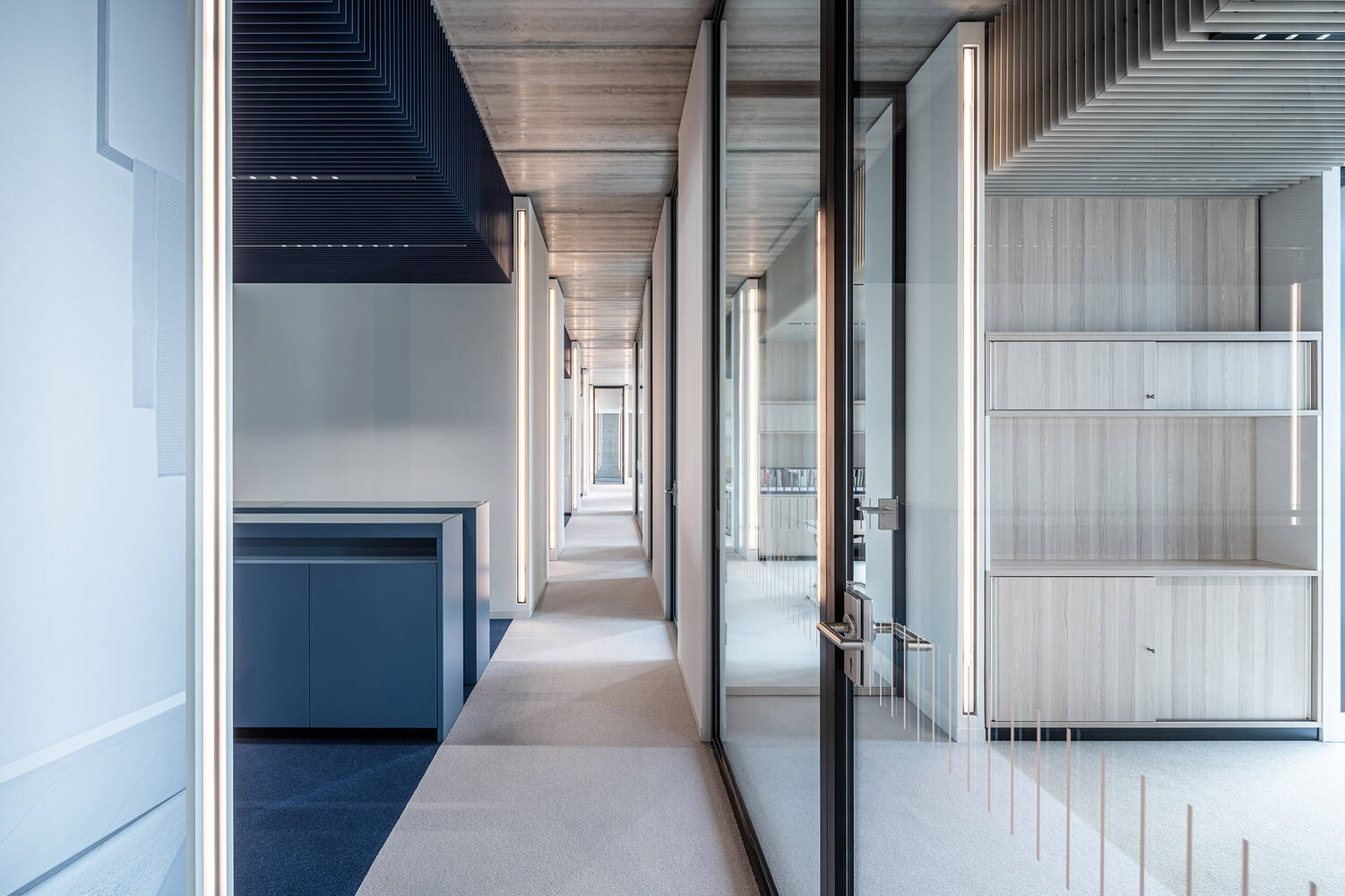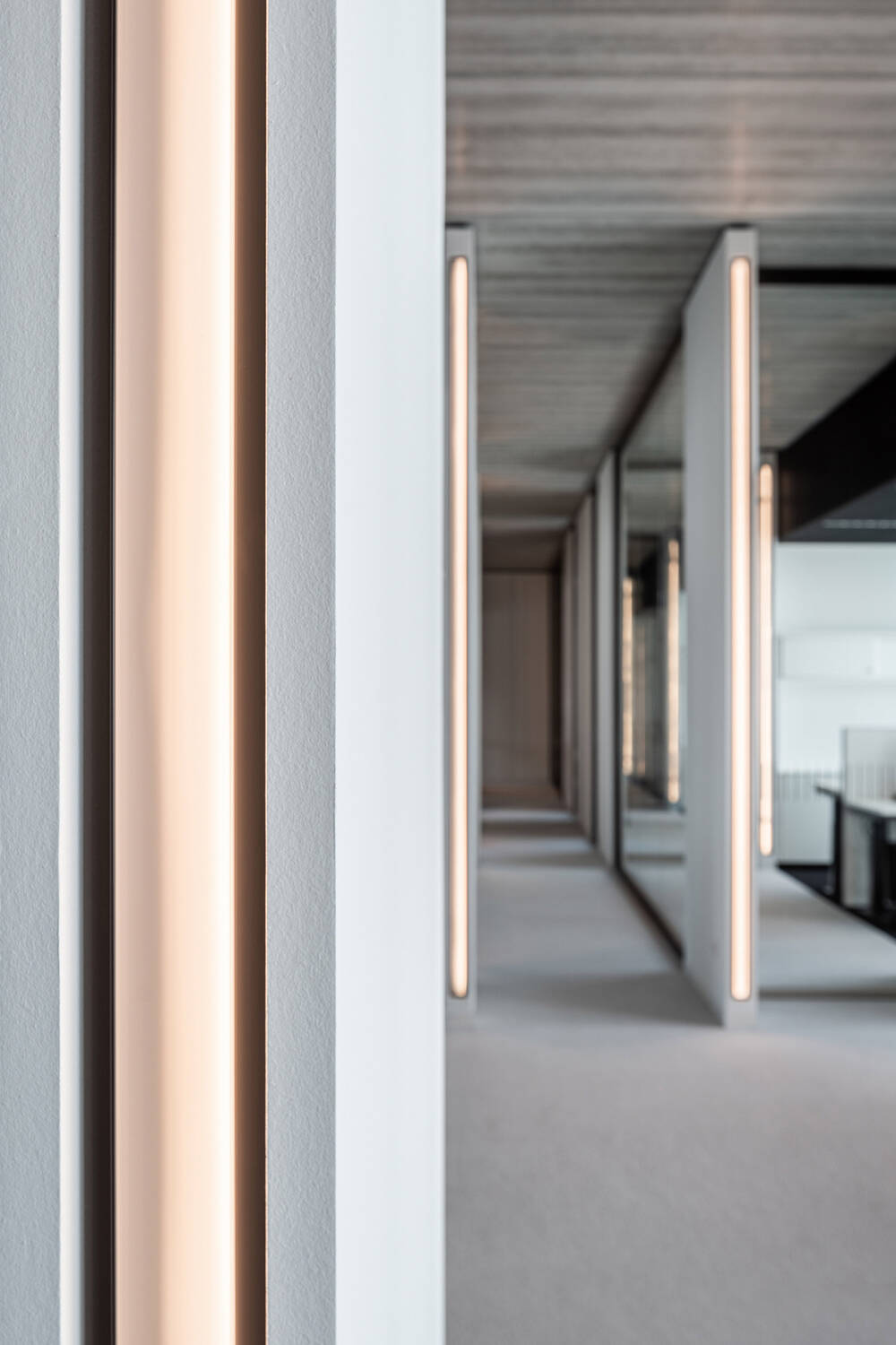 Ein konzentrierter Material- und Farbkanon, der die definierten Tonalitäten des Unternehmens aufgreift, zoniert den Grundriss und bewirkt ersichtliche „Schwellenmomente“, die Geradlinigkeit wahren und das bewusste Eintreten ermöglichen.