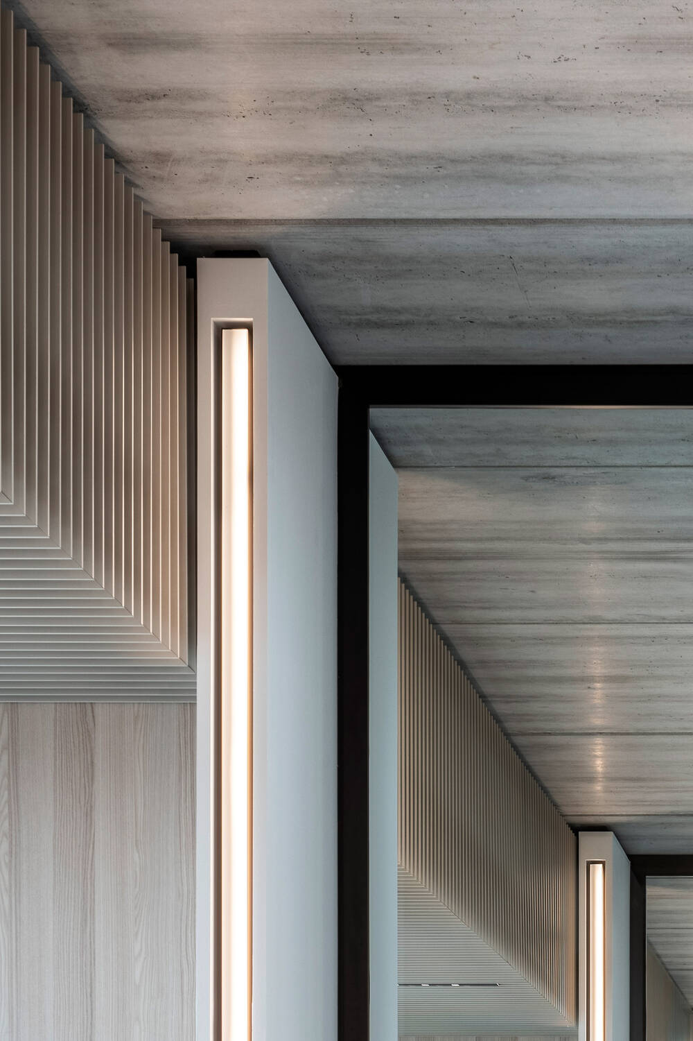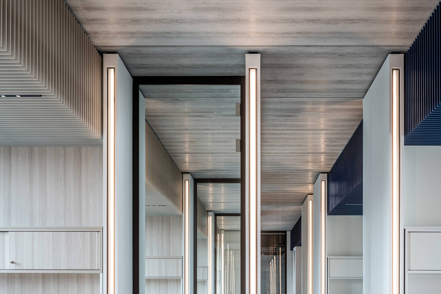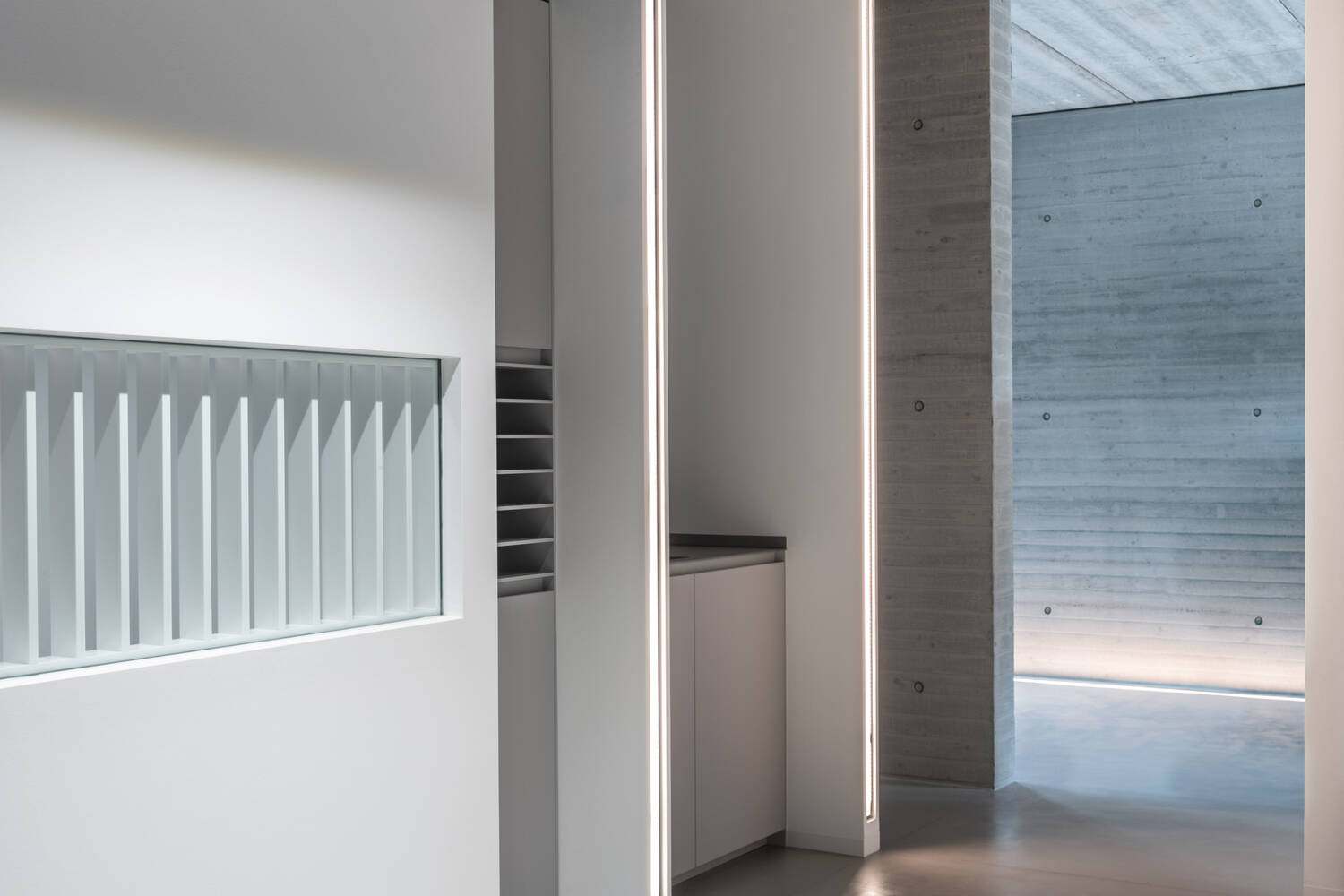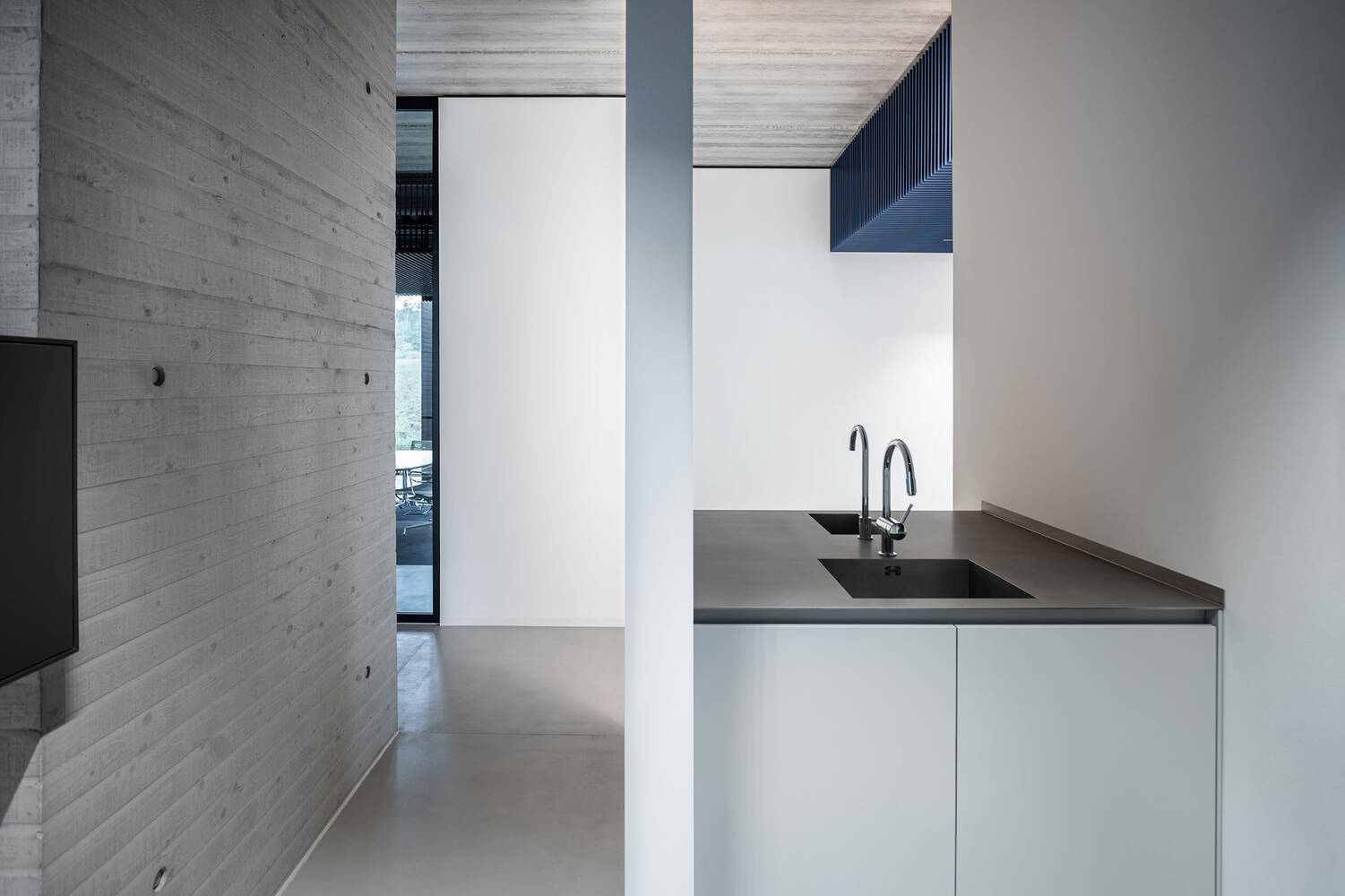 Ein konzentrierter Material- und Farbkanon, der die definierten Tonalitäten des Unternehmens aufgreift, zoniert den Grundriss und bewirkt ersichtliche „Schwellenmomente“, die Geradlinigkeit wahren und das bewusste Eintreten ermöglichen.