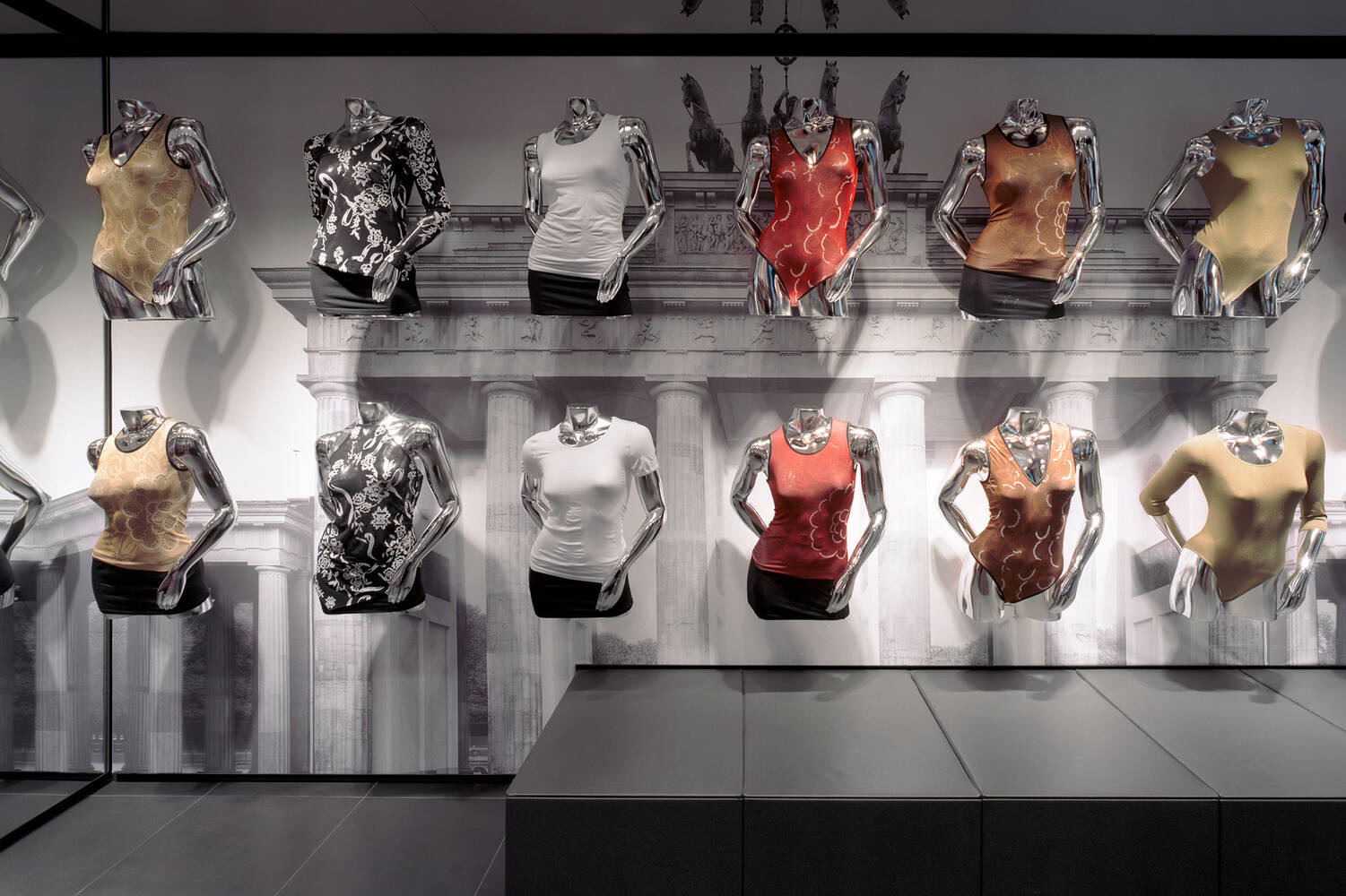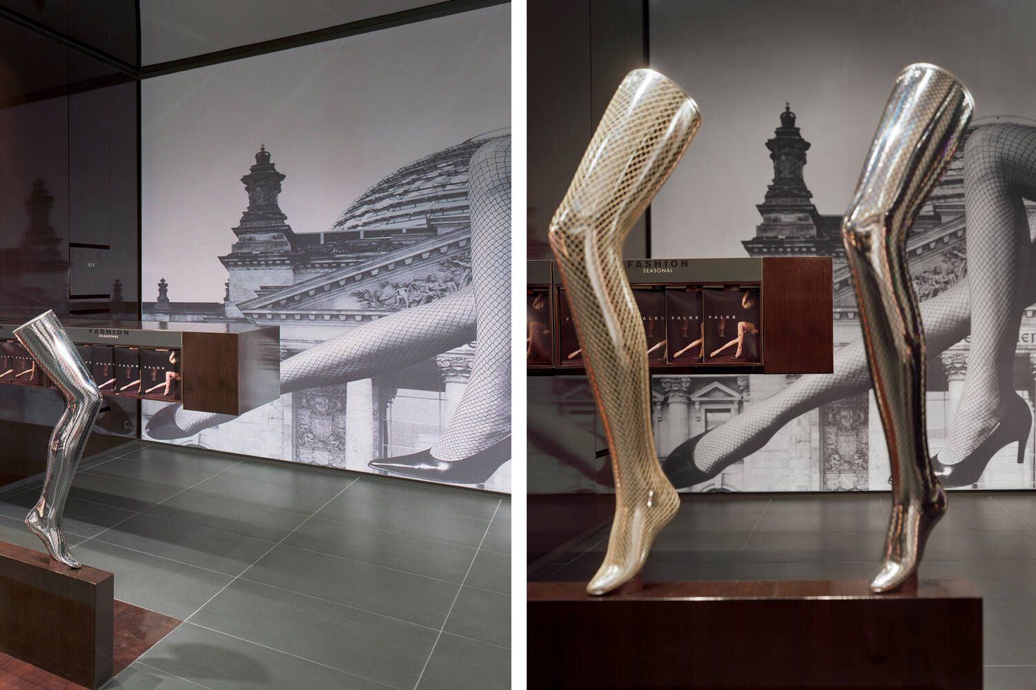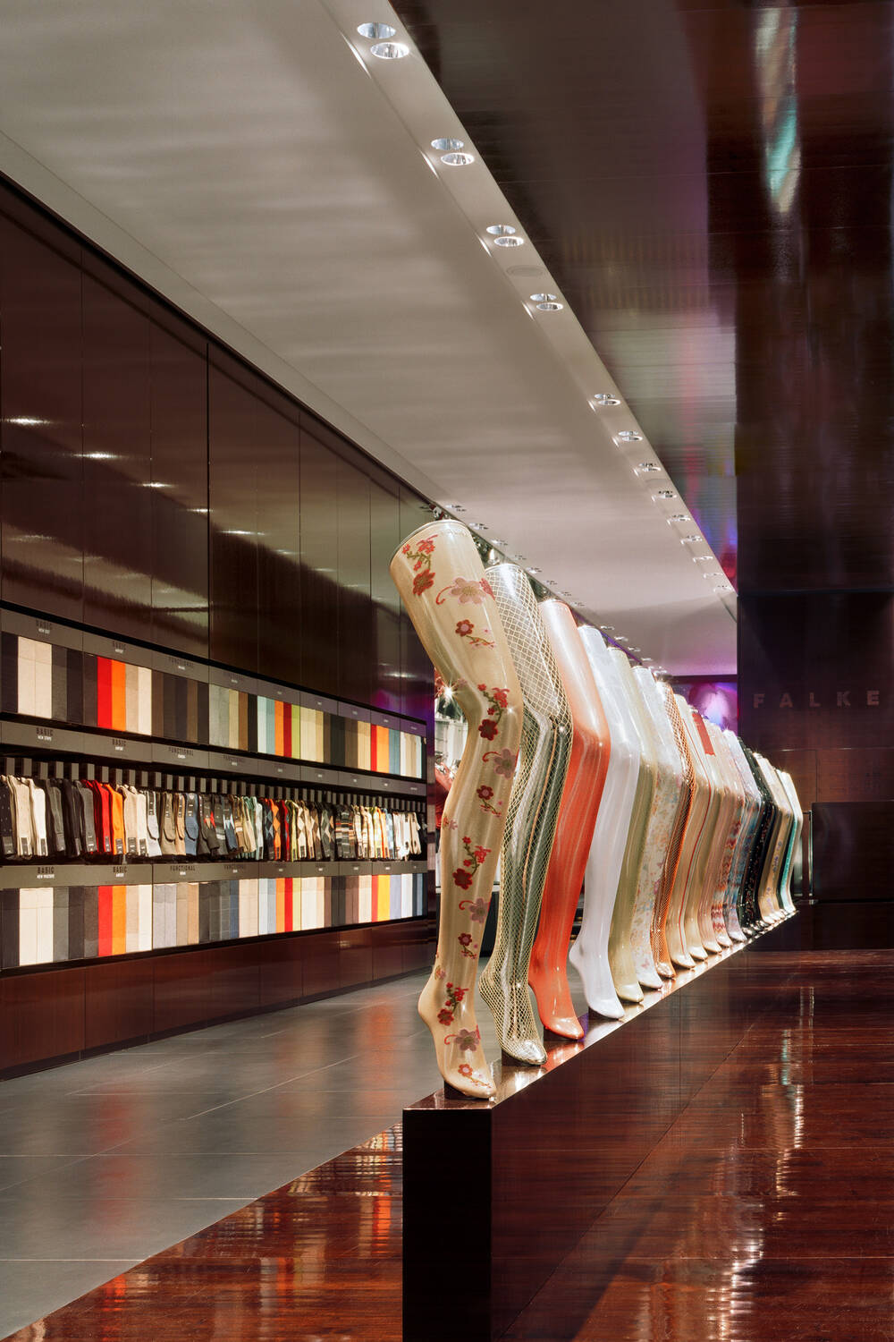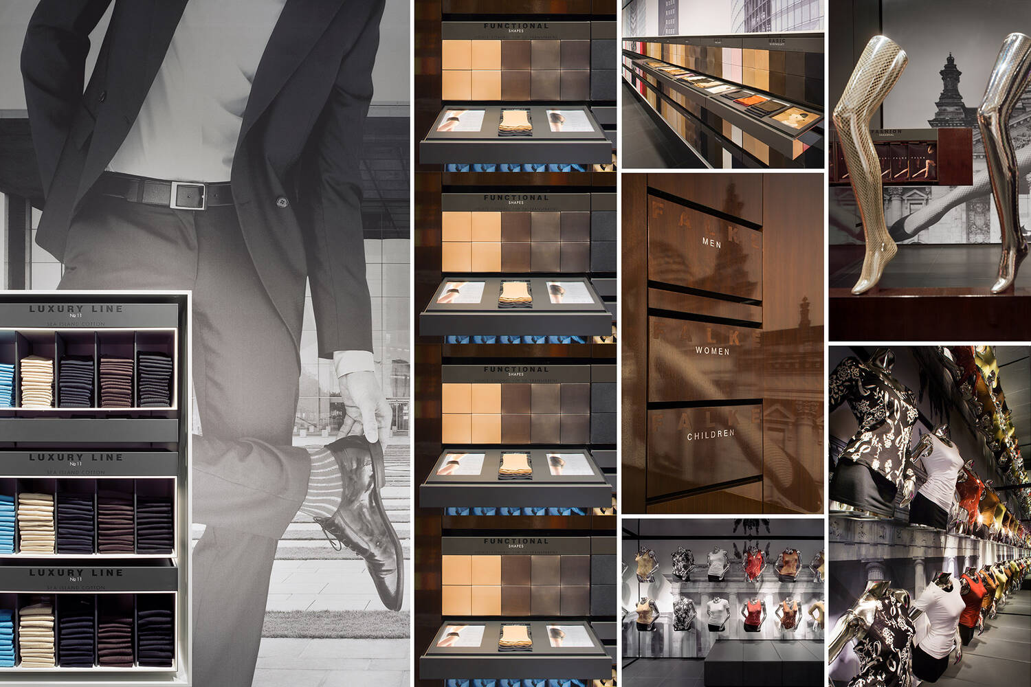 Die Themen Verdichtung, Überlagerung und Transparenz als Symbol für Dynamik und Urbanität zeigen sich als Leitgedanken der Neukonzeption des FALKE Flagship Stores mit direktem Zugang zum Berliner Ku’damm. Die Gesamtgestaltung beruht auf den essentiellen Gestaltungsparametern, die durch die Beziehungen, Proportionen und das Zusammenspiel von Flächen und Linien im Raum zu einander entstehen. Das gewünschte Erscheinungsbild sollte den Auftritt eines erfolgreichen, positiven, dienstleistungsorientierten Images in der Öffentlichkeit untermalen. Das zukünftige Ambiente – und damit verbunden die Darstellung des Auftraggebers – sollte nachhaltig im Gedächtnis verankert bleiben.