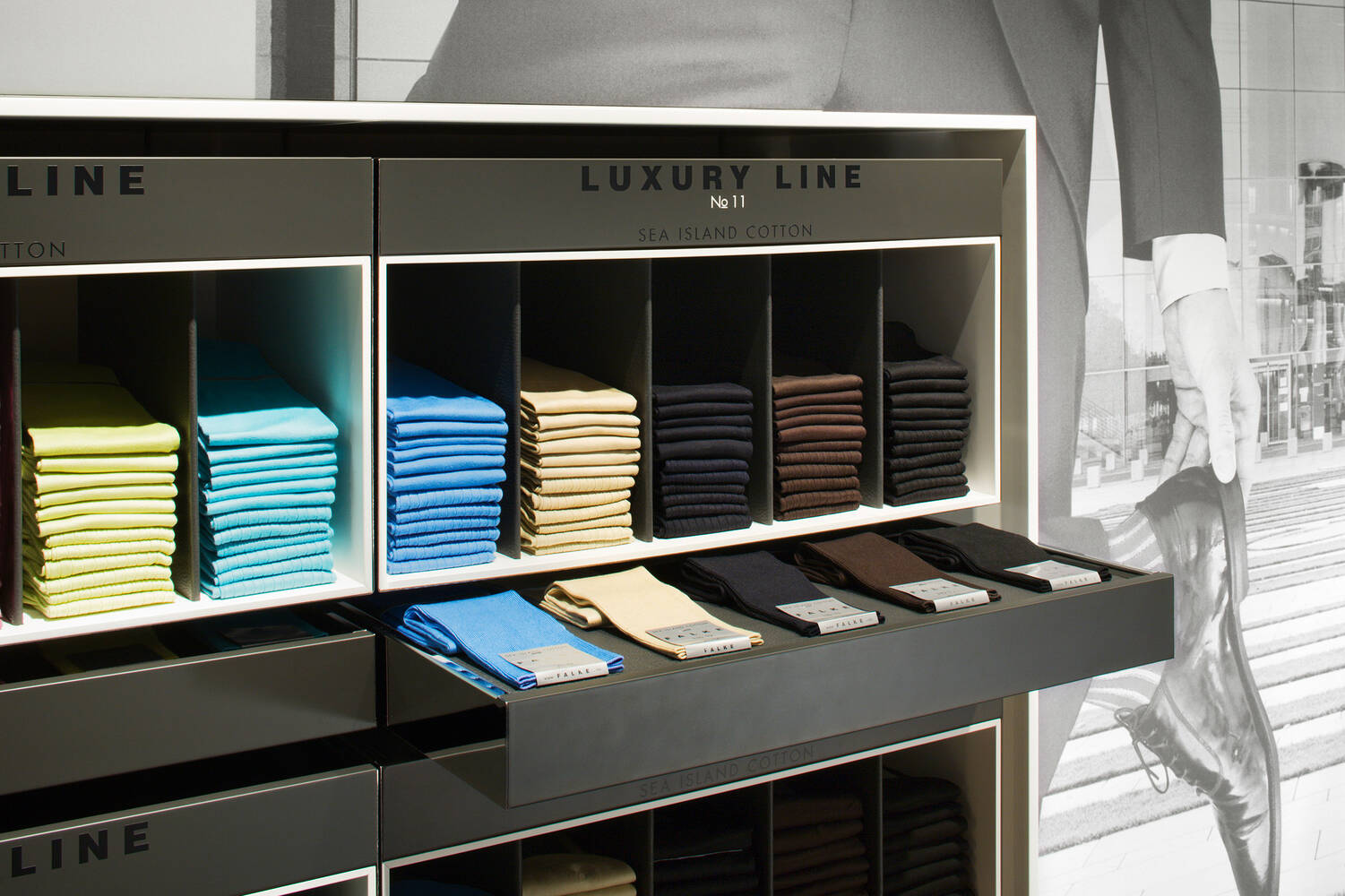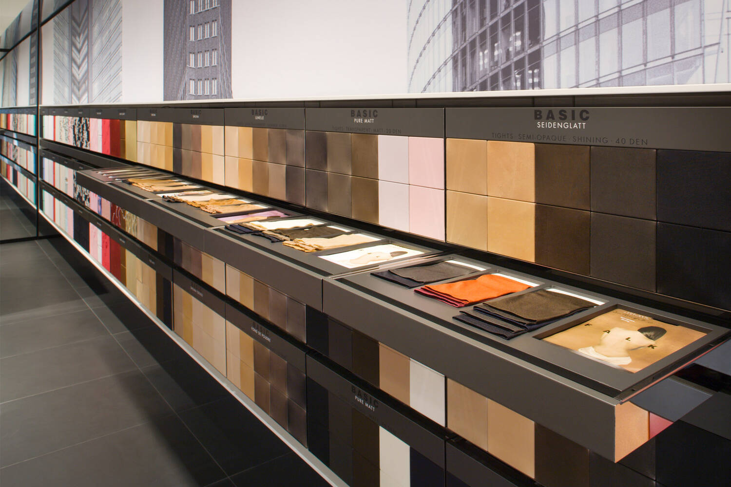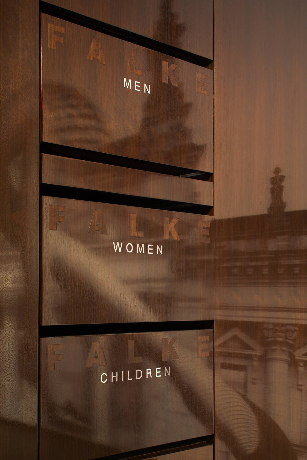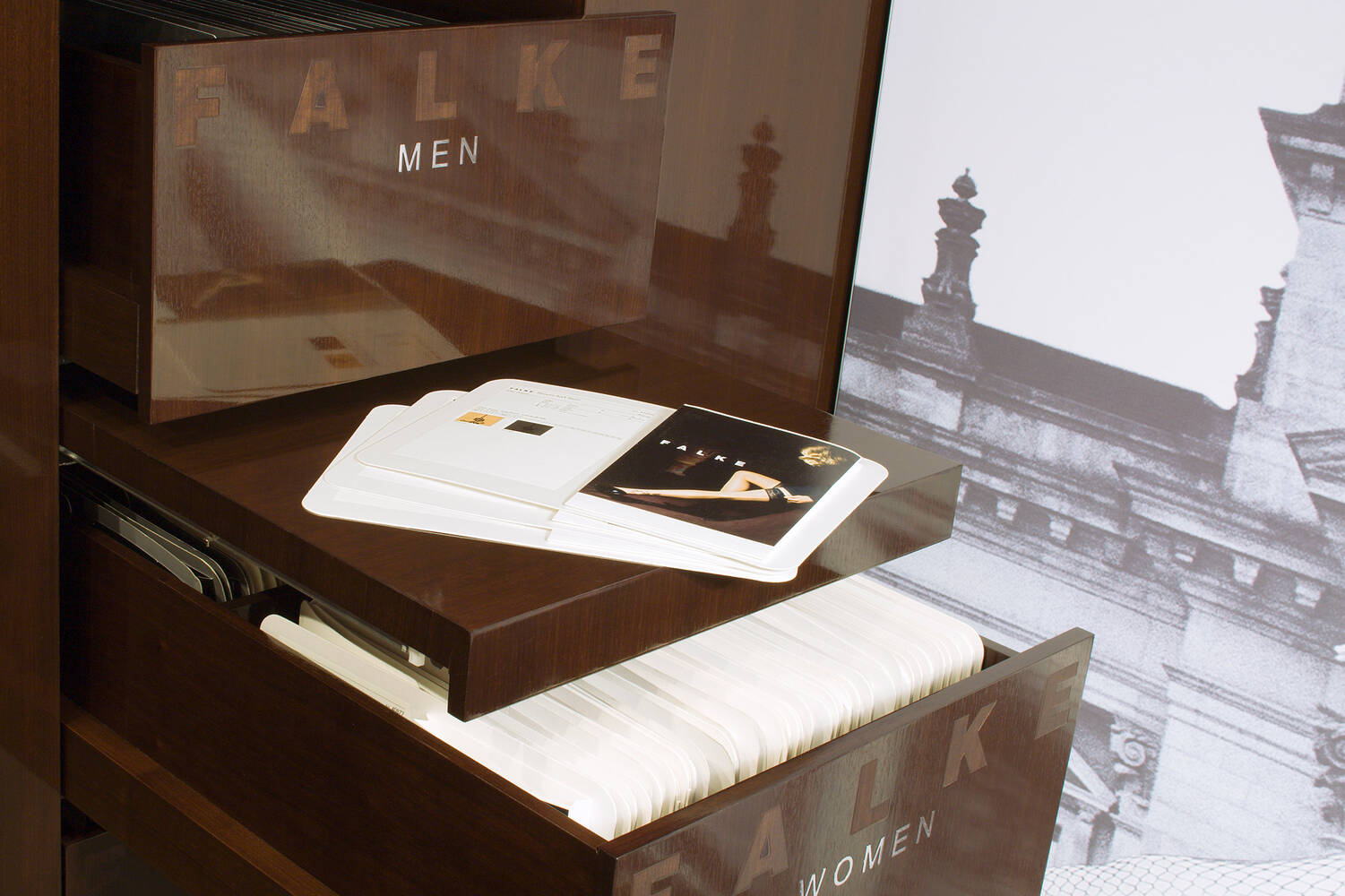 Für die bisherige branchentypische Präsentation der FALKE Produkte wurde eine neue Form der Inszenierung durch KEGGENHOFF | PARTNER entwickelt. Das ausgewählte Produkt selbst wird in seiner Vielfalt an Material, Farbe und Struktur als essentielles Gestaltungsmerkmal definiert und in den Fronten der Möbelelemente positioniert, um mit prägnanter, nachhaltiger Wirkung die visuelle und emotionale Positionierung der Marke zu gewährleisten.