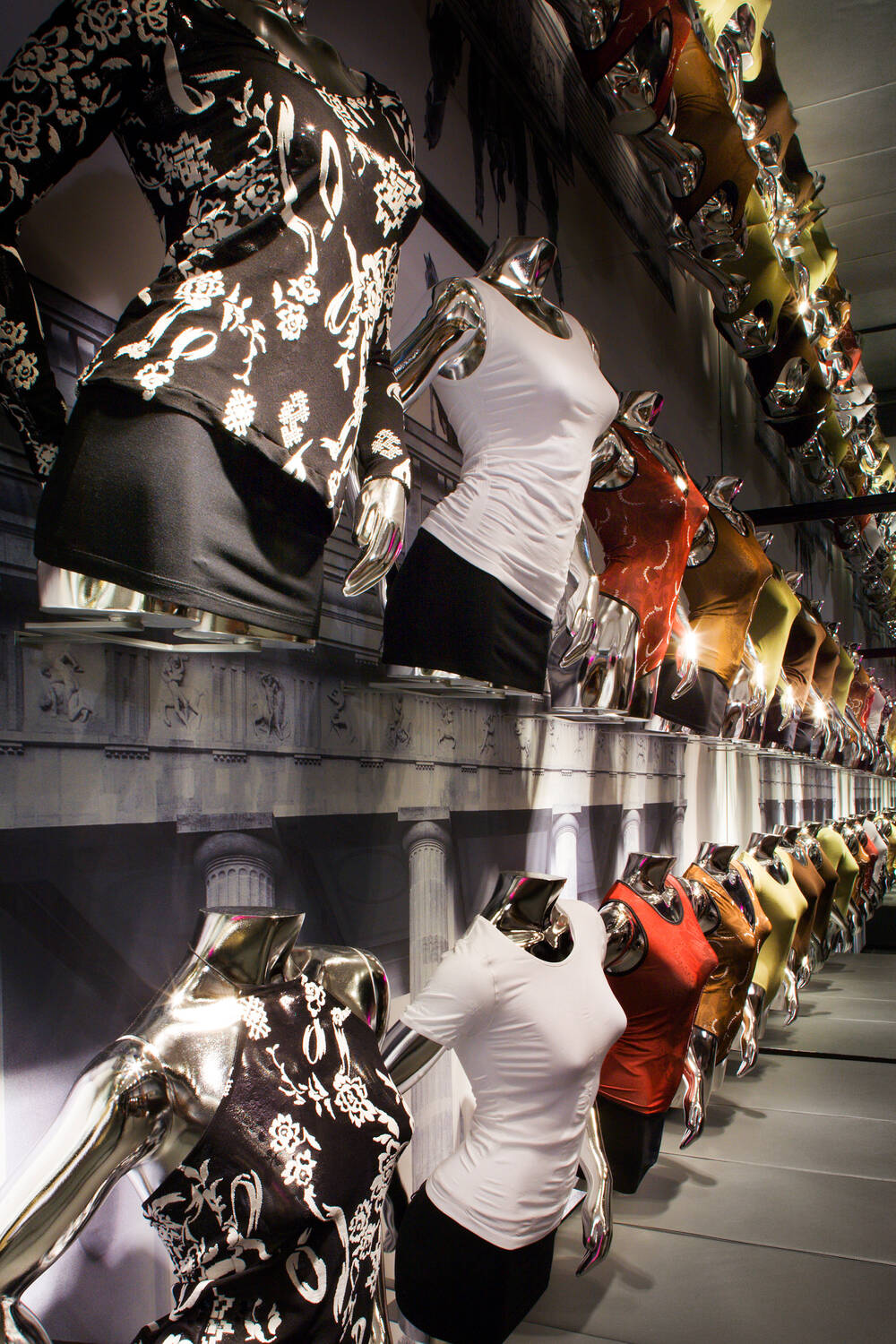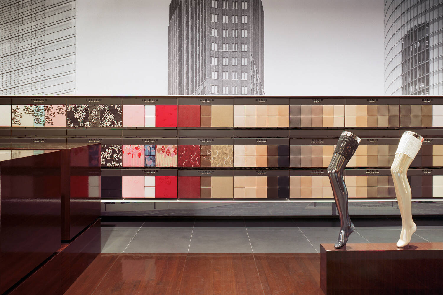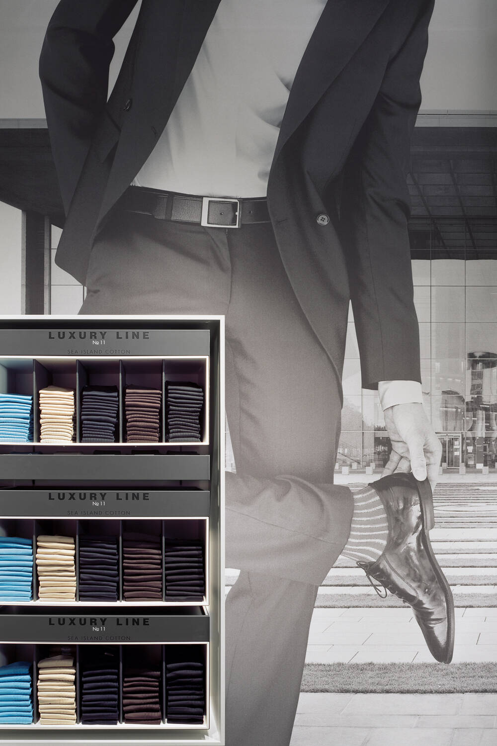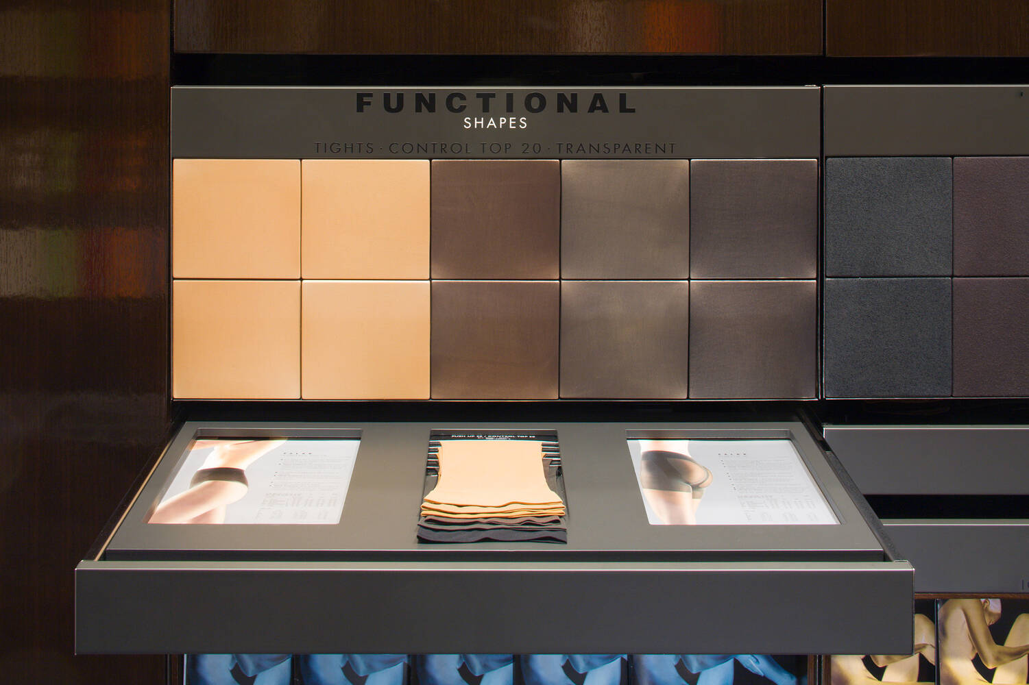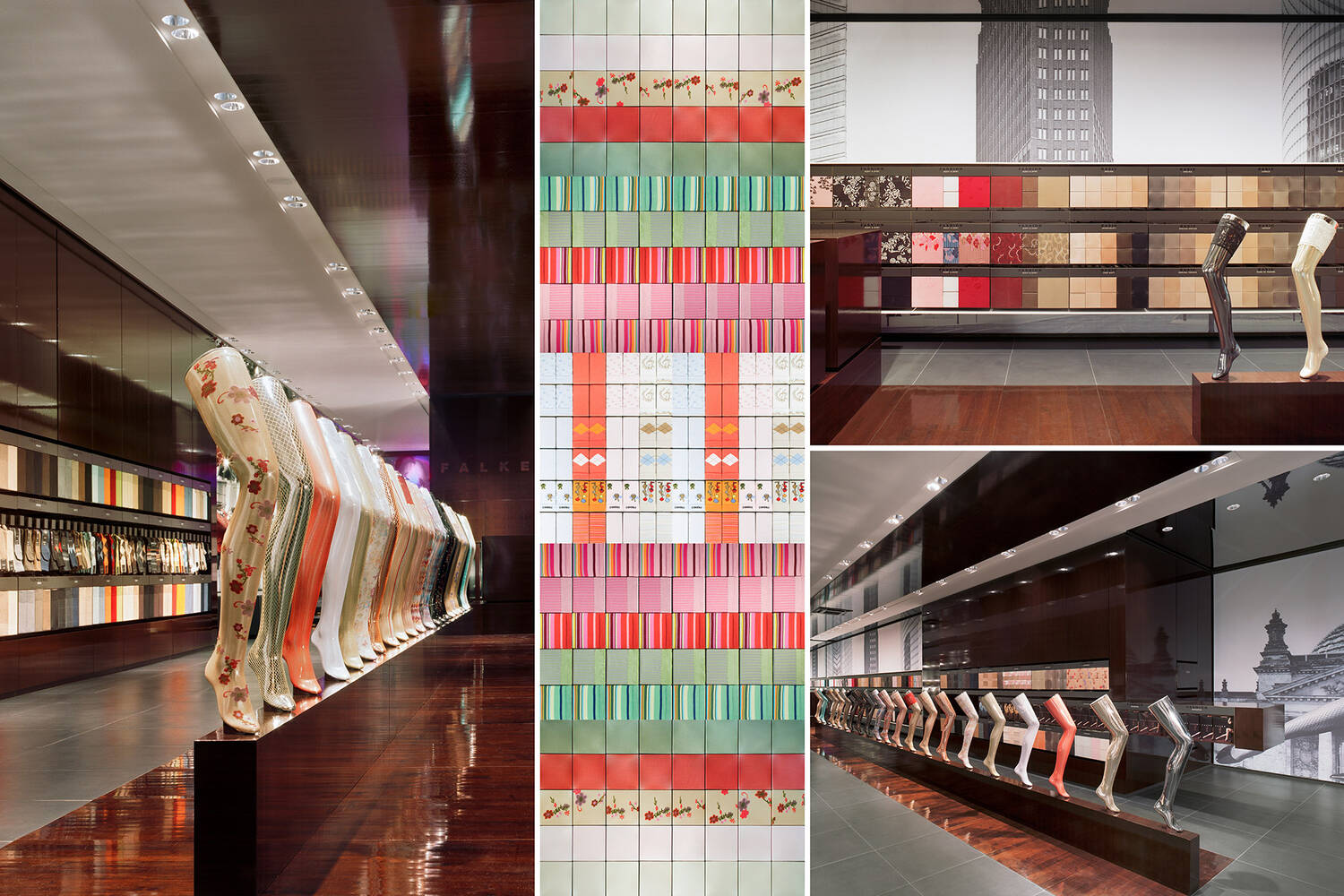 Für die bisherige branchentypische Präsentation der FALKE Produkte wurde eine neue Form der Inszenierung durch KEGGENHOFF | PARTNER entwickelt. Das ausgewählte Produkt selbst wird in seiner Vielfalt an Material, Farbe und Struktur als essentielles Gestaltungsmerkmal definiert und in den Fronten der Möbelelemente positioniert, um mit prägnanter, nachhaltiger Wirkung die visuelle und emotionale Positionierung der Marke zu gewährleisten.