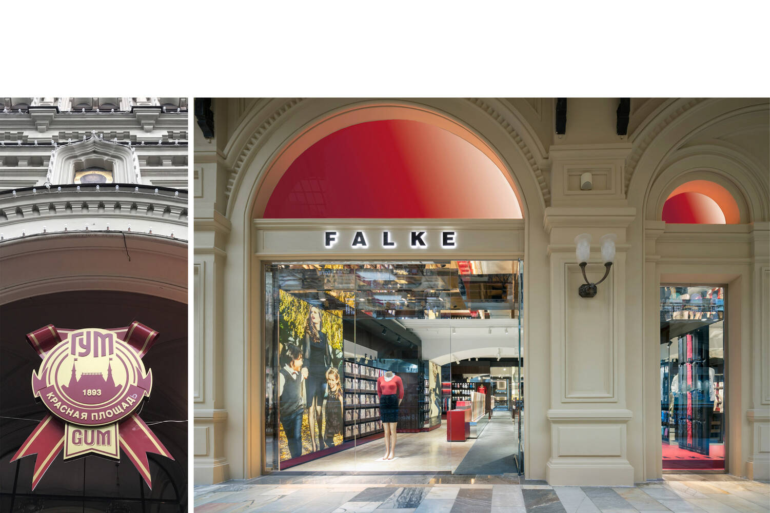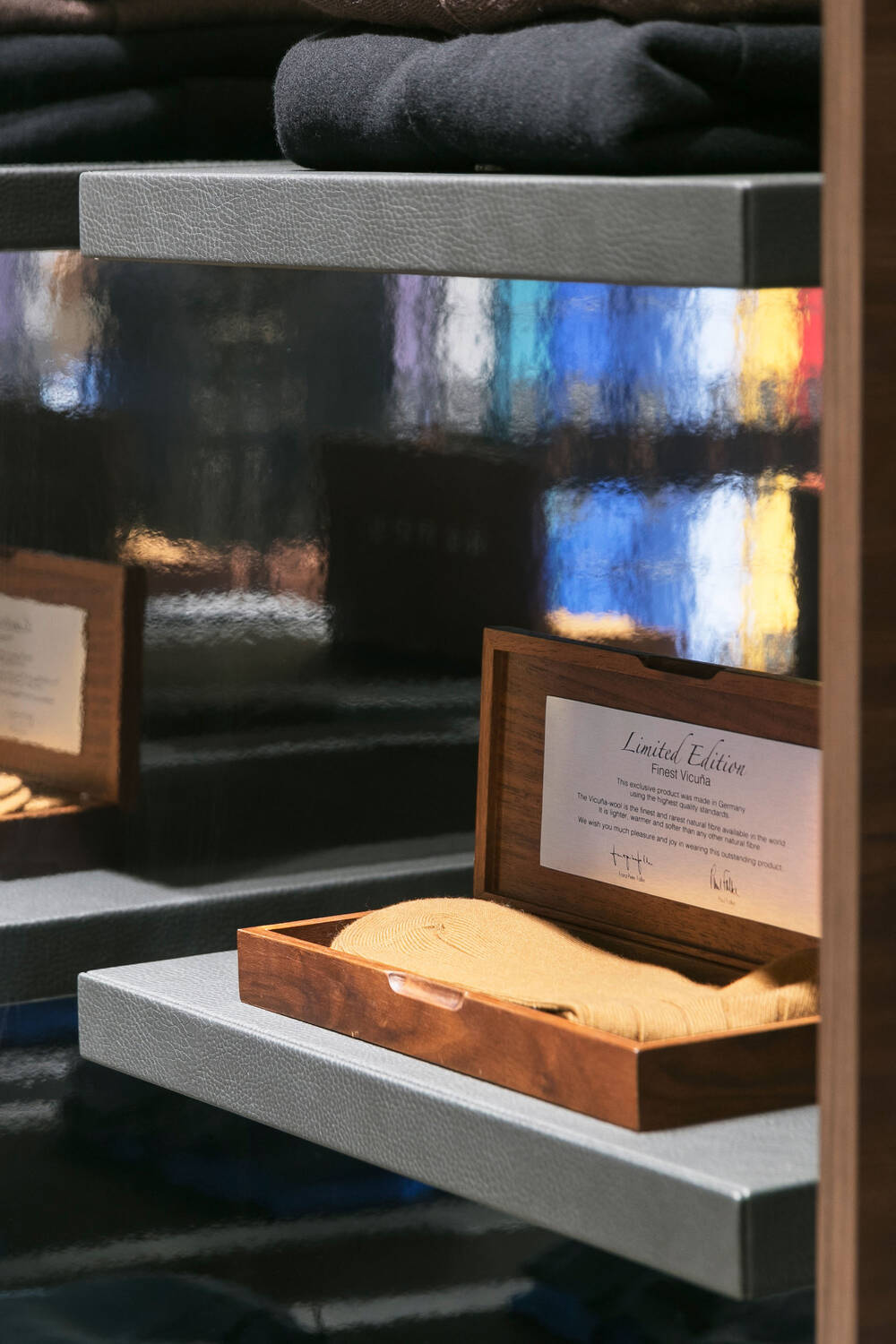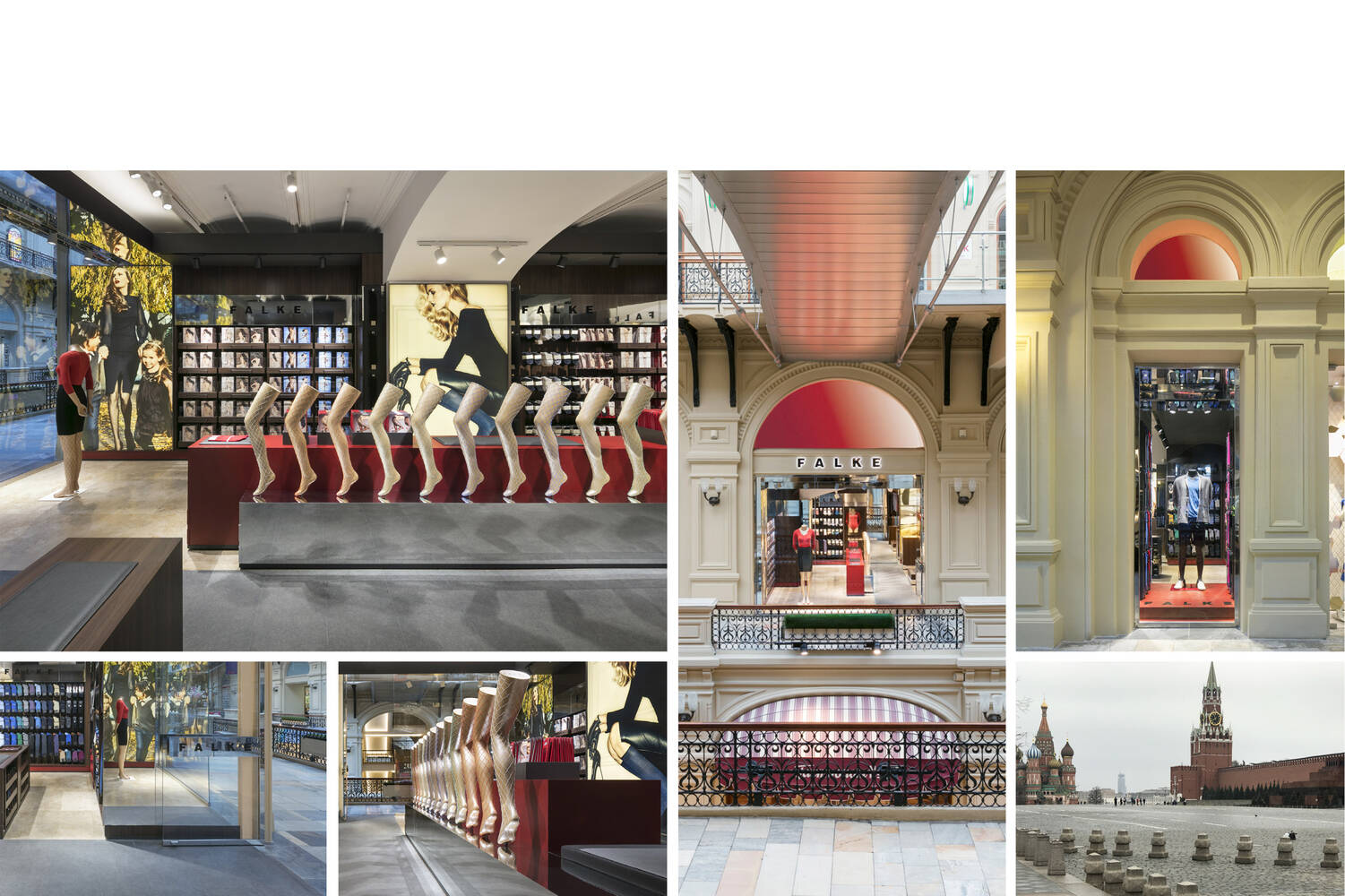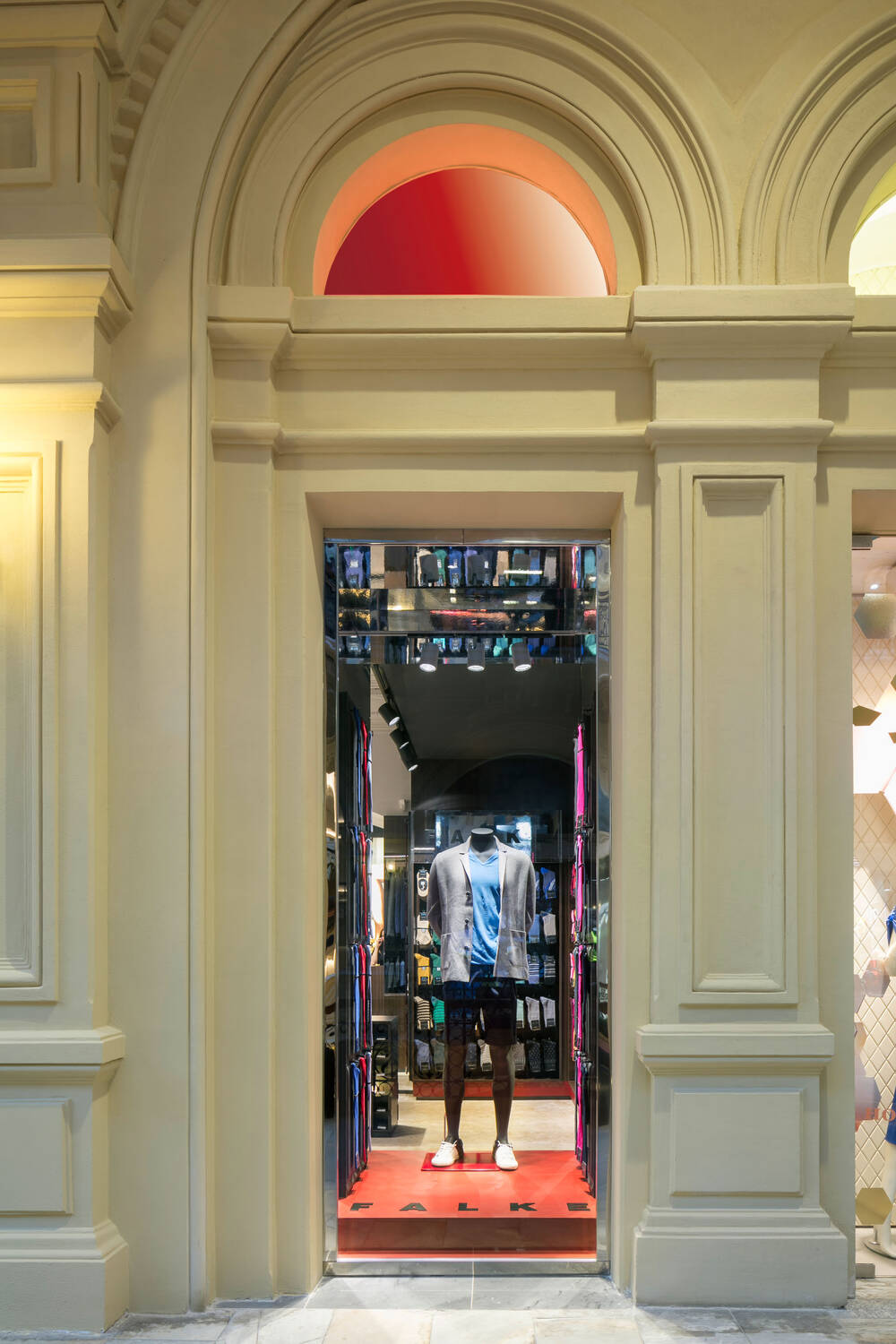 Thematisch werden die eingebauten Raumkörper entlang der Fläche positioniert und rahmen so die facettenreiche Produkt- und Kollektionsvielfalt. Über die systemorientierte, funktionale Gestaltung des Innenraums wird ein Maximum an unsichtbaren Stauflächen und Dienstleistungen geschaffen. Die Ausführung aller Einbauten setzt dabei, dem Anspruch von FALKE gleich, auf ein Höchstmaß an handwerklicher Qualität. Sie begünstigen den Eindruck von Präzision, Ruhe und Ordnung im Raum. Großflächige Visuals kontrastieren in ihrer Flächigkeit das Volumen der Einbauten und lassen Produkt, Marke und Raum als einheitliche Botschaft miteinander verschmelzen.