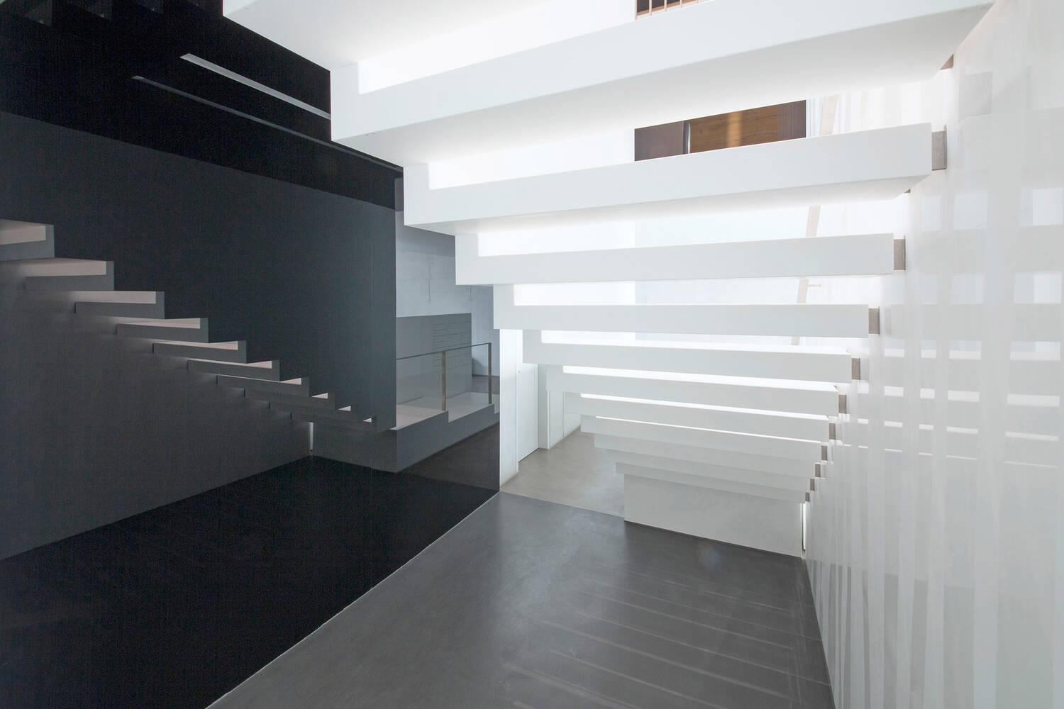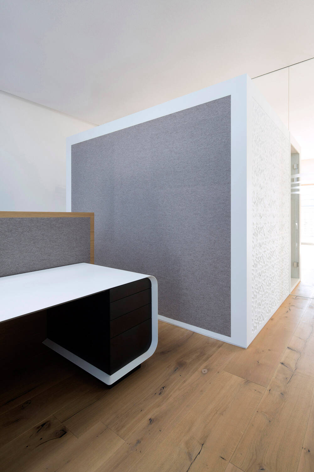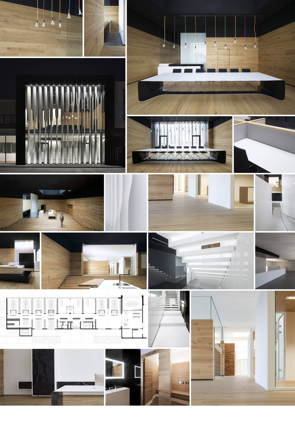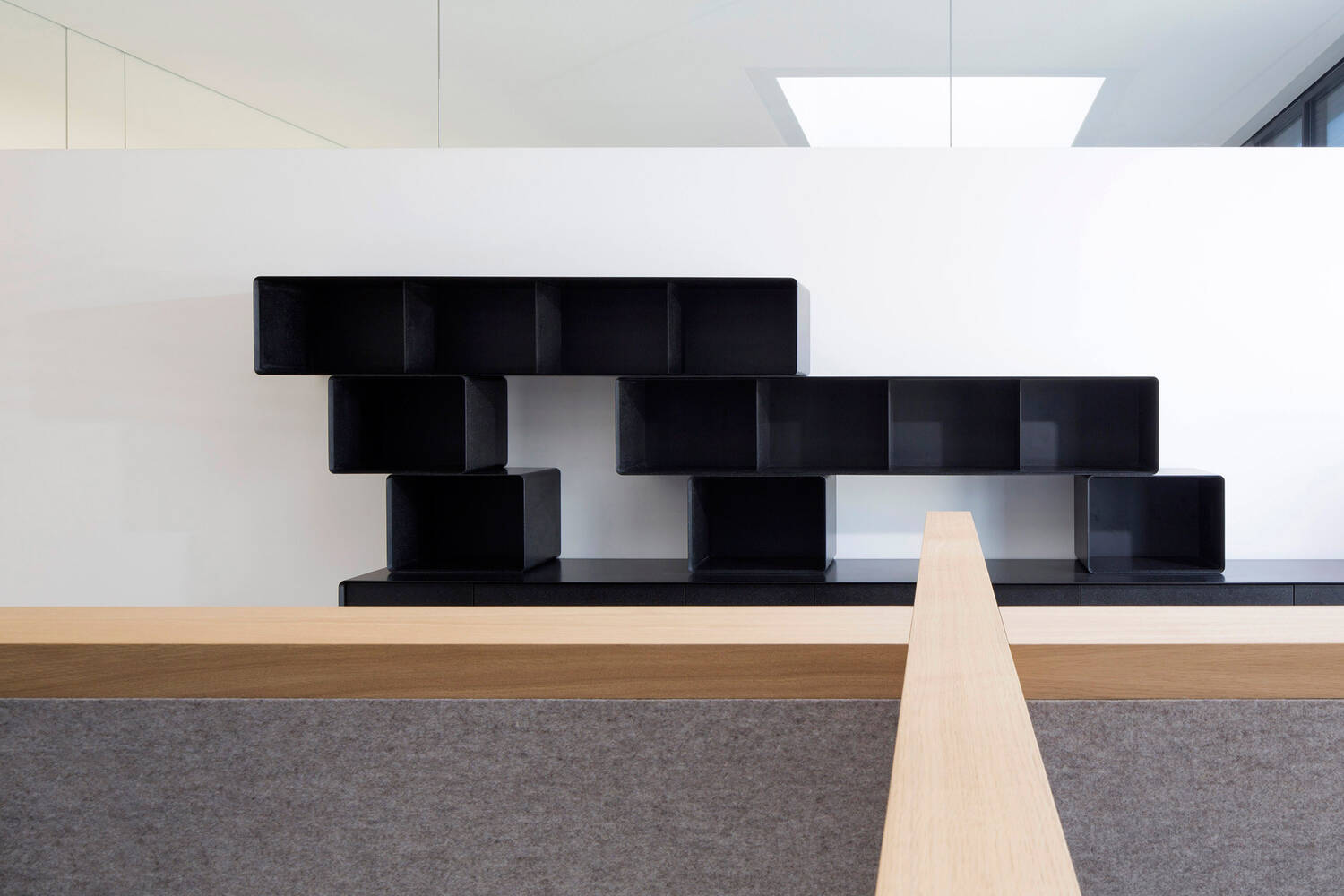 Die innenarchitektonische Lösung bietet offene Kommunikations- und Arbeitszonen sowie Servicebereiche, die im Obergeschoss des Gebäudes durch „eingeschobene“ Boxen zoniert werden. Die Inhalte der Boxen, welche unterschiedliche Funktionen sowie Rückzugsmöglichkeiten beinhalten, sorgen für eine systematische Gliederung der hauptsächlich offenen Arbeitsbereiche.