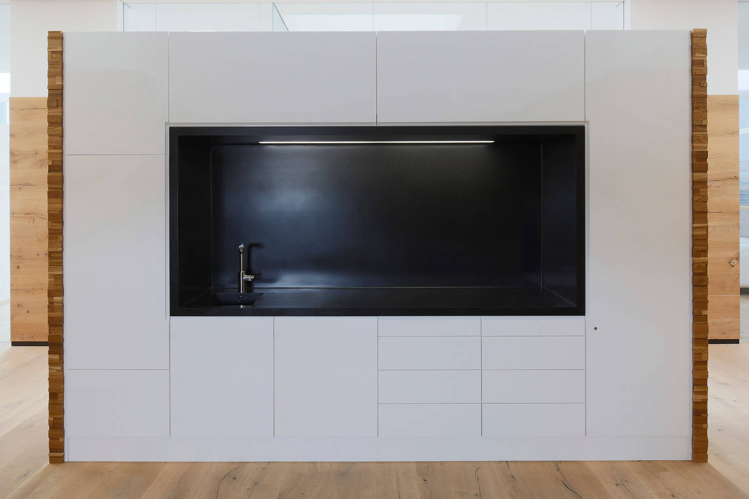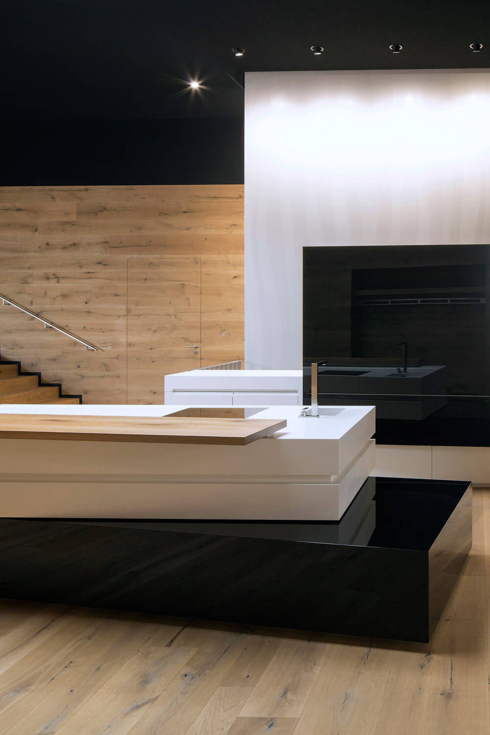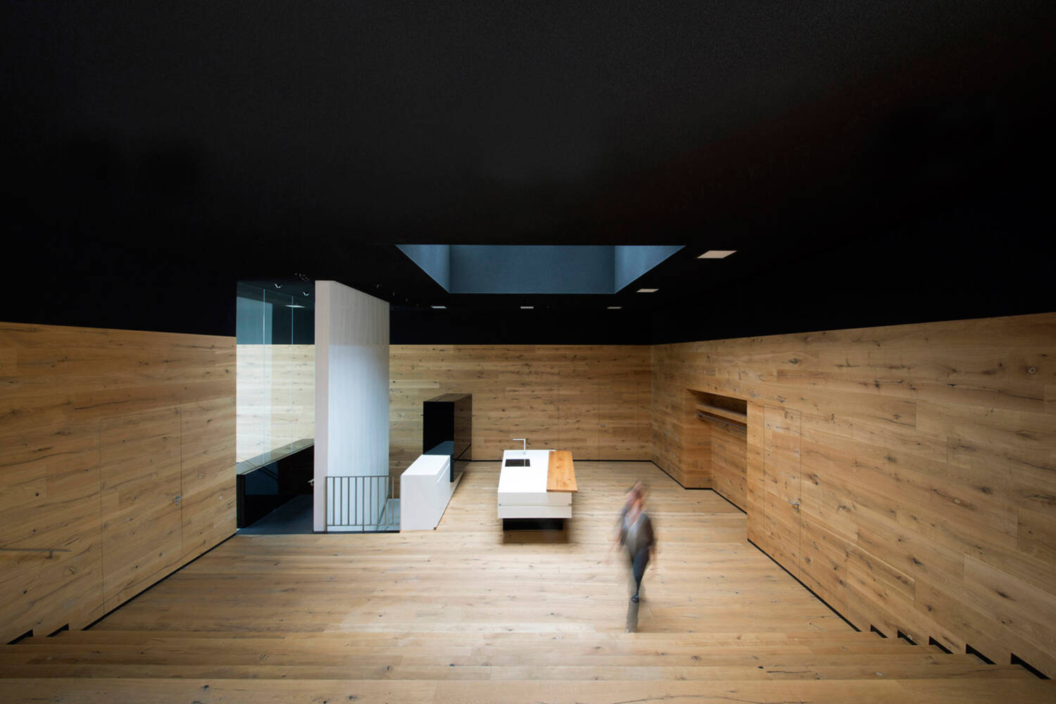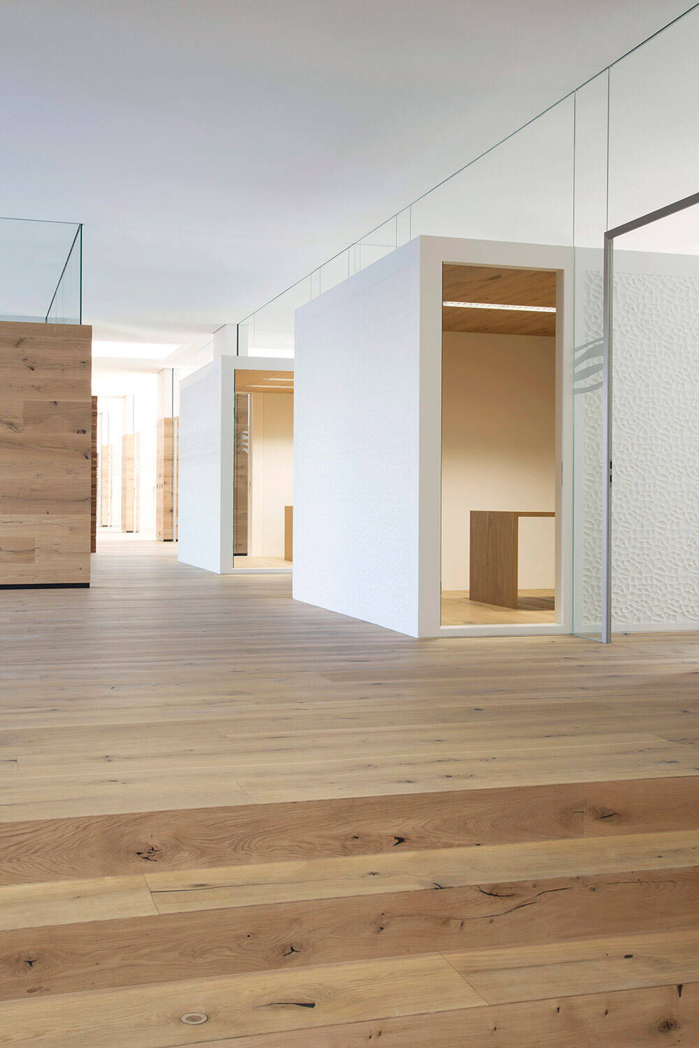 Gemäß der Philosophie des Unternehmens Tradition trifft Innovation erfolgt die Auswahl aller dominierenden Materialien diesem Prinzip; konzeptionell und gestalterisch übersetzt in Natur trifft Technik. In der Fläche wird Eiche in astreicher, rissiger Ausführung in Kontrast zu den Materialien Corian® und Parapan® gesetzt.