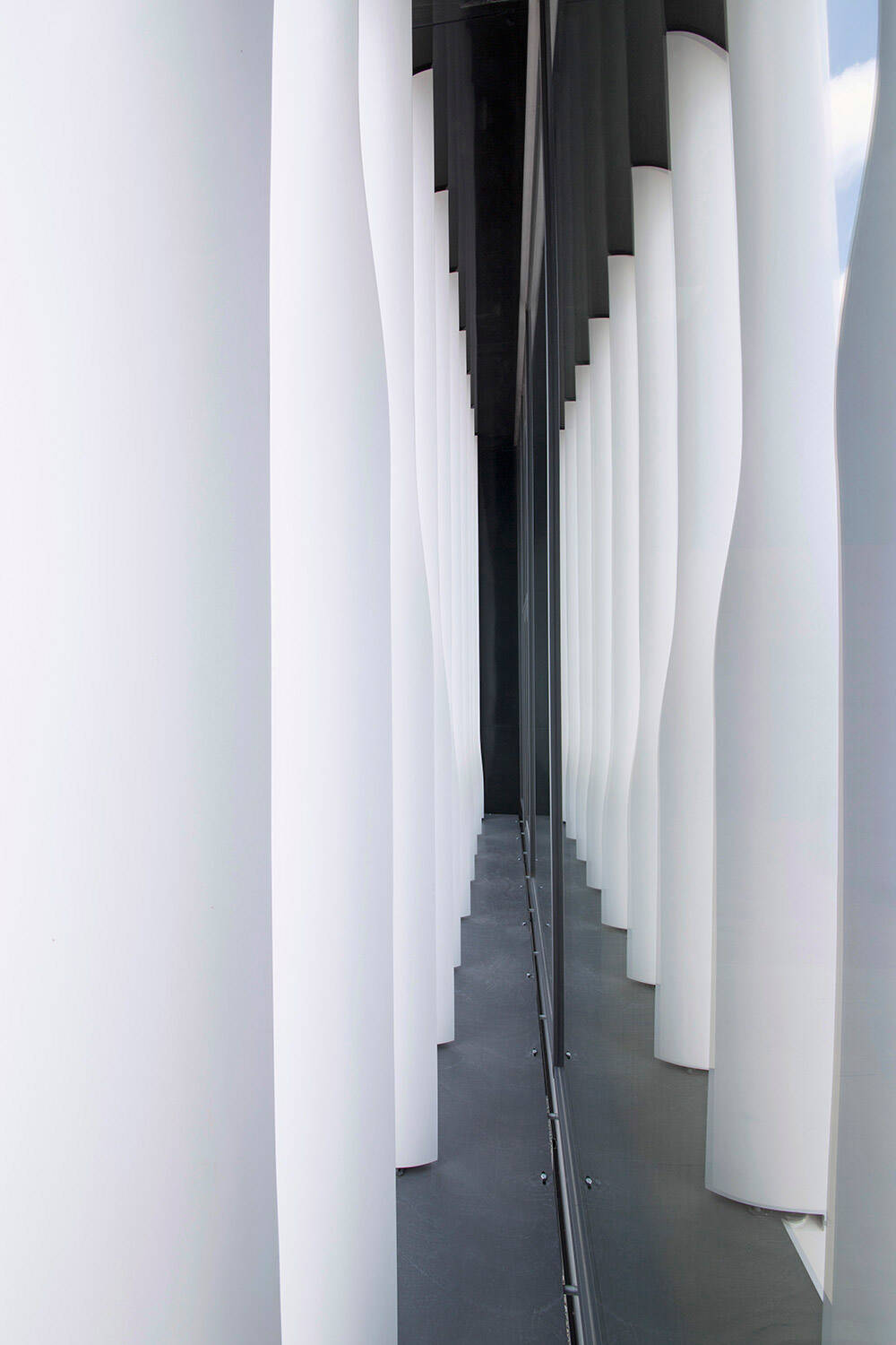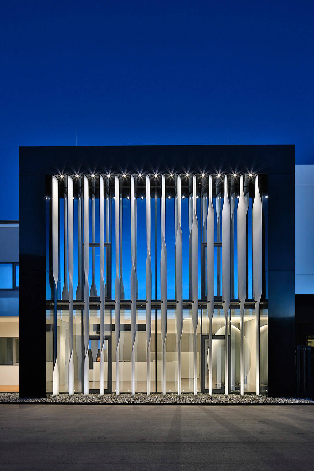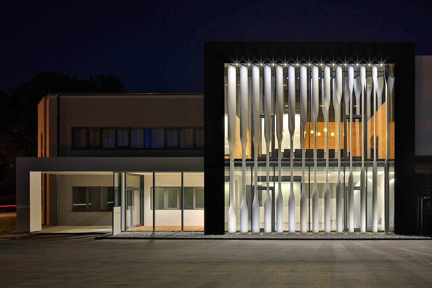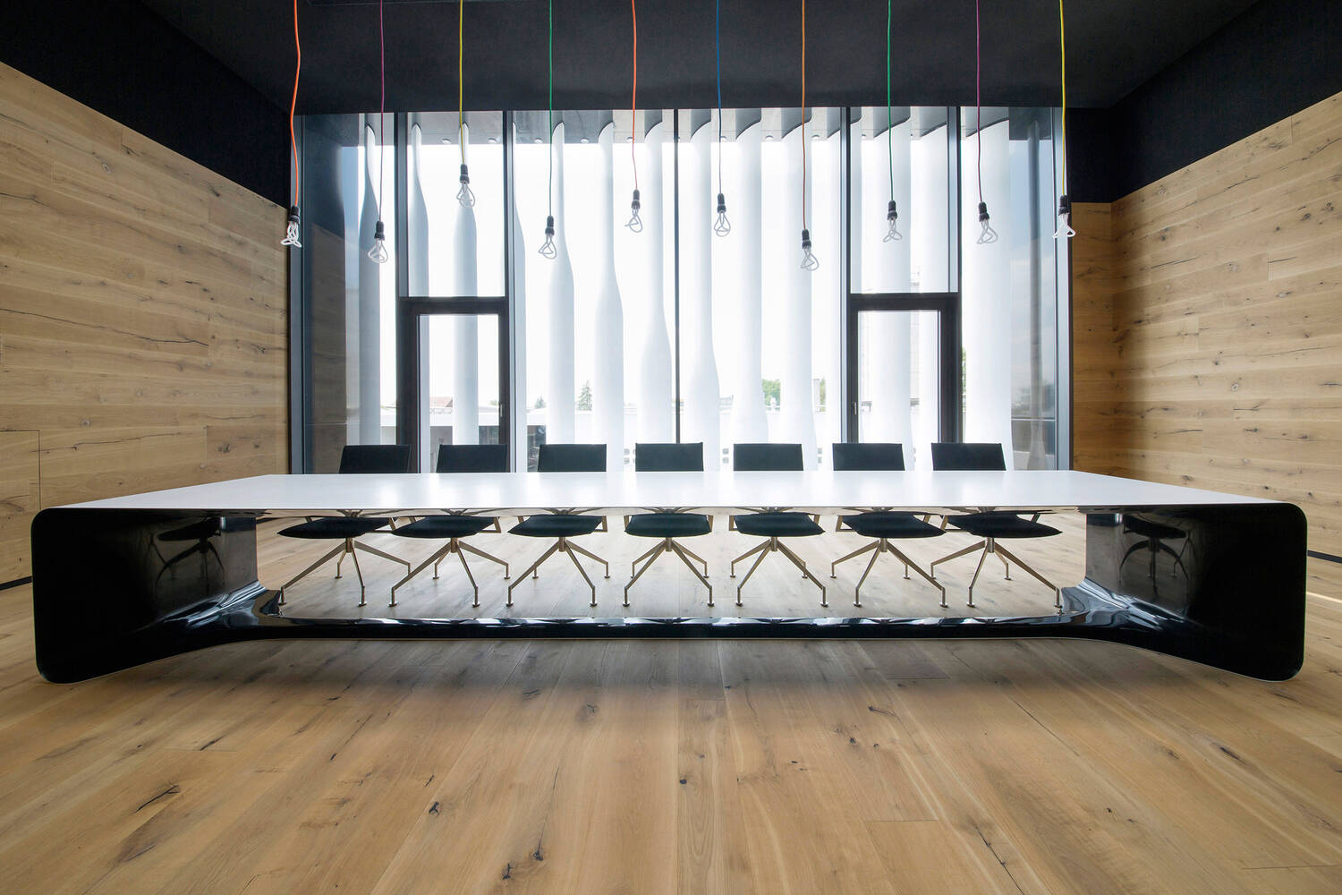 Gemäß der Philosophie des Unternehmens Tradition trifft Innovation erfolgt die Auswahl aller dominierenden Materialien diesem Prinzip; konzeptionell und gestalterisch übersetzt in Natur trifft Technik. In der Fläche wird Eiche in astreicher, rissiger Ausführung in Kontrast zu den Materialien Corian® und Parapan® gesetzt.