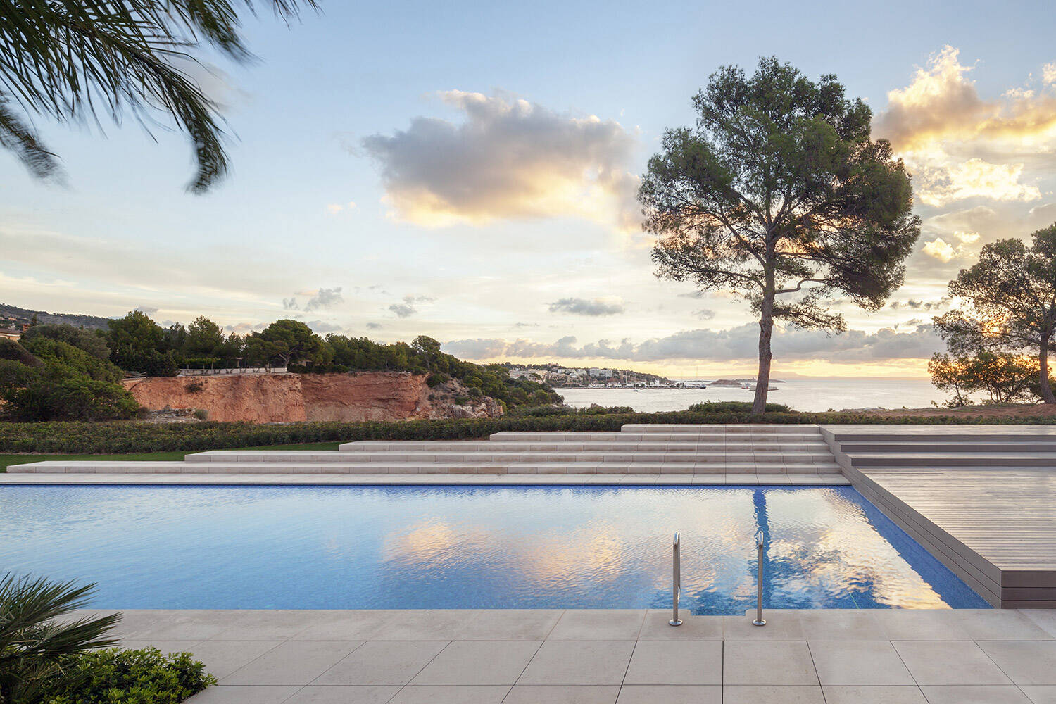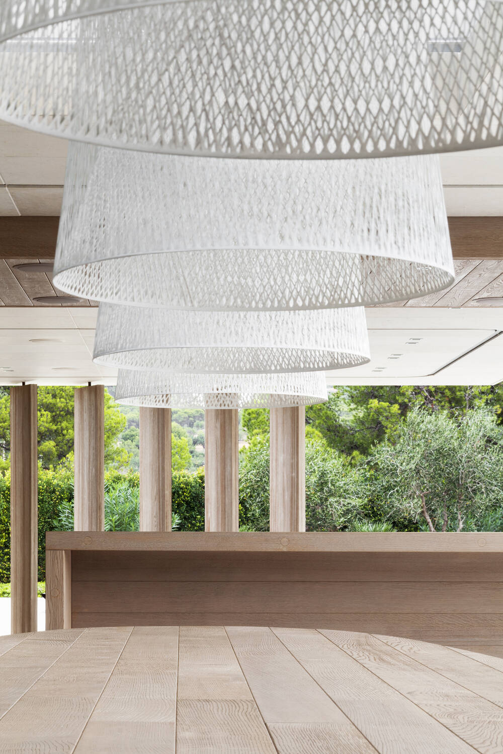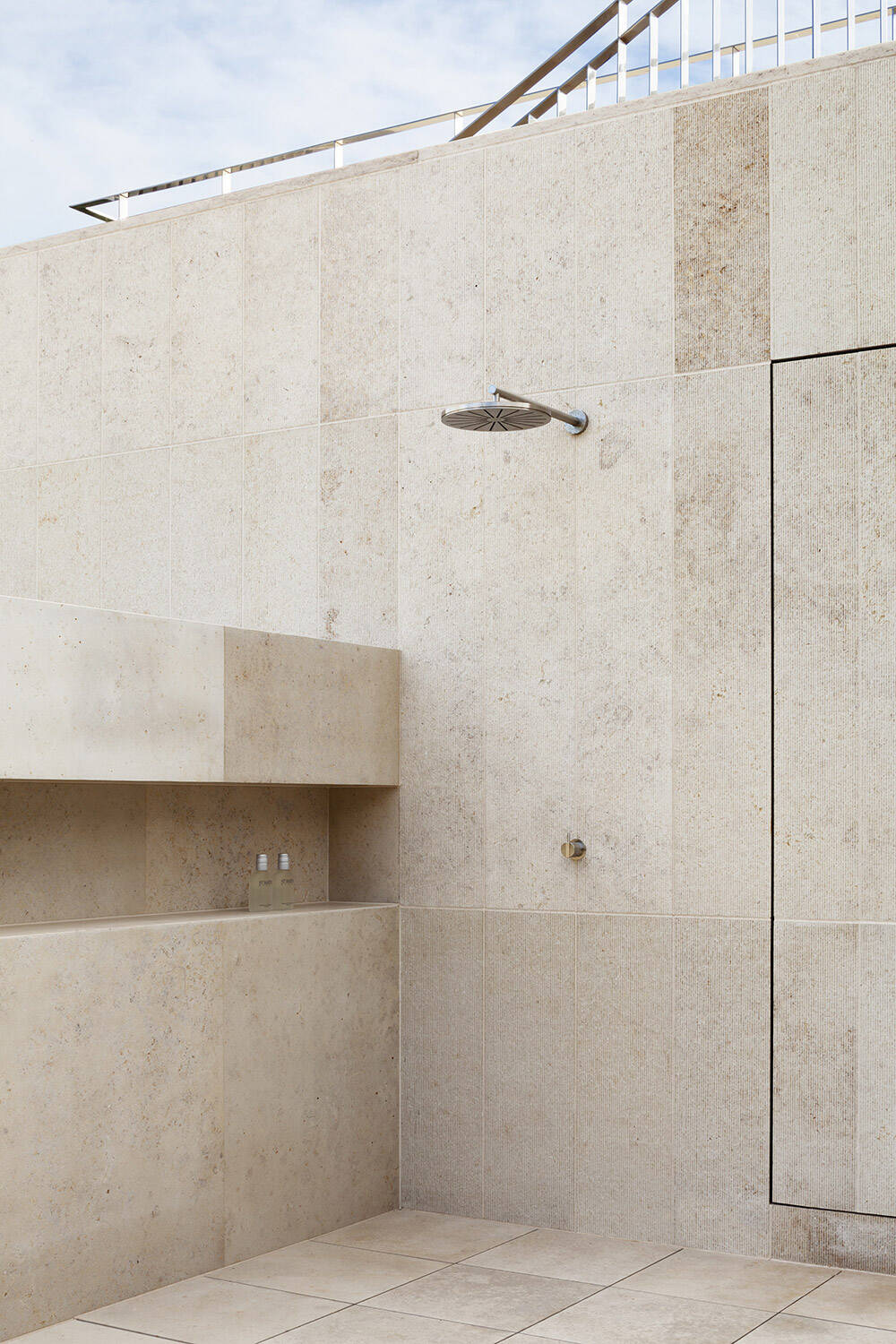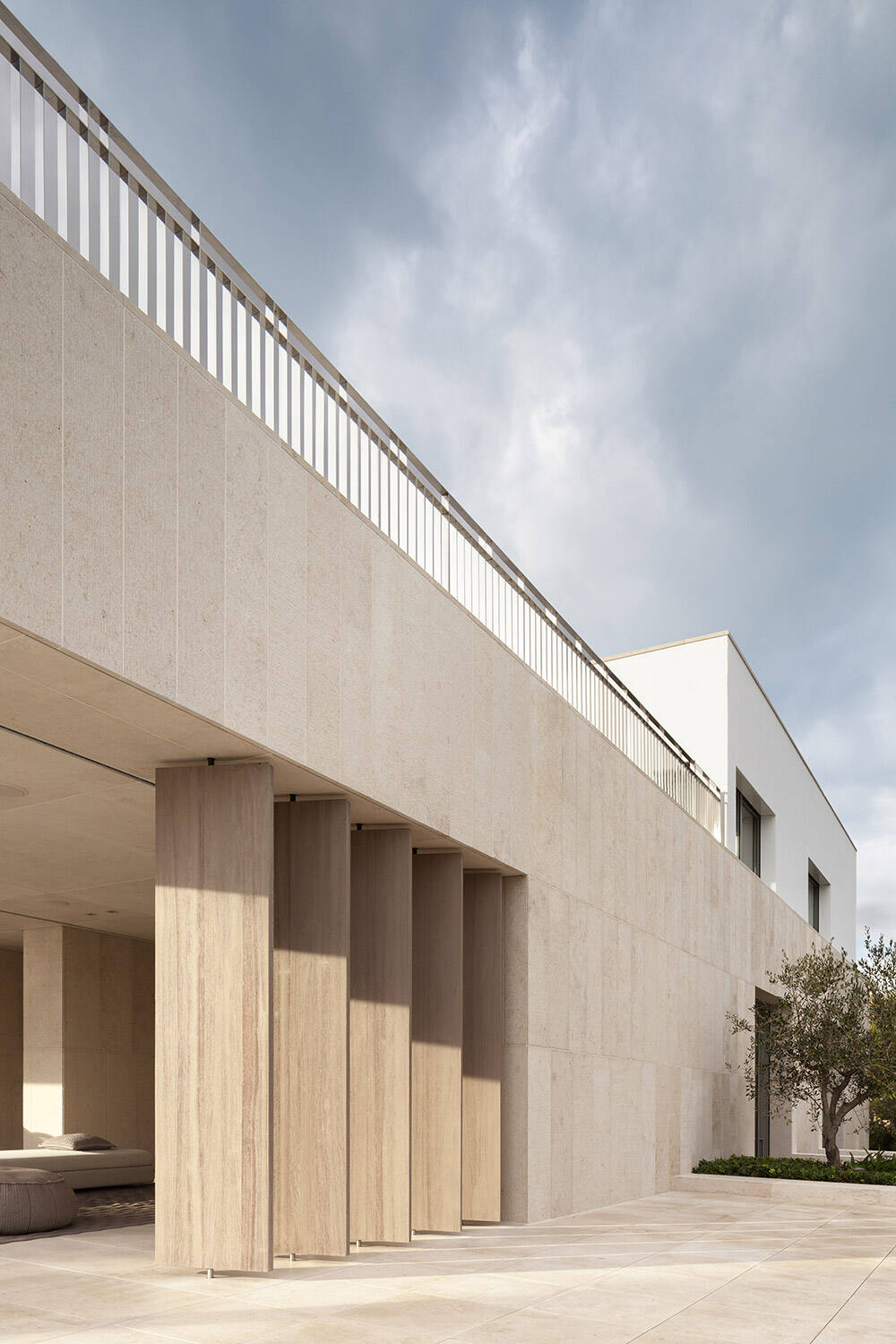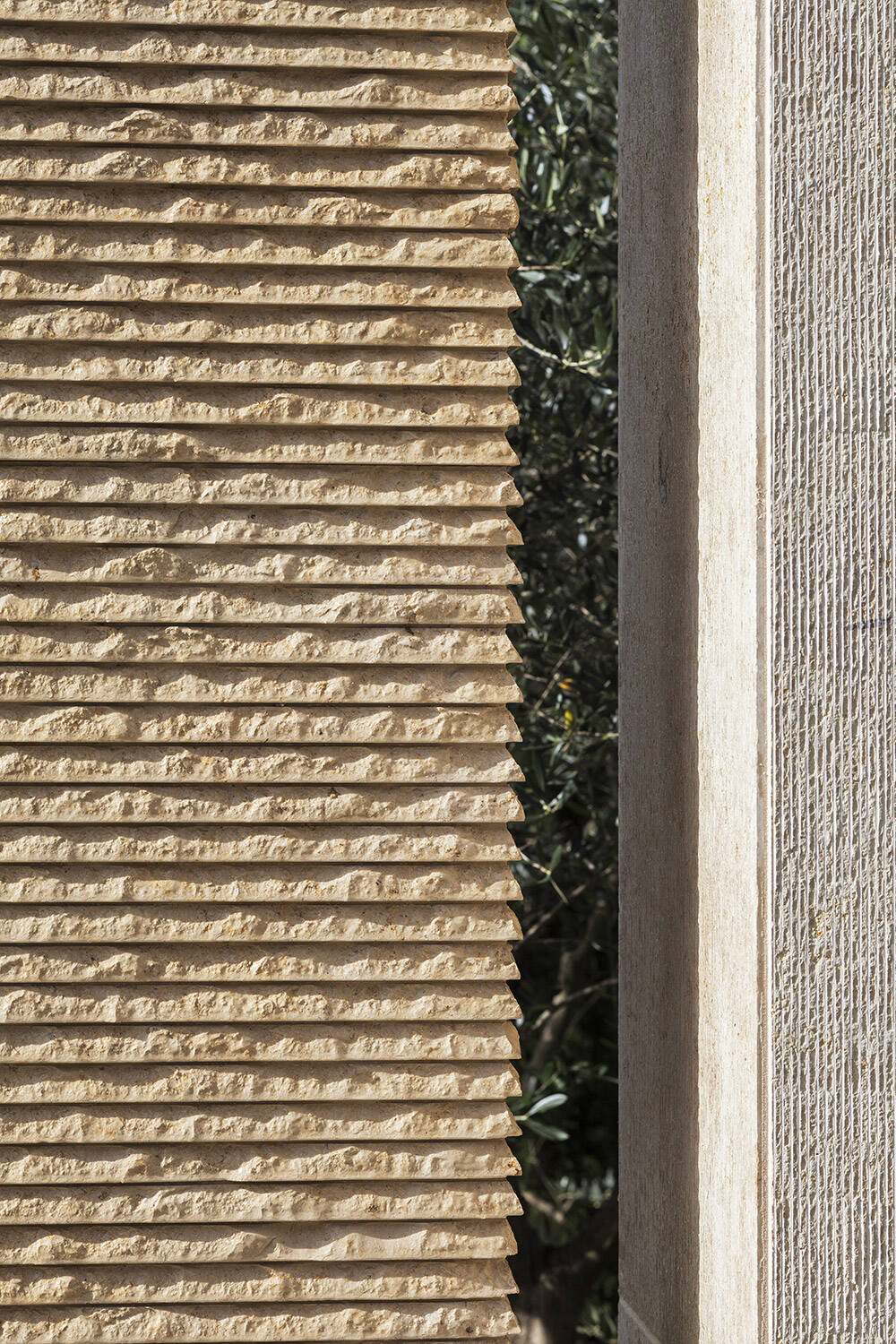 Bezieht sich das Farbspiel der Fassade auf die Nuancen und Schattierungen der Umgebung, so setzt sich das Volumen des Gebäudes insgesamt in seiner stringenten kubischen Ausformung von der schroffen Küste ab. Horizontal wie vertikal fügen sich die geschichteten Körper in das vorhandene Gelände und ergeben ein gleichwertiges gestaffeltes Nebeneinander. Auskragende Dachterrassen ermöglichen ungehinderte Blicke auf das Meer, ermöglichen gleichzeitig Rückzugsmöglichkeiten in großzügige, sonnengeschützte Bereiche.