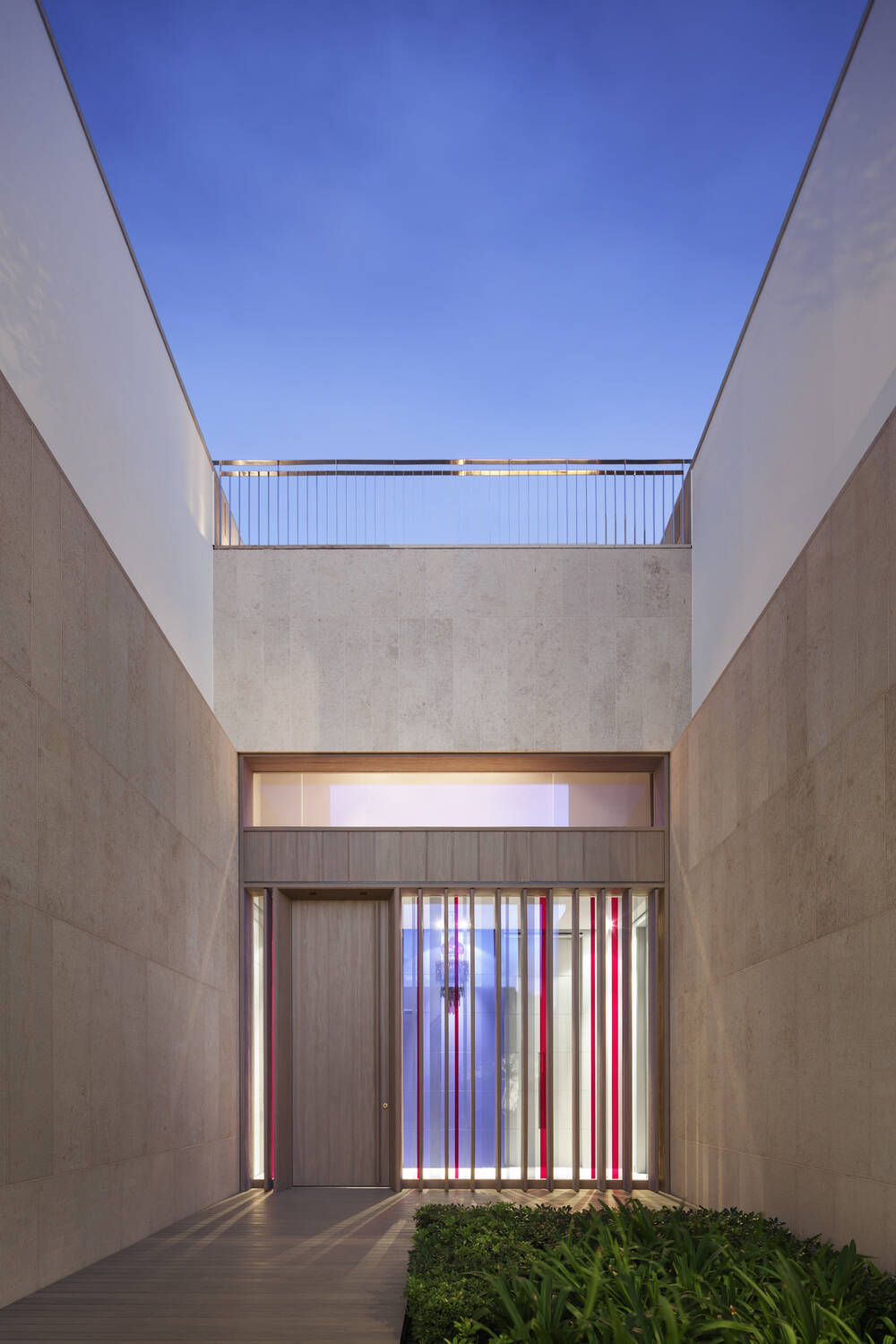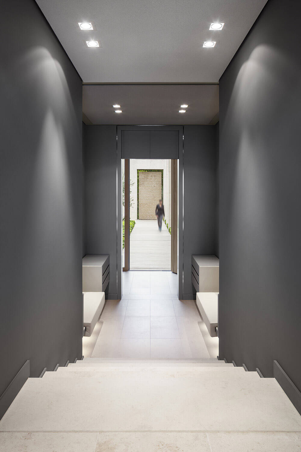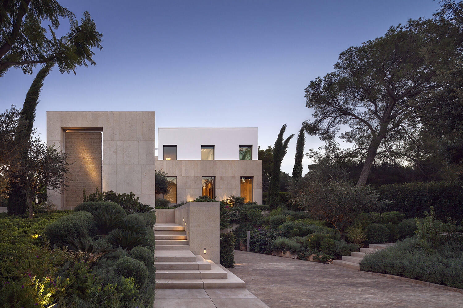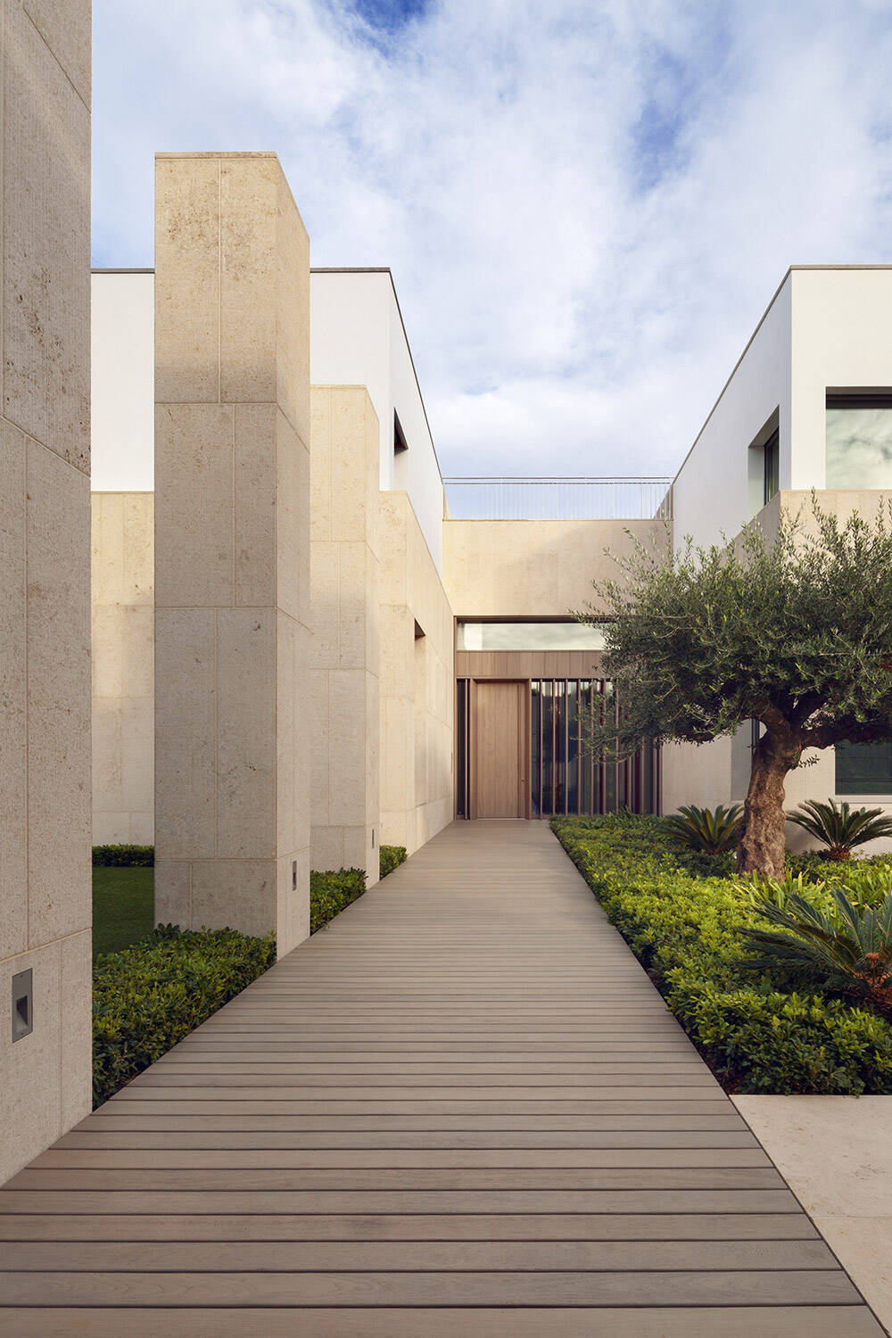 Bezieht sich das Farbspiel der Fassade auf die Nuancen und Schattierungen der Umgebung, so setzt sich das Volumen des Gebäudes insgesamt in seiner stringenten kubischen Ausformung von der schroffen Küste ab. Horizontal wie vertikal fügen sich die geschichteten Körper in das vorhandene Gelände und ergeben ein gleichwertiges gestaffeltes Nebeneinander. Auskragende Dachterrassen ermöglichen ungehinderte Blicke auf das Meer, ermöglichen gleichzeitig Rückzugsmöglichkeiten in großzügige, sonnengeschützte Bereiche.