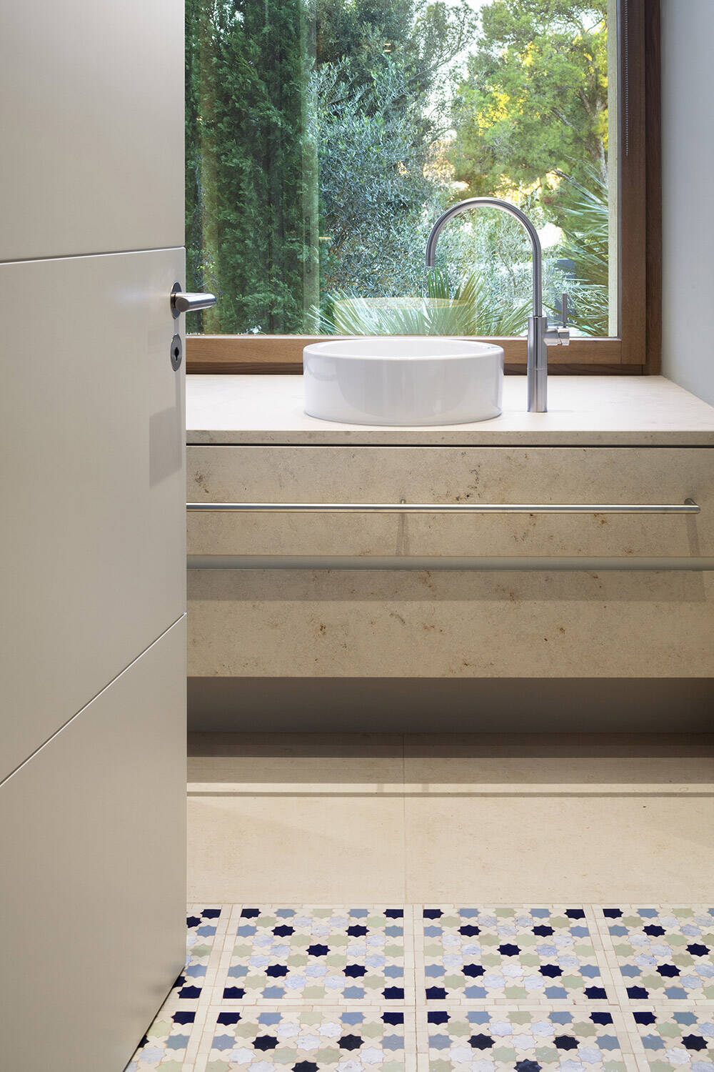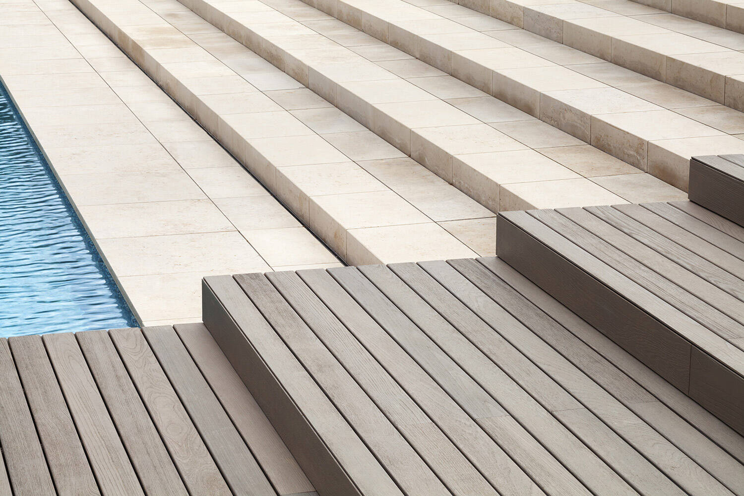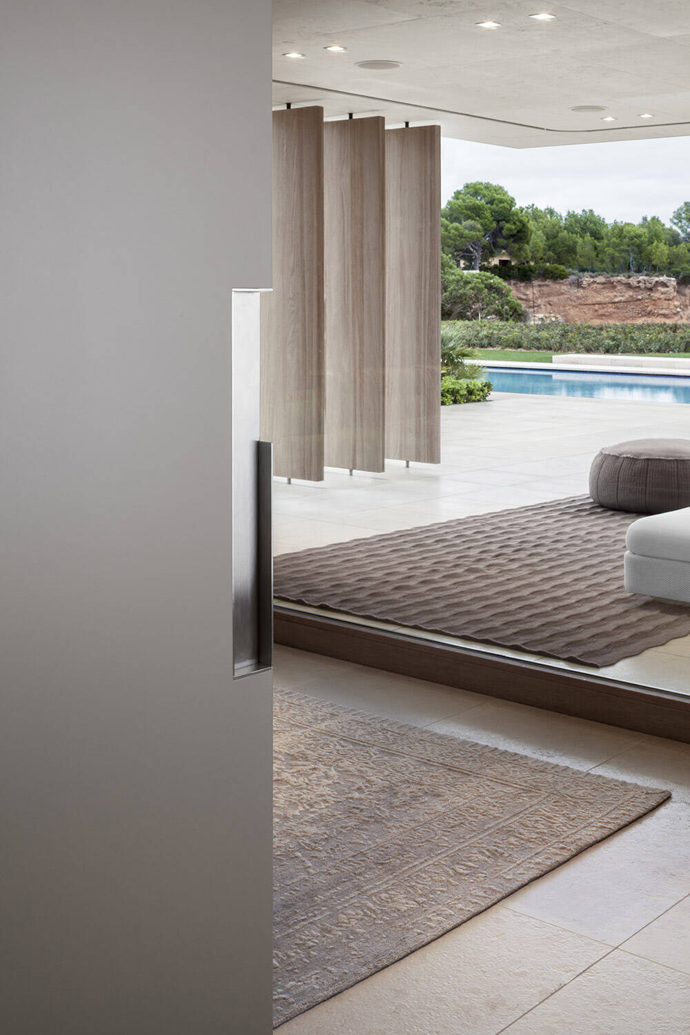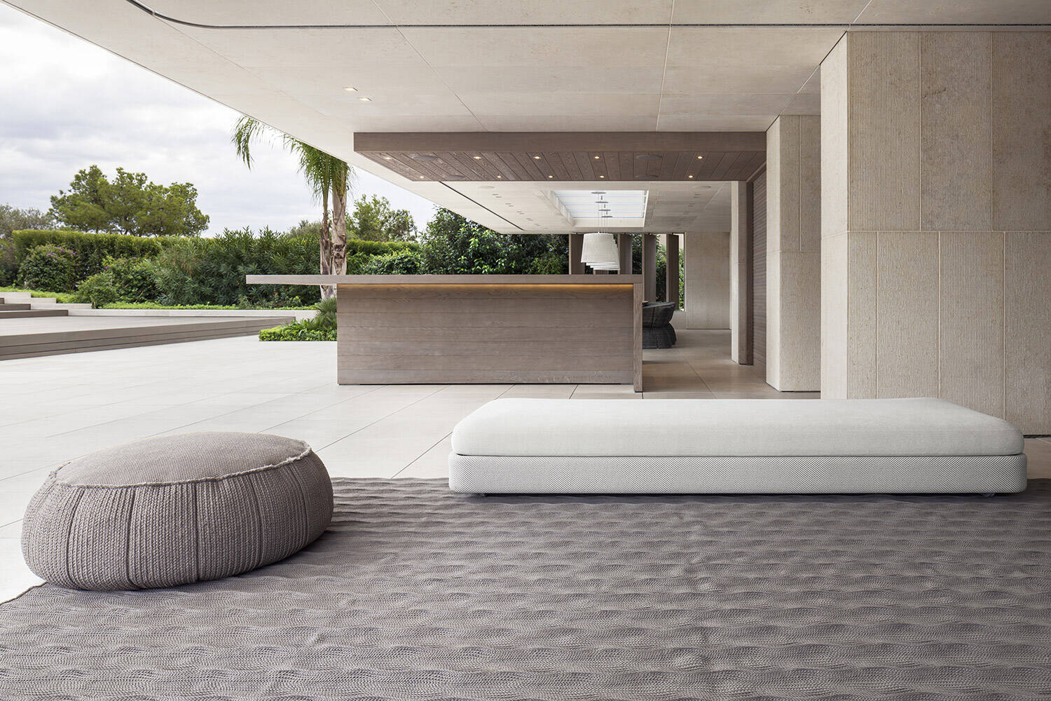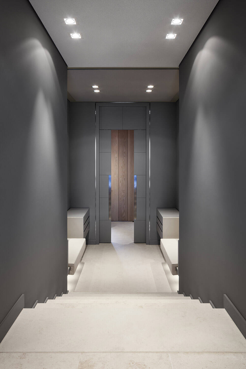 Bezieht sich das Farbspiel der Fassade auf die Nuancen und Schattierungen der Umgebung, so setzt sich das Volumen des Gebäudes insgesamt in seiner stringenten kubischen Ausformung von der schroffen Küste ab. Horizontal wie vertikal fügen sich die geschichteten Körper in das vorhandene Gelände und ergeben ein gleichwertiges gestaffeltes Nebeneinander. Auskragende Dachterrassen ermöglichen ungehinderte Blicke auf das Meer, ermöglichen gleichzeitig Rückzugsmöglichkeiten in großzügige, sonnengeschützte Bereiche.