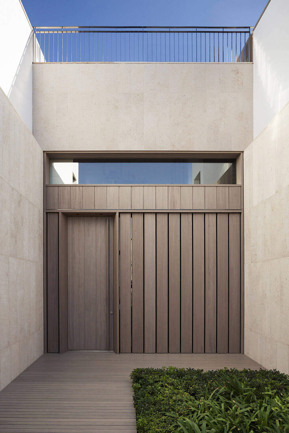 In der ersten Anmutung zeigt sich der Neubau zurückhaltend, offenbart weder Größe, noch Raumzusammenhänge des Inneren. Eine Wandscheibe, die sich proportional aus dem Gebäude heraus entwickelt und über Treppenstufen zu erreichen ist, markiert den Zugang und sorgt durch den Wechsel der Materialität von Naturstein zu Holz für den Übergang zwischen Innen- und Außenraum. Den Ausblick erahnend überbrückt man von der Straße bis zur Küstenkante eine Höhendifferenz von nahezu fünf Metern.