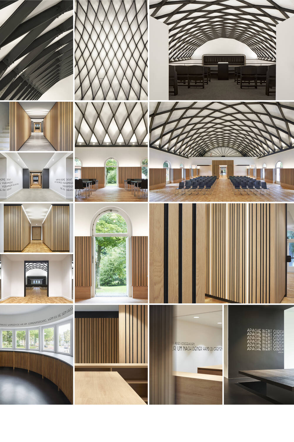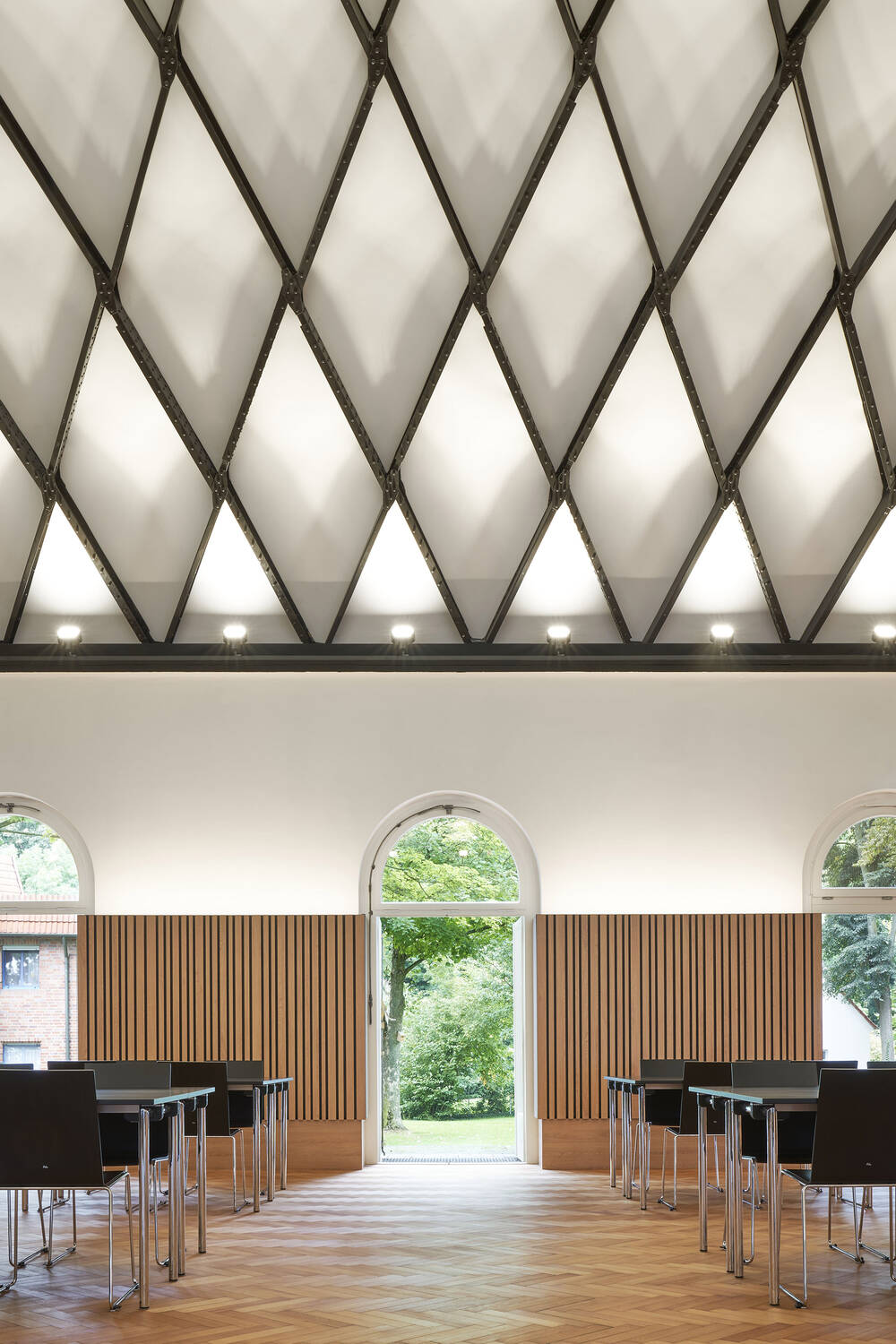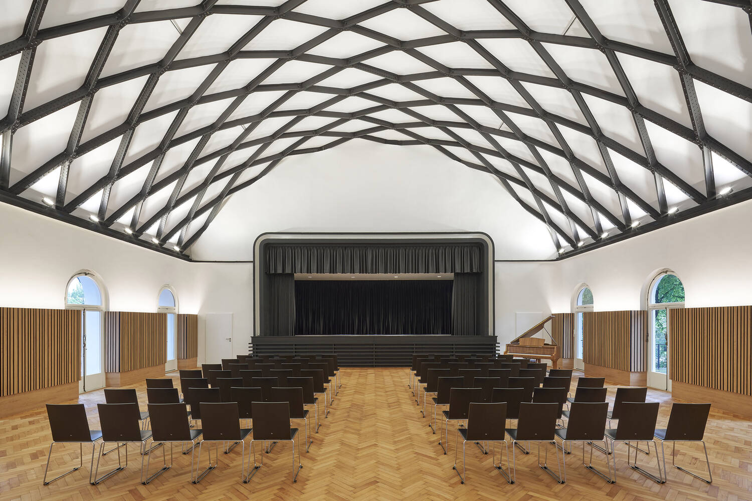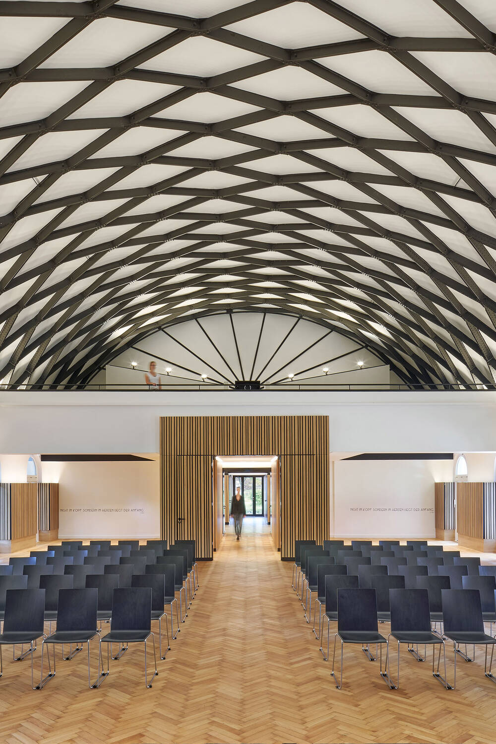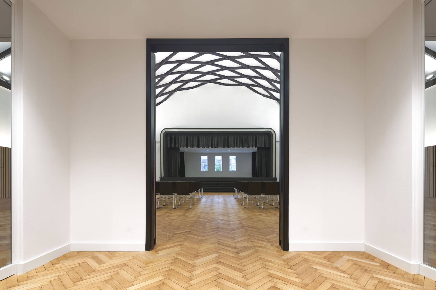 Im Rahmen der umfangreichen Sanierung des denkmalgeschützten Gemeindehauses wird die in Vergessenheit geratene Dachkonstruktion, ein ursprünglich sichtbares Rautennetz aus gekantetem Stahlblech, hinter diversen, mehrschichtigen Verbauungen entdeckt. Statisch ertüchtigt und instand gesetzt, wird es sichtbar inszeniert.