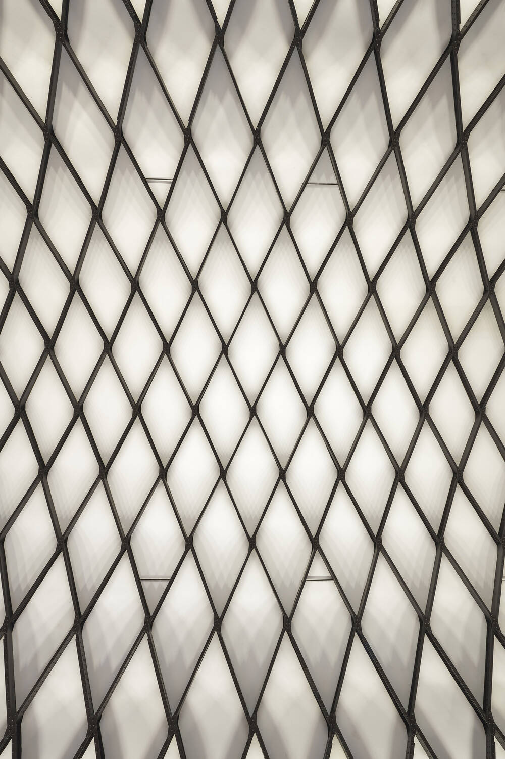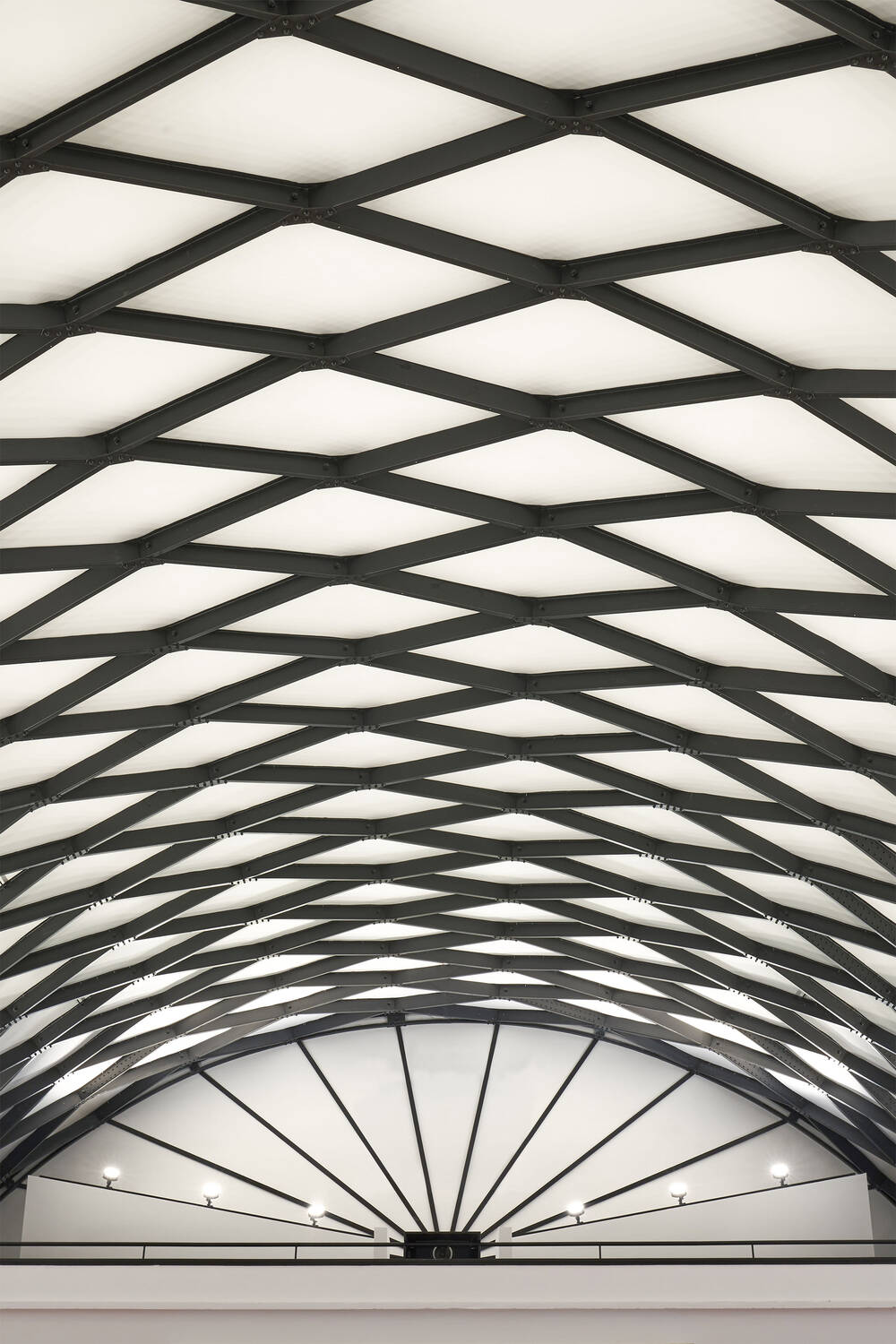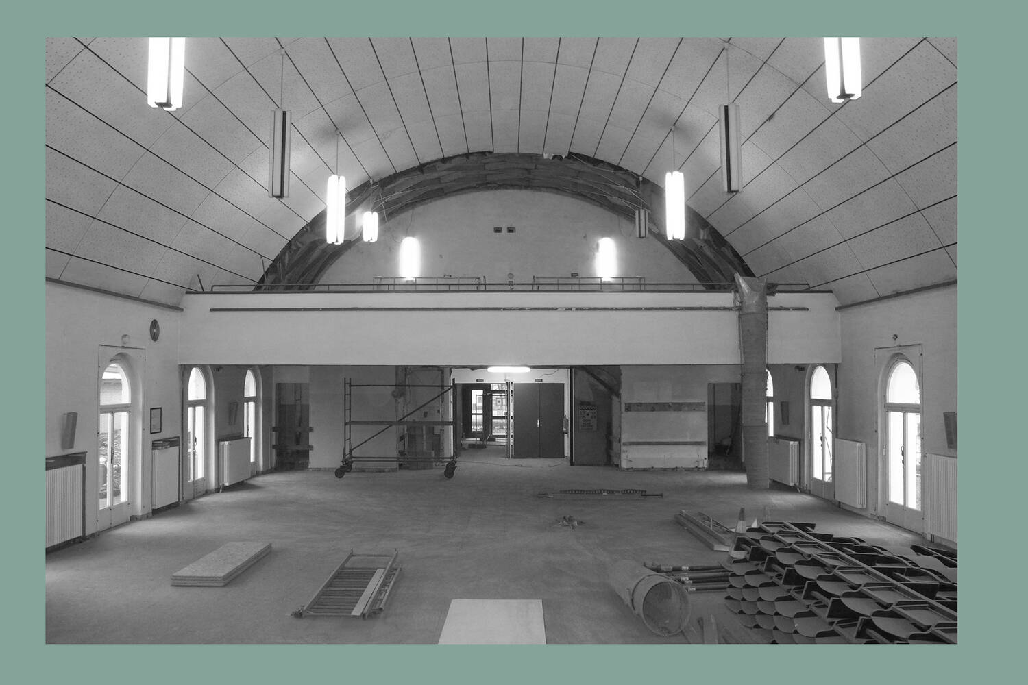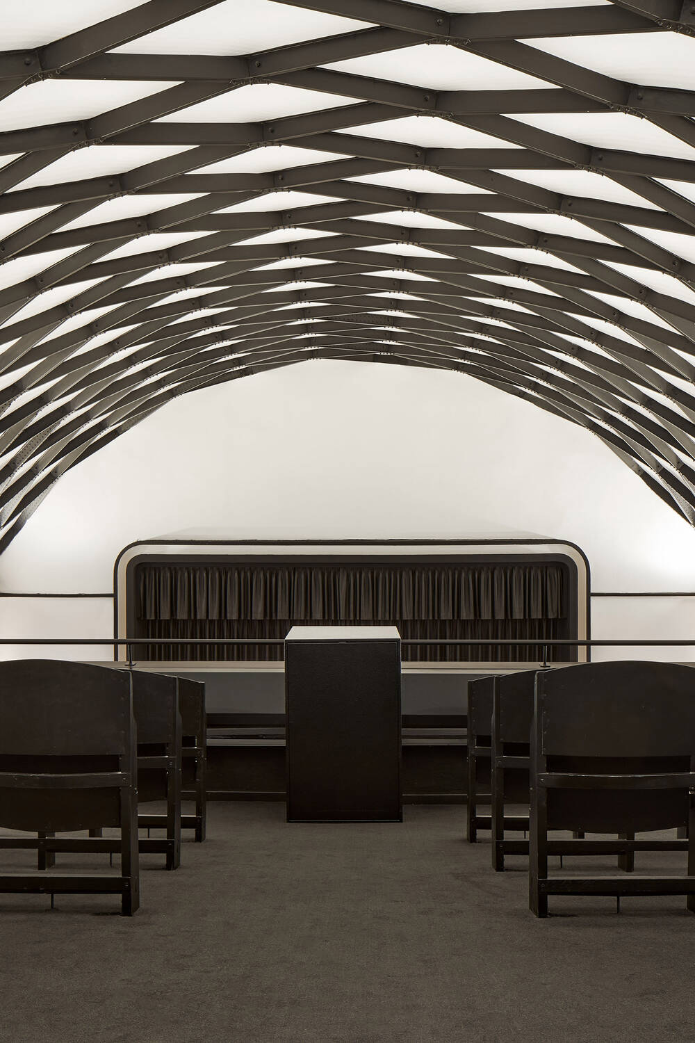 Im Rahmen der umfangreichen Sanierung des denkmalgeschützten Gemeindehauses wird die in Vergessenheit geratene Dachkonstruktion, ein ursprünglich sichtbares Rautennetz aus gekantetem Stahlblech, hinter diversen, mehrschichtigen Verbauungen entdeckt. Statisch ertüchtigt und instand gesetzt, wird es sichtbar inszeniert.