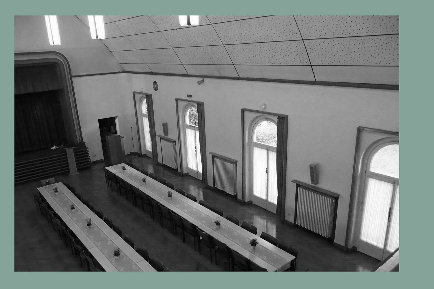 Das Erdgeschoss des Gemeindehauses gliedert sich in zwei Teilbereiche, die über eine längsseitige Hauptachse erschlossen werden. Eingang, Büroflächen, Kontakt- und Servicebereich bilden ein vorgesetztes Ensemble, das die Gemeindearbeit zentral zugänglich macht. Hier angegliedert, finden sich Gruppenräume sowie der Gemeindesaal. Als Hauptprotagonist und Herzstück des Gemeindelebens widmet er sich ganz der Gemeinschaft. Der Saal in seiner repräsentativen und einladenden Dimension behält sein Potenzial vielfältiger Nutzungen. Als eine ergänzende Raumdimension, wird die Saalempore im Obergeschoss durch die Neukonzeption reaktiviert und unabhängig erschließbar.
