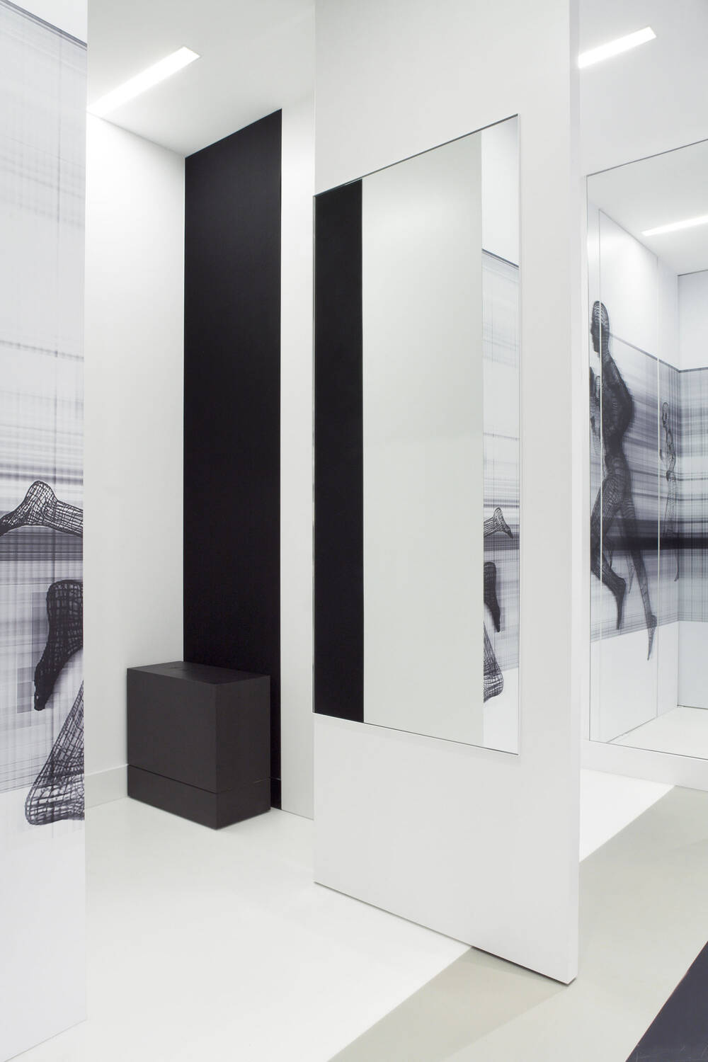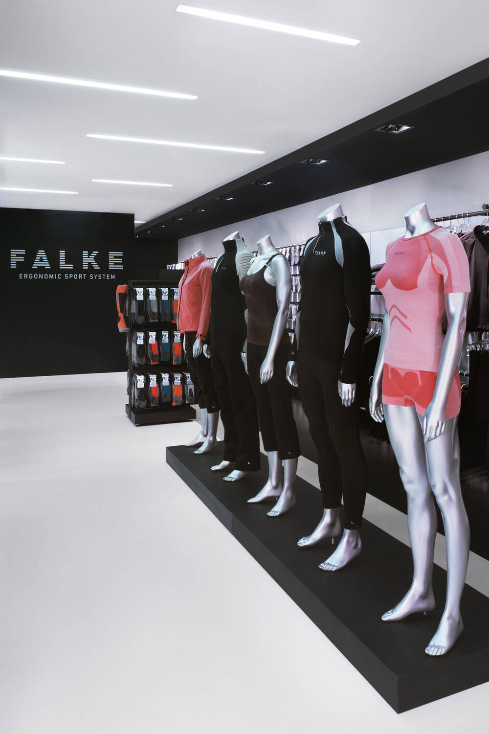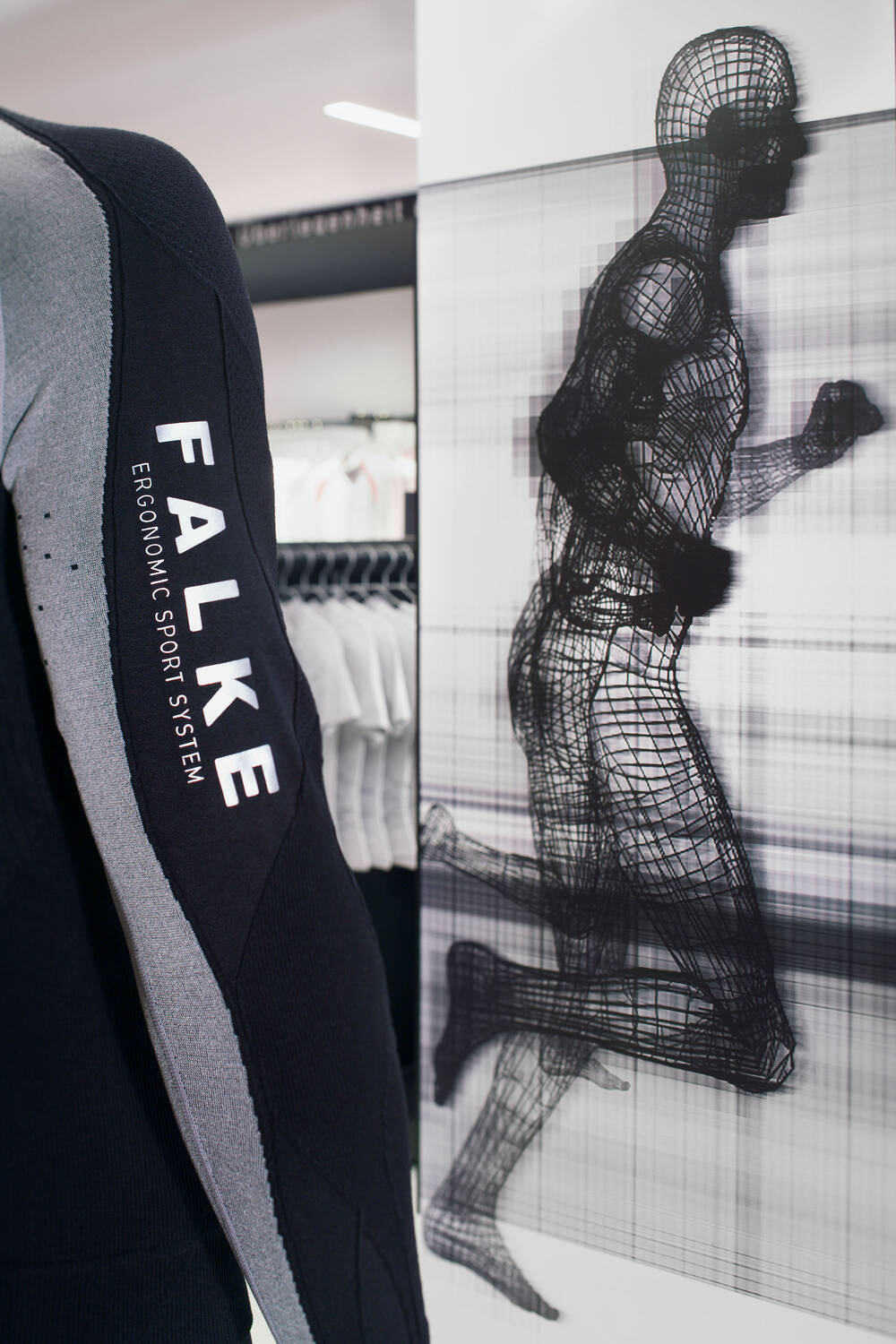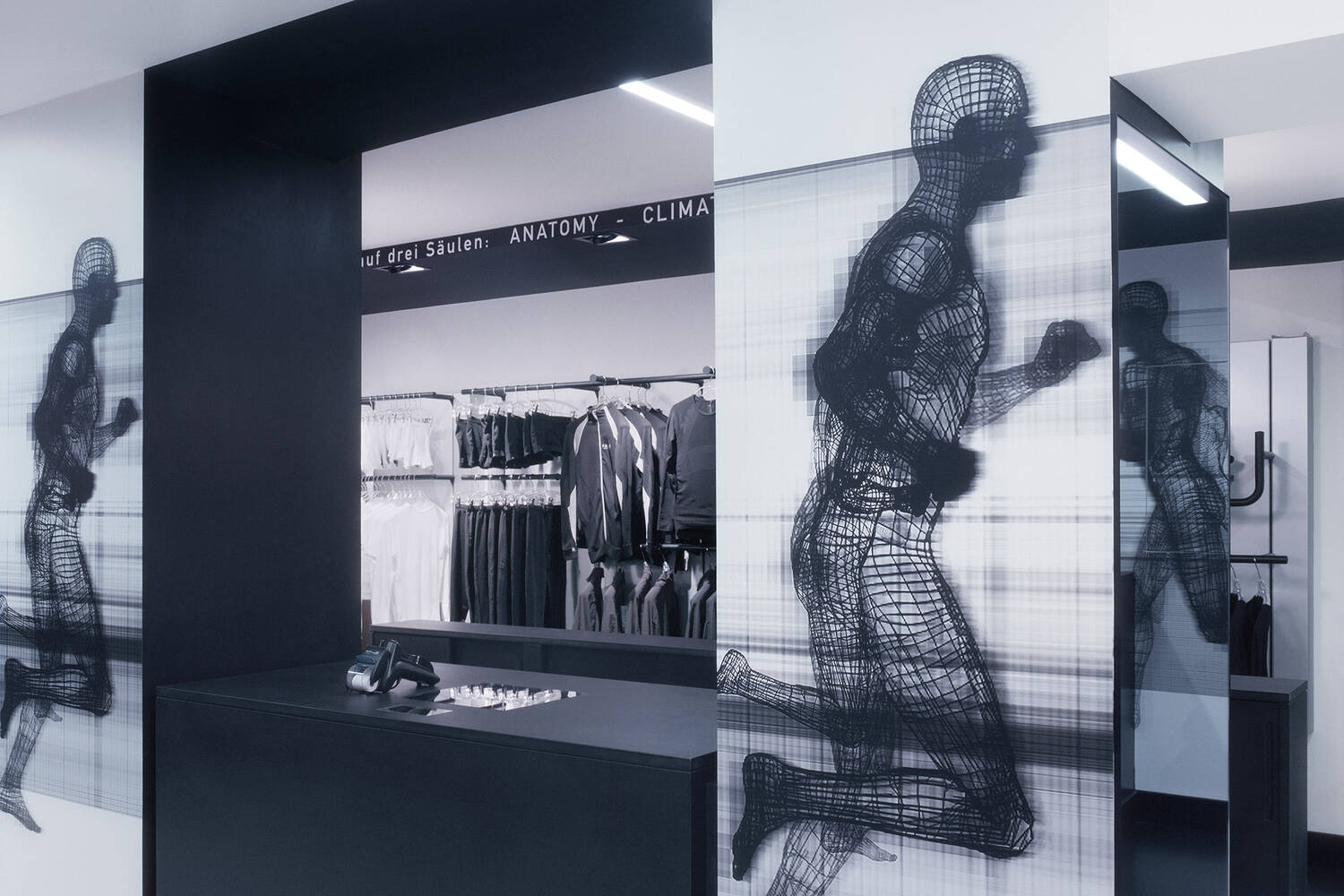 A clear, horizontal basic arrangement structures the surface. A motif-covered wall forms the center. This serves as an emotional anchor on the one hand and as a background for the product presentation on the other. Between the plinth and the ceiling, a linear wall design with changeable, integrative visuals is presented in combination with flowing product carriers - following a direction, a line, a path, a way, a street.